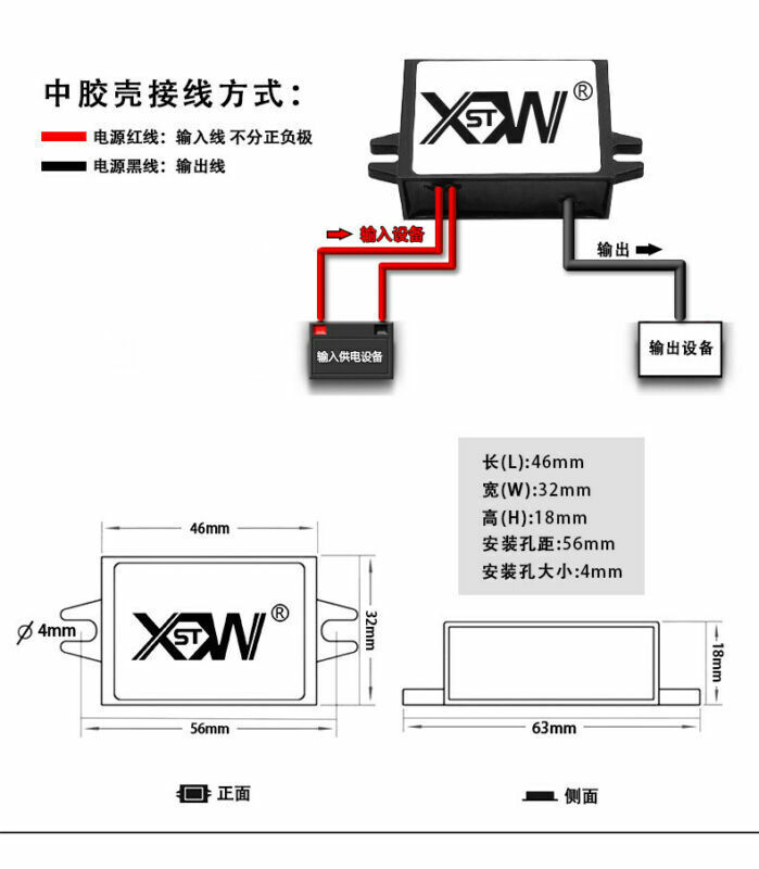 Model: XW-AC24-DC5-15W-USB Module nature: non-isolated BUCK Input voltage: AC 24V (wide voltage 16V~28V) Output voltage: DC 5V Output current: 3A Output power: 15W Conversion efficiency: greater than 93% Ripple: 20MV Low power consumption: 1.4MA Working temperature: -40 ° C ~ +85 ° C Protection function: over current, over voltage, over temperature and short circuit protection Installation line length: Enter two red lines with a length of 13-14 and an output black line with a head length of 33 cm. Outer size: 46* 32*18mm Mounting hole distance: 56mm Mounting hole size: 4mm Product weight: 58g / piece Waterproof rating :iP67
