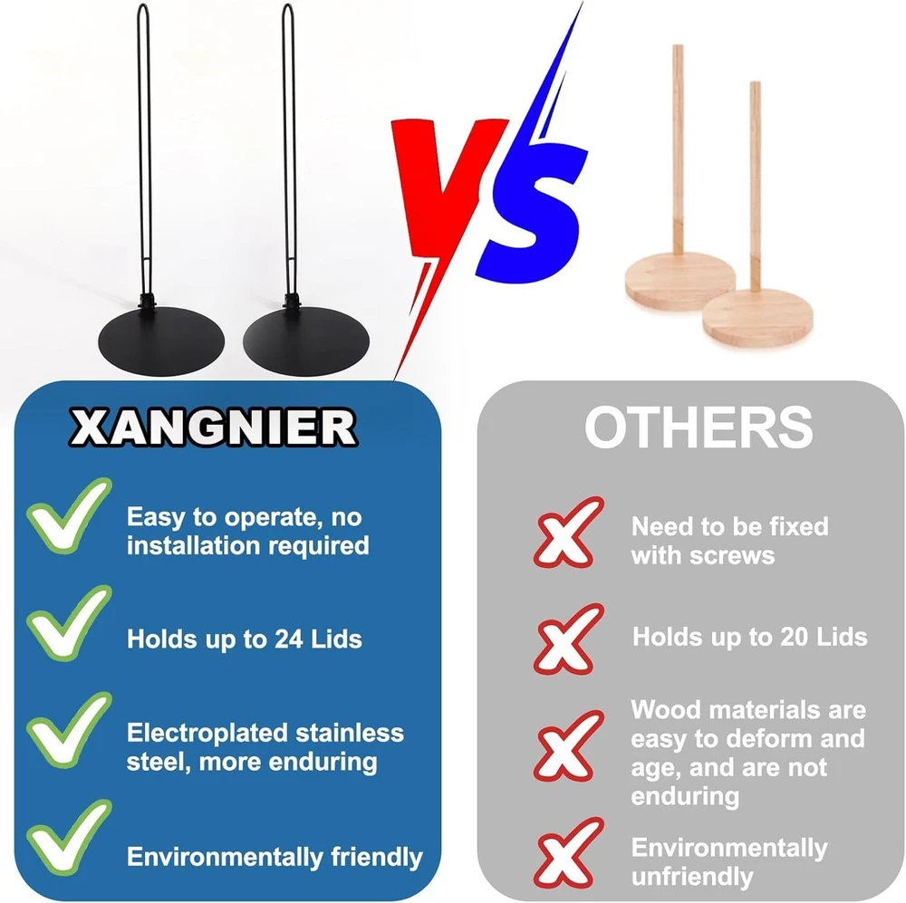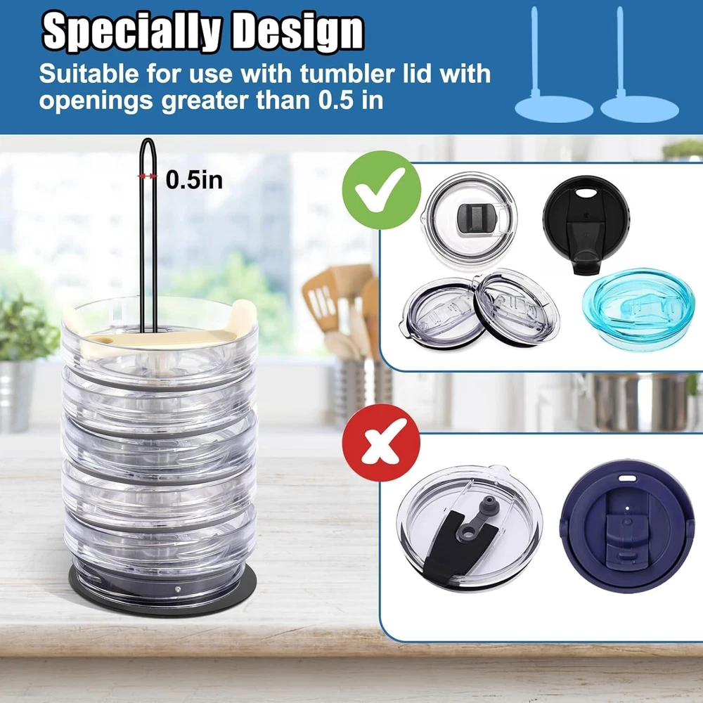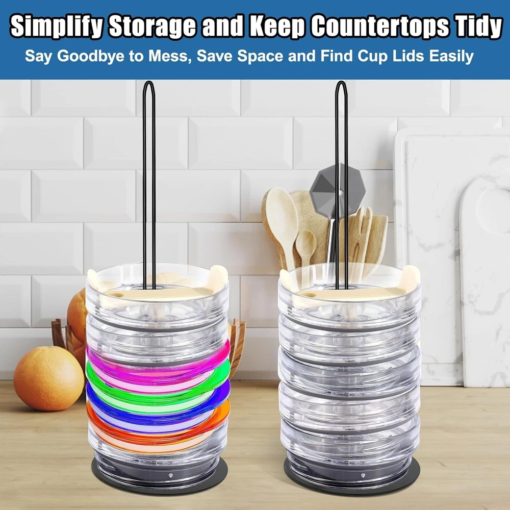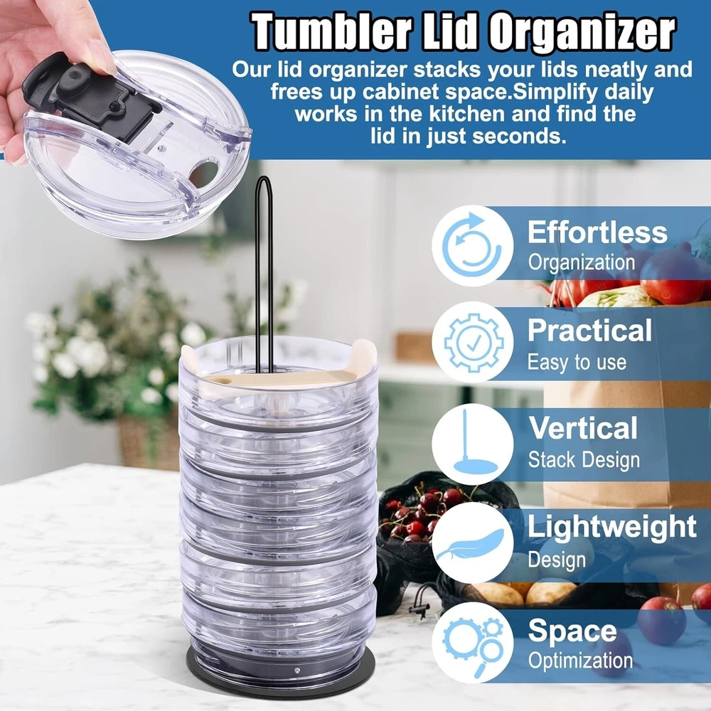 ### Tumbler Lid Holder **Efficient Organization:** Our unique tumbler lid organizer is designed to streamline the organization of your cup lids, preventing clutter and misplacement. It keeps your cup lids from scattering, maintaining tidy kitchen cabinets, and saves you time and energy by allowing you to quickly find your lids every time. **Compatibility:** Carefully crafted to fit most cup lids, our wire holder is not suitable for straw lids with small openings. Compatible with YETI, Stanley, RTIC, Hydro Flask, Starbucks, Tervis, Ozark Trail, Simple Modern, Reduce, SUNWILL, Meoky, KISSKIND, IRON °FLASK, BJPKPK, Hydrapeak, Serborni, MaxBase, Ello, Klean Kanteen, and Owala tumbler lids with openings larger than 0.5 inches. **Extended Design, Holds up to 12 Cup Lids:** Our stacking tumbler lid holder features an extended metal shelf, upgraded from 20cm to 30cm, capable of holding up to 12 cup lids. No more worrying about excessive cup lids piling up or lacking storage space—everything will be in order, making your storage efficient, convenient, and comfortable. **Space-Saving:** Not only does our stacking tumbler lid holder keep kitchen countertops neat and organized, but it also serves as a striking piece of home decor. Efficiently organize cup lids, save time searching, enhance aesthetics, and enjoy easy cleaning. Simplify your life, add style, and make home organization easier and more efficient. You will love it! **High-Quality Material, Reusable for Years:** Unlike other tumbler lid organizers, our cup lid holder is made from a one-piece electroplating process, requiring no screws or manual fixing. It is durable, resistant to damage and deformation, and can be reused for years. Let our metal cup lid organizer become a standout feature in your home, providing you with a unique storage experience.