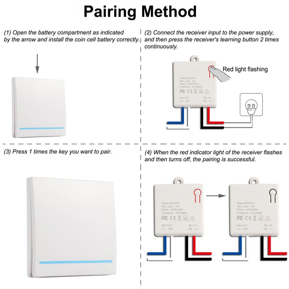 You may also like 8 IN 1 Metal Craft Chinese Ring Puzzle IQ Brain Teaser Kid Adult Educational Toy 10.99 USD 4Pack Durable Fuel Line Tube Hose For Husqvarna 61 66 162 181 266 268 272 281 9.99 USD Pneumatic Foot Pedal Valve FV-320 Momentary 3 Way 2 Position 1/4"PT Threaded 23.99 USD 5V 4-Pin Sunglasses USB Charger Charging Cable For Bose Frames Alto/Rondo/Tenor 11.99 USD 10x Hall Effect Joystick 3D Analog Stick Module For PS5 Dualsense Controller 17.59 USD 3.69 USD 10Pack Plastic+HSS 360° Deburring Tool Steel HSS Rotary Deburr Trimming Handle 10.69 USD Product Description Features: 1. Relocate Or Add Wall Switches Anywhere Without Wiring: Wireless Light Switch And Receiver Kit Eliminates The Need For In-Wall Wiring; Easily Remote Control Your Lights Without Altering The Existing System; No Need To Tear Down Walls Or Use Wifi. Ideal For Those With Mobility Challenges 2. Simple Installation With Neutral Wire Required: Install The Relay Receiver Between The Power Source And Lamps; Compact Receiver Fits In Control Boxes Like Electrical Junction Boxes; 3. Use Multiple Sets In A Room Without Interference: Wireless Light Switch Kit Uses Rolling/Dynamic Codes To Prevent Interference; Allows Multiple Kits In The Same House To Work Independently; Compatible With Most Lamps And Bulbs 4. Up To 25m Strong Rf Signal In Open Area: Remote Light Switch Kit With A Strong Rf Signal Works Through Walls And Doors; Ideal For Use In Lofts, Attics, Stairwells, Basements, Garages, And More Pairing Method: 1. Open The Battery Compartment As Indicated By Arrow And Install The Coin cell Battery Corectly. 2. Connect The Receiver Input To The Power Supply, Then Press The Receiver' S Learning Button 2 Times Continuously. 3. Press 1 Times The Remote Panel Switch Key You Want To Pair. 4. When The Red Indicator Light Of The Receiver Flashes And Then Turns Off, The Pairing Is Successful. Reset: Press The Learning Button (On The Receiver) 8 Times. The Existing Data Will Be Deleted Succeed. Specifications: Working Voltage: AC 90V~250V Max Current: 10A Max Load Power: Resistive Load: 2200W(AC220V) Incandescent Lamp: 2200W(AC220V) Inductive Load: 500W (AC220V) Capacitive Load: 200W (AC220V) Energy-Saving Lamp: 300W(AC220V) Rf Frequency: 433mhz Working Temperature: -10℃~55℃ Receiving Sensitivity: >108 db Support Encoding: 1527 Leaning Code Rf Operating Mode: ASK Superheterodyne Wireless Reception Receiving Range: 25 Meters(Open Space) Switch Battery: Cr2032 Coin Cell Battery (Not Include) Package Included: 1* 433mhz Receiver Module 1* Switch About Us Payment Shipping Returns Contact Us Welcome to our store! Our aim is to offer our clients items with high quality and fast delivery, also our price will be reasonable. We supply many products including video game, health & beauty, phone accessories, computers accessories, camera & camcorder,car accessories, games, toys & hobbies, jewelry, antique & craftwork. Excellent customer service and a reliable credit standing is our tenet. We accept all verified payments from ebay. Orders will be shipped after receiving cleared payment. We ship most of our orders within 24 hours, and may up to 48 hours. If you want faster shipping way. Please contact us before making payment. Sometimes due to problems with our transportation company system, your shipping information may be delayed to update. We recommend that you try again after 3-4 days. If you still haven't checked the shipping information, you can contact us by ebay message. Always believe we can figure things out with communication, if it comes to return, the pacakge must be intact and the same as you receive. If you have any questions, please feel free to email our service specialists 24 Hours a Day, 7 Days a Week. We will reply you ASAP. Return/refund is accepted within 30 days after the buyer receives the item. NO exchange will be accepted after 30 days from the date when the item is received. Please contact us first before returning your product!!! If you have any questions, our Customer Service staffs welcome you to email us. We strive to answer all questions and resolve any problems as quickly as possible. We care about our valued customers, and will always try to help you. So if you have any problems, You can contact us 7*24, we will reply at the first time. About Us Welcome to our store! Our aim is to offer our clients items with high quality and fast delivery, also our price will be reasonable. We supply many products including video game, health & beauty, phone accessories, computers accessories, camera & camcorder,car accessories, games, toys & hobbies, jewelry, antique & craftwork. Excellent customer service and a reliable credit standing is our tenet. Payment We accept all verified payments from ebay. Orders will be shipped after receiving cleared payment. Shipping We ship most of our orders within 24 hours, and may up to 48 hours. If you want faster shipping way. Please contact us before making payment. Sometimes due to problems with our transportation company system, your shipping information may be delayed to update. We recommend that you try again after 3-4 days. If you still haven't checked the shipping information, you can contact us by ebay message. Returns Always believe we can figure things out with communication, if it comes to return, the pacakge must be intact and the same as you receive. If you have any questions, please feel free to email our service specialists 24 Hours a Day, 7 Days a Week. We will reply you ASAP. Return/refund is accepted within 30 days after the buyer receives the item. NO exchange will be accepted after 30 days from the date when the item is received. Please contact us first before returning your product!!! Contact Us If you have any questions, our Customer Service staffs welcome you to email us. We strive to answer all questions and resolve any problems as quickly as possible. We care about our valued customers, and will always try to help you. So if you have any problems, You can co