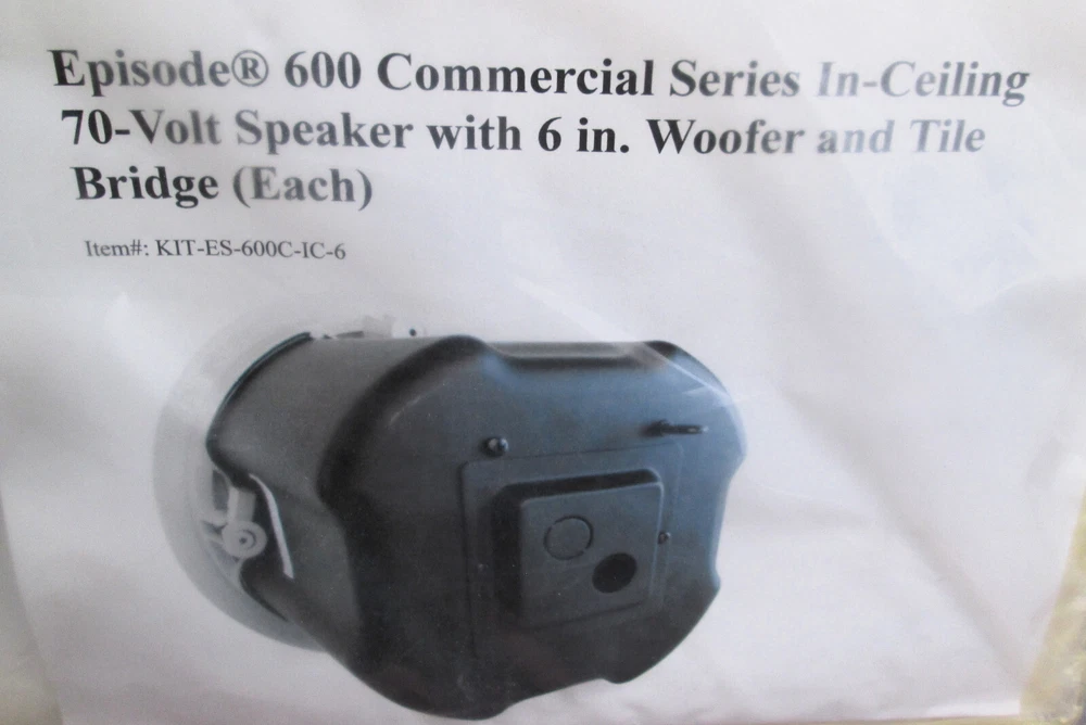 DESCRIPTION__________________________________________________________________________________________________________ This listing includes a SINGLE - Episode 600 Commercial Series In-Ceiling Speaker, model ES-600-C-IC-6 NEW, NEVER INSTALLED. It comes in its original, opened box. Please refer to the images for further info on cosmetics and be sure to ask any questions you may have prior to bidding or purchasing. Thank you. L-DI-121 (8/L-9x10x10) SL SHIPPING________________________________________________________________________________________________________ Shipping cost: Shipping in the U.S. is $25 (Alaska, Hawaii and Puerto Rico please email for rates) LOCAL PICK UP IS ALWAYS WELCOME! Salesbaron is in Los Angeles, 90039 International buyers, please be aware that you may incur a brokerage and/or customs fee upon delivery. Winning bidder is responsible for these shipping charges. We reserve the right to choose carrier based on shipping method selected at time of payment. Combined shipping is done at the seller?s discretion. If you purchase more than one item from us, they may arrive in separate packages. PAYMENTS_________________________________________________________________________________________________________ We accept the following payment methods: Paypal All major credit cards Cash on pick up Please contact us if you have any questions. Office Hours are Mon-Fri 9am-4pm and Saturdays from 9am-2pm RETURNS_________________________________________________________________________________________________________ We list and photograph every item we sell so you can feel confident when bidding. If for any reason you are not satisfied with your order, please contact us immediately. Filing a claim should be reserved as a last resort to solving an issue. Please give us a chance to solve any issues that you may have for any reason before leaving feedback.