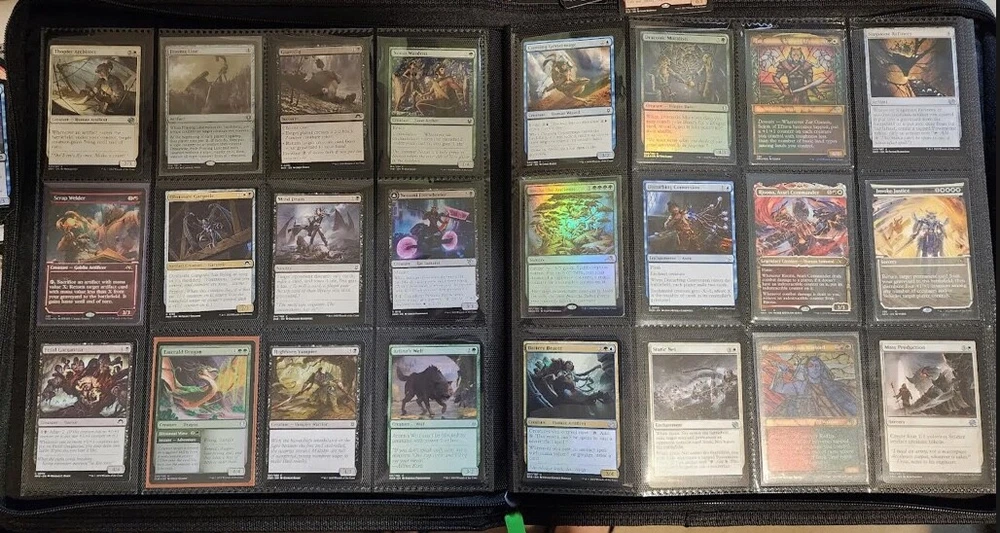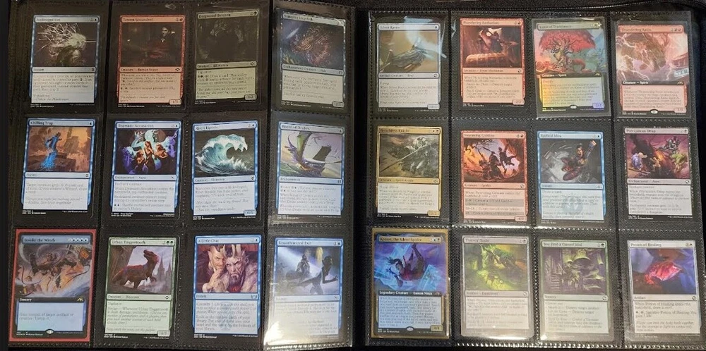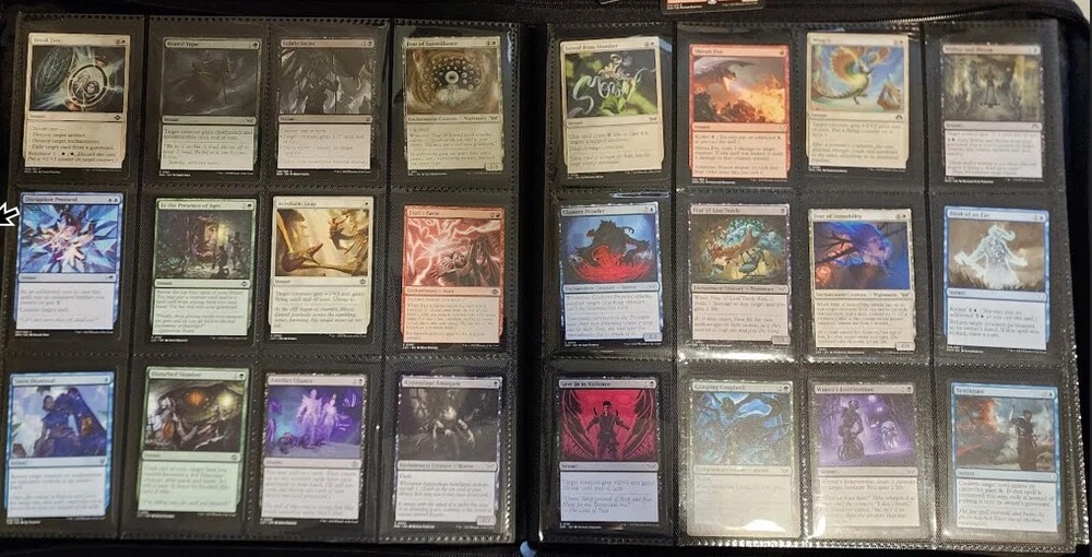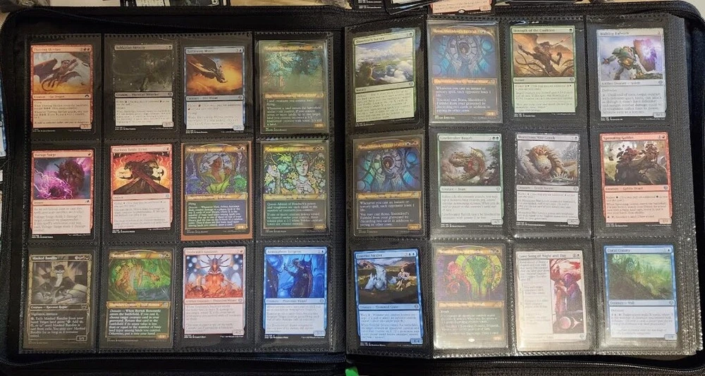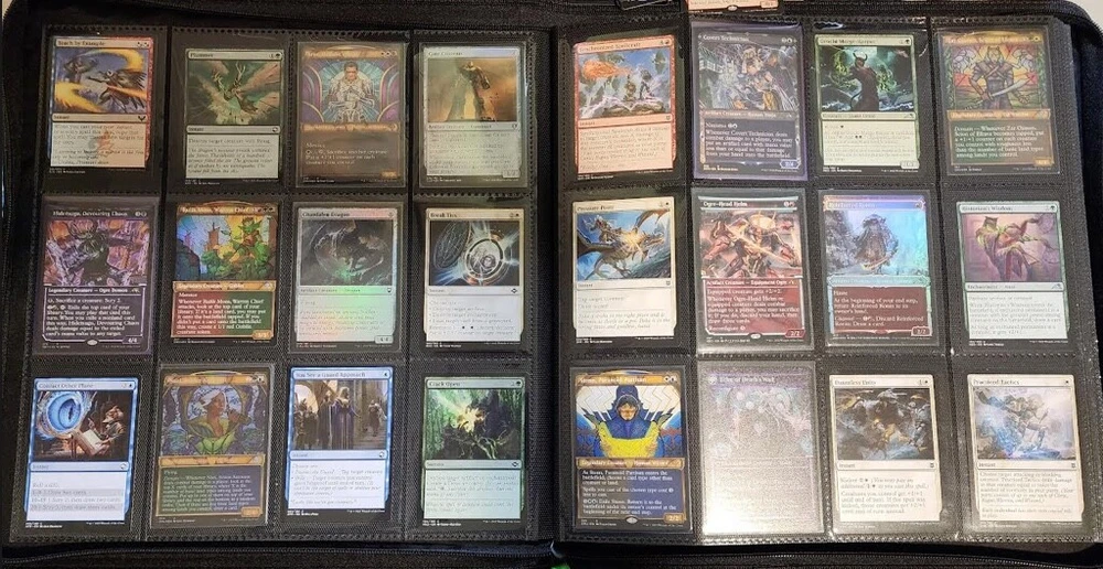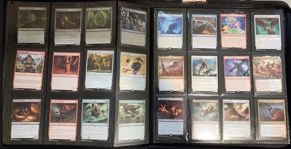 1x Full Binder of MTG Cards -- Unknown total value MTG Binder full of 468+ cards Cards can be sleeved or unsleeved. Go by the photos. Possibility: none are sleeved. No basic lands unless full art basic lands. Fetchlands/Dual lands/etc. CAN be included. Every slot will have at least 1 card, hence calculation of total number of cards. A few have 2 cards in it! Cards are clean, generally unplayed (pack fresh) in NM and LP condition. A rare damaged or MP/HP may slip past us and be included: check our reviews to see if this is a common occurrence. We strive for all cards to be NM/LP. Almost all are pack fresh [I bought cases/boxes]. Expect minor duplicates (<4 per same card). Expect possibility of minor tokens (6-8 per binder). Picture above is actual product and binder being sold. Visible cards are in the binder. Value Note: The primary value is derived from the cards visible. 4-5 Damaged Slots: if the binder is marked as used or "c" grade, please allow for 4-5 torn/unusable slots. Additional cards will be added elsewhere to make the stated total if cards cannot be placed in the slot. Sales final, no returns. Thanks and let me know of any questions. Binder is Vault X in C+ condition. Thanks for stopping by! Rock Fortress Trading