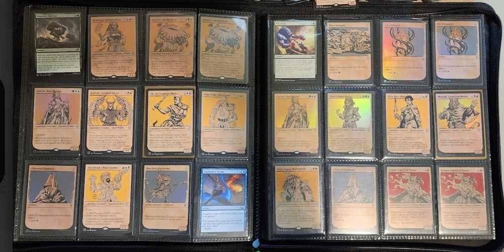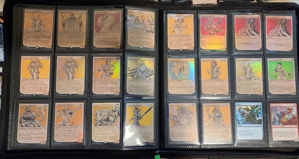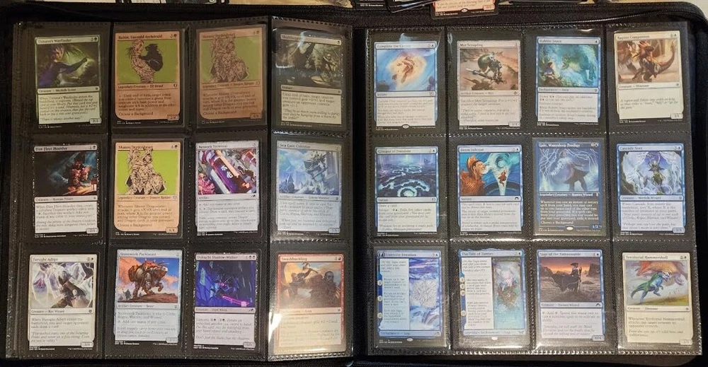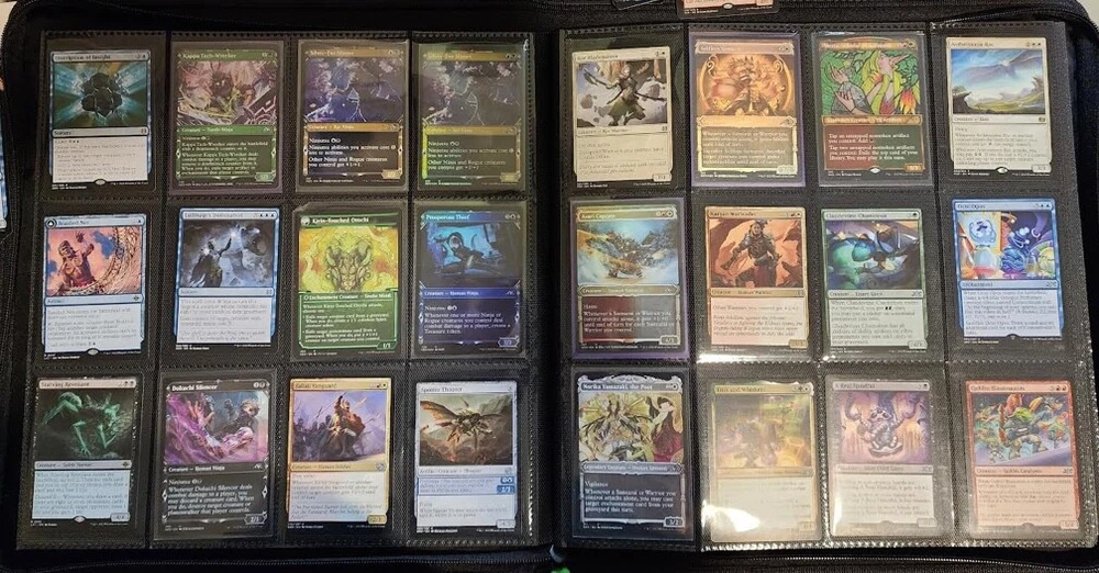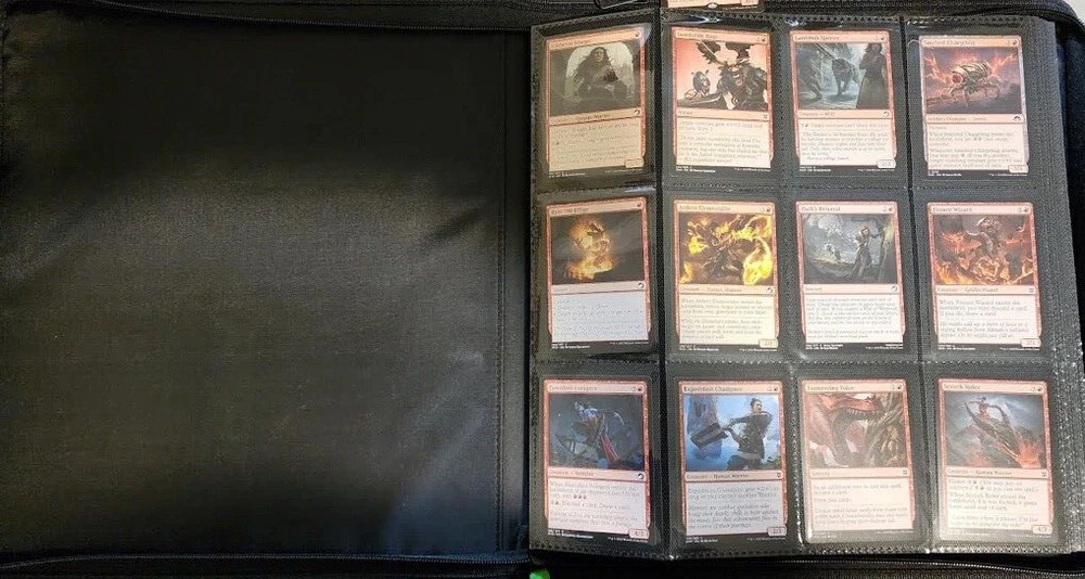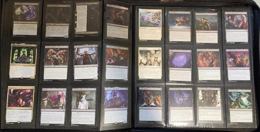 1x Full Binder of MTG Cards -- Unknown total value MTG Binder full of 468+ cards Cards can be sleeved or unsleeved. Go by the photos. Possibility: none are sleeved. No basic lands unless full art basic lands. Fetchlands/Dual lands/etc. CAN be included. Every slot will have at least 1 card, hence calculation of total number of cards. A few have 2 cards in it! Cards are clean, generally unplayed (pack fresh) in NM and LP condition. A rare damaged or MP/HP may slip past us and be included: check our reviews to see if this is a common occurrence. We strive for all cards to be NM/LP. Almost all are pack fresh [I bought cases/boxes]. Expect minor duplicates (<4 per same card). Expect possibility of minor tokens (6-8 per binder). Picture above is actual product and binder being sold. Visible cards are in the binder. Value Note: The primary value is derived from the cards visible. 4-5 Damaged Slots: if the binder is marked as used or "c" grade, please allow for 4-5 torn/unusable slots. Additional cards will be added elsewhere to make the stated total if cards cannot be placed in the slot. Sales final, no returns. Thanks and let me know of any questions. Binder is Vault X in C+ condition. Thanks for stopping by! Rock Fortress Trading