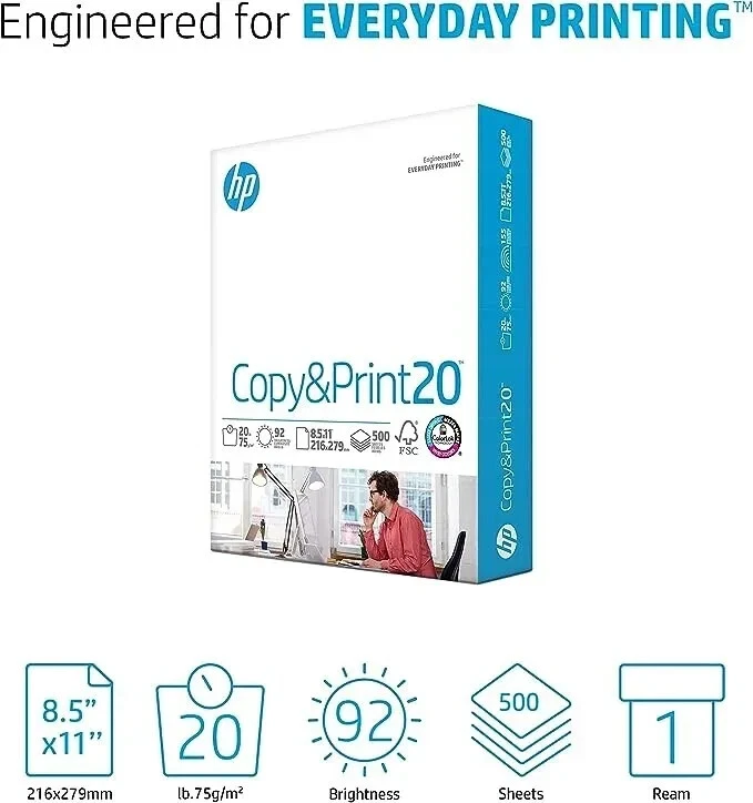 HP Papers is sourced from renewable forest resources and has achieved production with 0% deforestation in North America. Each ream is wrapped in a polyurethane coated paper wrapper to protect the cut sheets from moisture damage Sheet size – 8.5 x 11; Thickness – 20 pounds; Brightness – 92 bright white HP Copy&Print20 20 pounds printer paper is Forest Stewardship Council (FSC) certified and contributes toward satisfying credit MR1 under LEED (Leadership in Energy and Environmental Design) All HP Papers provide premium performance on HP equipment, as well as on all other printer and copier equipment; 100% satisfaction guaranteed; ColorLok technology provides more vivid colors, bolder blacks and faster drying Superior quality, reliability, and dependability for high-volume printing at home, at school and in the office; HP Copy&Print20 print and copy paper prevents yellowing over time to ensure a long-lasting appearance for added archival quality