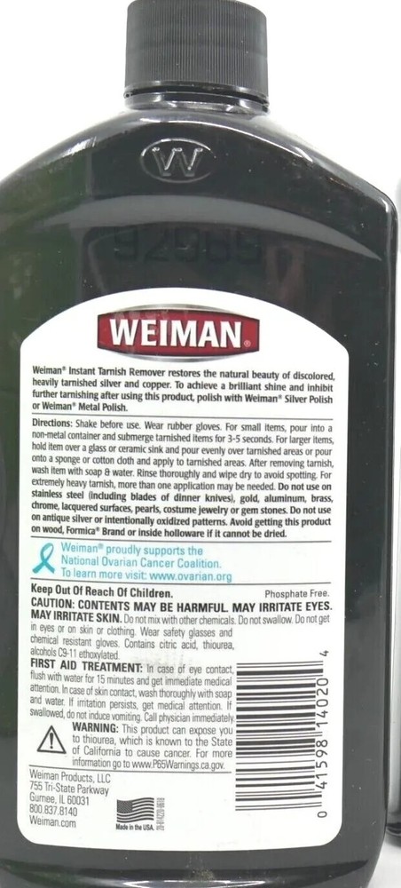1 bottle Weiman Instant Tarnish Remover 16 fl oz ea, Restores Tarnished Silver Copper Condition is new but item may show very light shelfwear Here at Finders' Emporium, we specialize in discontinued & hard to find items that we source from various places- sometimes these are shelf pulls and will show light shelf wear (scratches & dents), discolorations, sticker residue, etc. We try our best to note when this is the case- but please view all pictures and ask any questions you may have about the cosmetic condition of the item. Finders' Emporium can sometimes offer a small discount for larger purchases so please contact us if you are interested in purchasing more than one listing. Items over expiration are sold as "collectible" and are not intended for use or consumption. Per our policies, a purchase over $200 is required to be signed for at delivery. We appreciate your business!