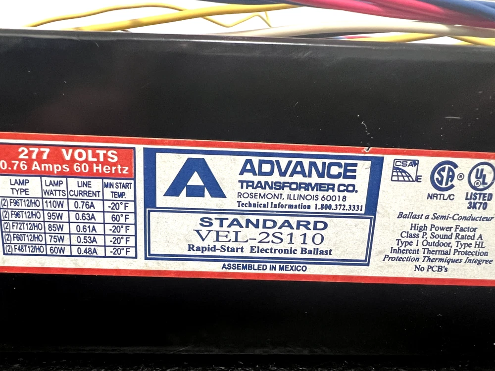 Lot of 2 Advance Transformer Standard VEL-3S110 rapid-start electronic ballast. 277 Volts. Unused but may have some signs of wear from storage/being moved. **PLEASE READ!**: Message us before you open a eBay return case. Opening a return case negatively affects a seller's rating. If you have any issues please let us know, We will work quickly to resolve them. CONTACT: We answer emails Monday through Friday 9:30am to 03:30pm. We are closed over the weekends. We ship items out within 3 business days of payment. We do not ship any items out over the weekends. CONDITION DESCRIPTION: WE DO OUR BEST TO TRY AND CATCH ANY AND ALL FLAWS. BUT THINGS DO SOMETIMES GET BY US AND WE ARE SORRY FOR THAT WHEN IT DOES HAPPEN. WE TRY AND TEST TO OUR BEST ABILITY. WE DO LIST FROM WORKING ENVIRONMENT OR A COMPANY STATING TO US THEY WORK, AND SOMETIMES ALL WE CAN DO TO VERIFY IS PLUG AN ITEM IN. WE TRY AND LIST ACCURATELY HOW WE TESTED. WITH ANY ELECTRONICS THEY COULD WORK FOR US AND THEN REBEL AND NOT WORK AFTER SHIPMENT. IN ANY CASE WE TRY AND OFFER AS MANY ITEMS WE CAN AS 30 DAY RETURNS. JUST PLEASE CONTACT US FIRST TO SET UP A RETURN. WE ARE SELLING USED ITEMS SO PLEASE BEWARE THEY COULD HAVE COSMETIC ISSUES OUR HUMAN EYES DID NOT SEE OR CATCH. About Us: We are a Family Owned and Operated e-Waste company located in Massachusetts. We strive to repurpose and reuse all items that come into our facility. We test items to the best of our ability and always explain how much testing was done on an item in the condition description. Third Party International Shipping Companies: If you use a 3rd party International shipping company to get items to your country-please note -there are no guarantees from eBay or Paypal for these transactions. Once the item is delivered to these companies any issues you have at that point you have to file disputes with the shipping company you used. You may contact us prior to getting approval to bid and or buy. thanks Customer Service: If for any reason you feel you cannot leave us 5-star feedback, please contact us so we can make it right. Customer satisfaction is our top priority and is needed to keep our business alive. Please message us prior to leaving feedback or opening a case so we can do our best to resolve whatever issue you have. We want to gain your repeat business. We answer emails Monday through Friday 9:30am to 03:30pm. We are closed over the weekends. We ship items out within 3 business days of payment. We do not ship any items out over the weekends. RETURNS: We have a 30-day inspection period for items described as working and offer returns on most items. We do accept returns in the event your item arrives DOA or is not as described, as long as returns are offered at the time of purchase on the listing. We try to fully examine everything prior to listing and thoroughly describe each item, but sometimes things slip through the cracks, especially when dealing with used merchandise. We do not accept returns on items that have been tampered with or altered in any way. If any items have asset tags those tags must be attached in order to return. SHIPPING: IF FREE SHIPPING OR FLAT RATE SHIPPING IS OFFERED ON AN ITEM, THAT SHIPPING PRICE IS FOR THE 48 CONTIGUOUS CONTINENTAL US STATES ONLY. PLEASE CONTACT FOR RATES TO YOUR AREA.