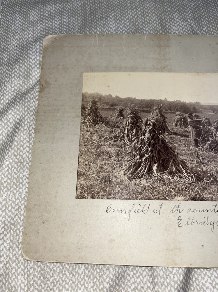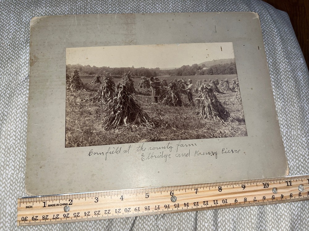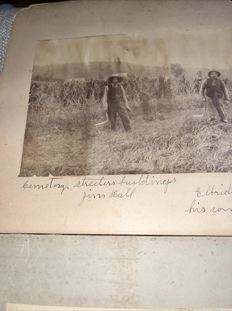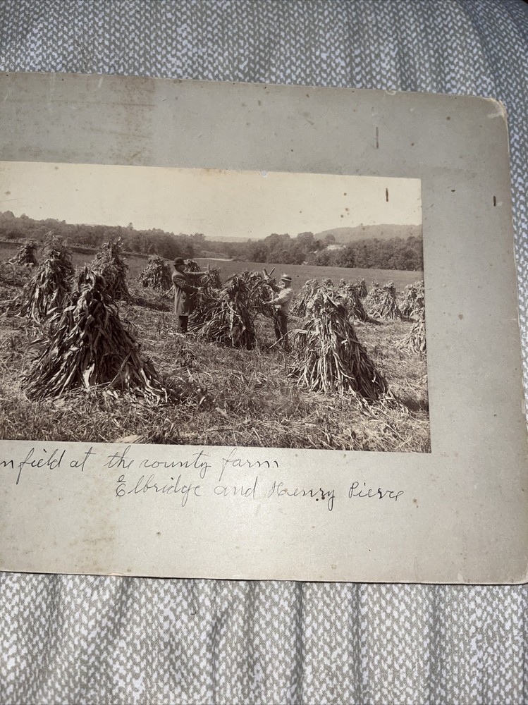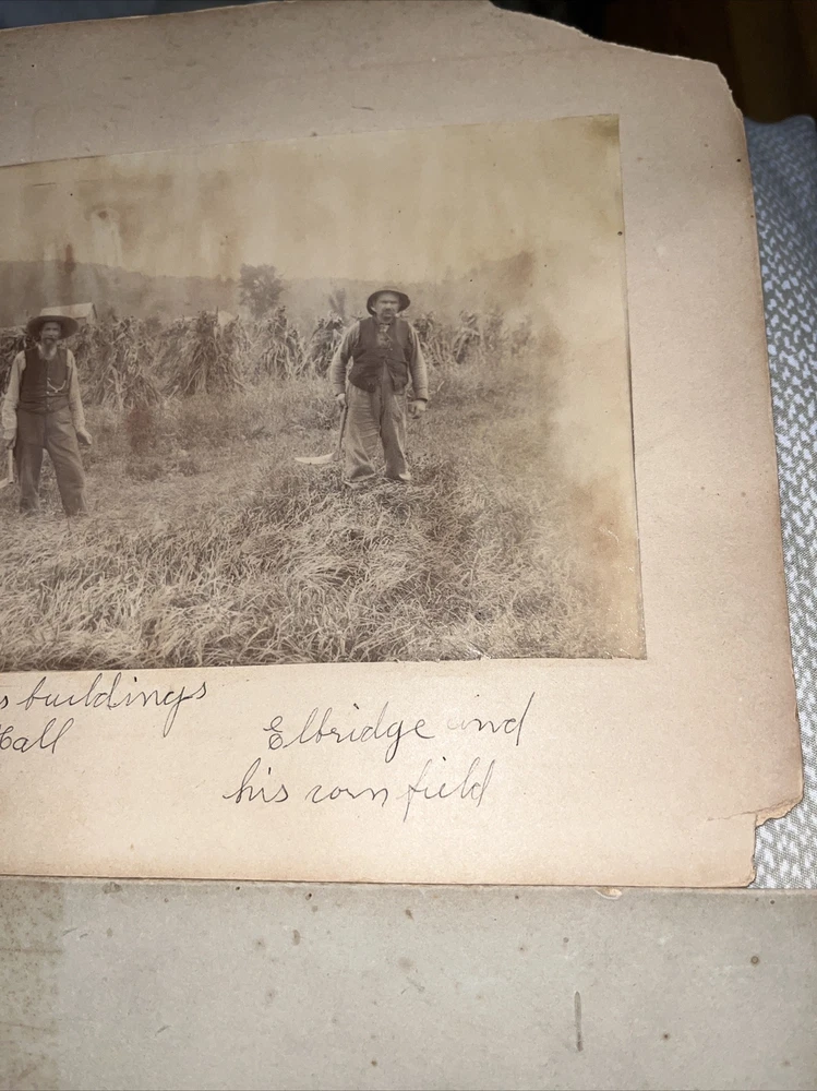 Old! Wear commensurate to age, including, perhaps, stains, fading, dings, fraying, old smells, and other imperfections, etc. County farm photo has some writing on it… previously the property of a local historical society. Matting is 8” x 11” — not a cabinet card, but a mounted photograph. The second is 8” x 10” and the matting is quite damaged and chipped. Also a farm scene.