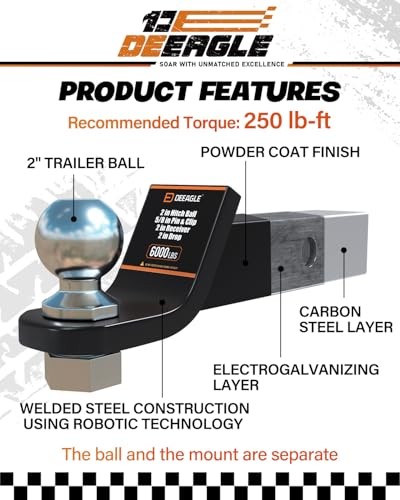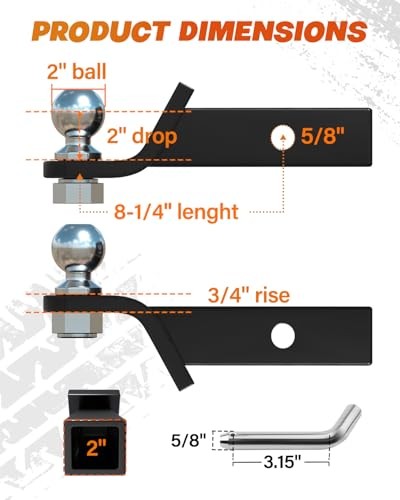 Trailer Hitch Ball Mount with 2 Inch Ball Heavy Duty Tow Hitch Fits 2 Inch Receiver 6000 lbs Towing Capacity 2 Inch Drop Trailer Hitch Ball Mount with 2 Inch Ball Heavy Duty Tow Hitch Fits 2 Inch Receiver 6000 lbs Towing Capacity 2 Inch Drop Handles up to 6,000 lbs GTW and 600 lbs TW, suitable for towing campers, boats, and utility trailers. Constructed from fully welded steel for heavy-duty towing power and durability. Black powder-coated finish and chrome-plated ball provide corrosion resistance for all weather conditions. Fits standard 2-inch receivers with a 2-inch drop and 0.75-inch rise for a level, safe tow. Easy to install with included 2-inch ball and pin; no additional tools required. Designed to reduce movement or rattling with an anti-rattle hitch insert recommended for a secure fit.