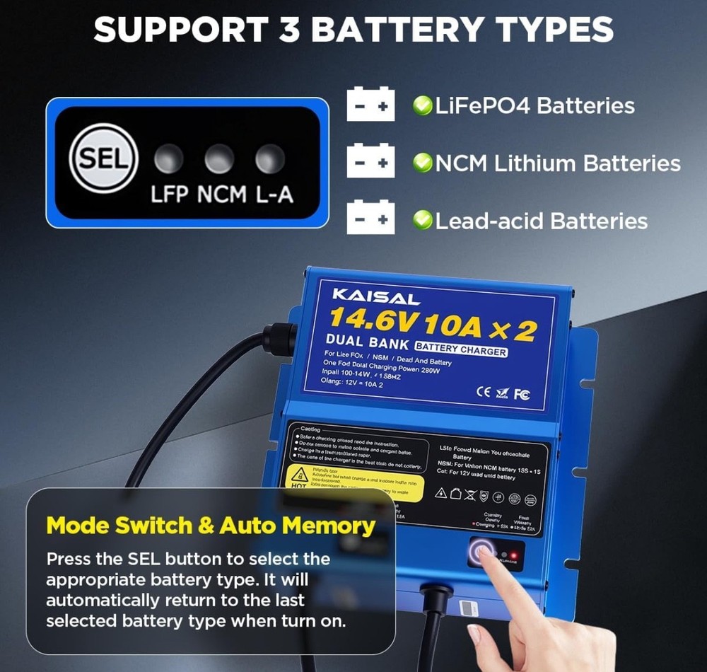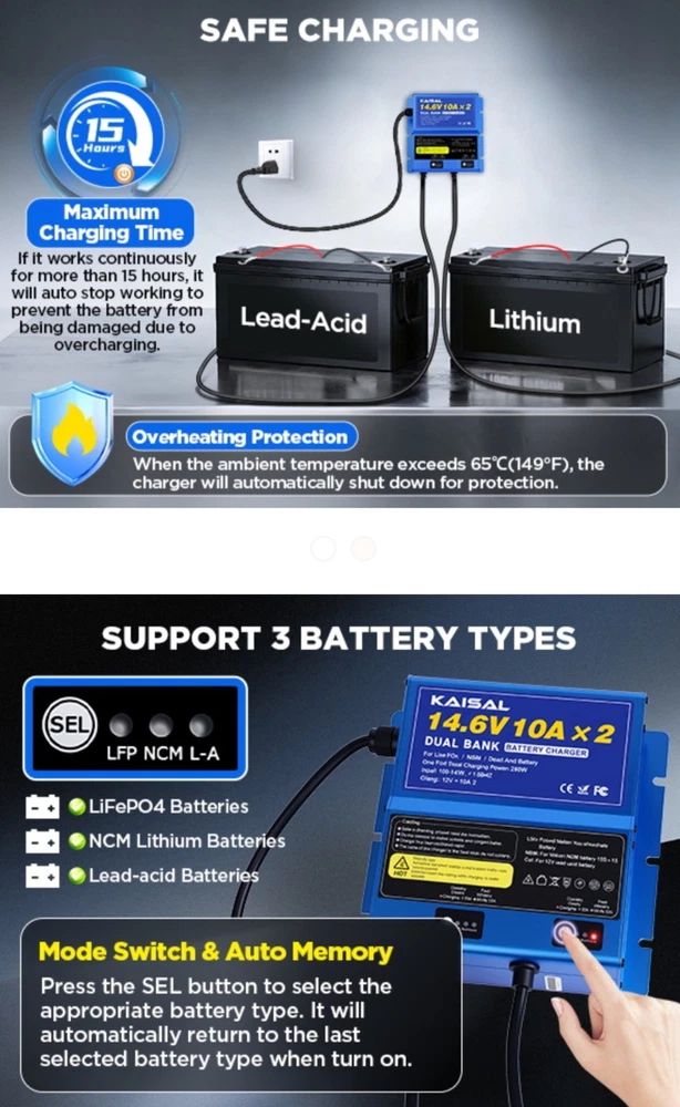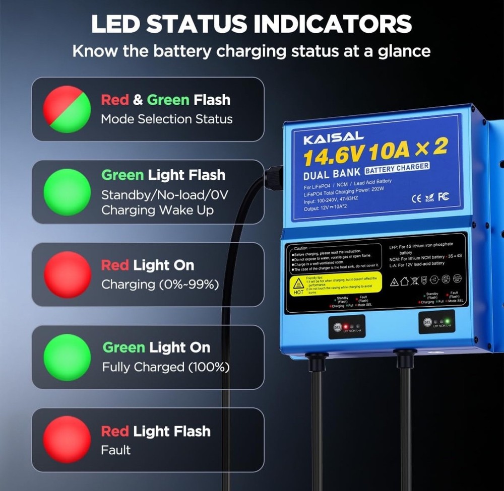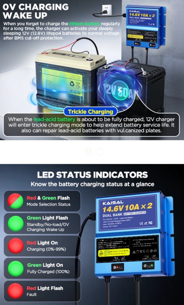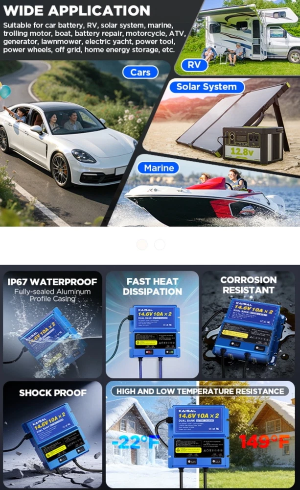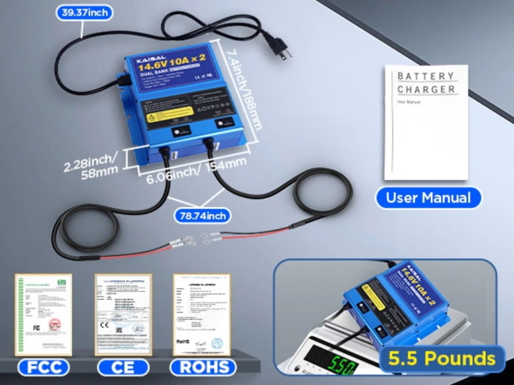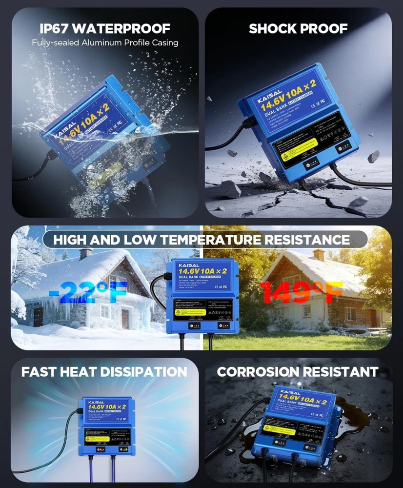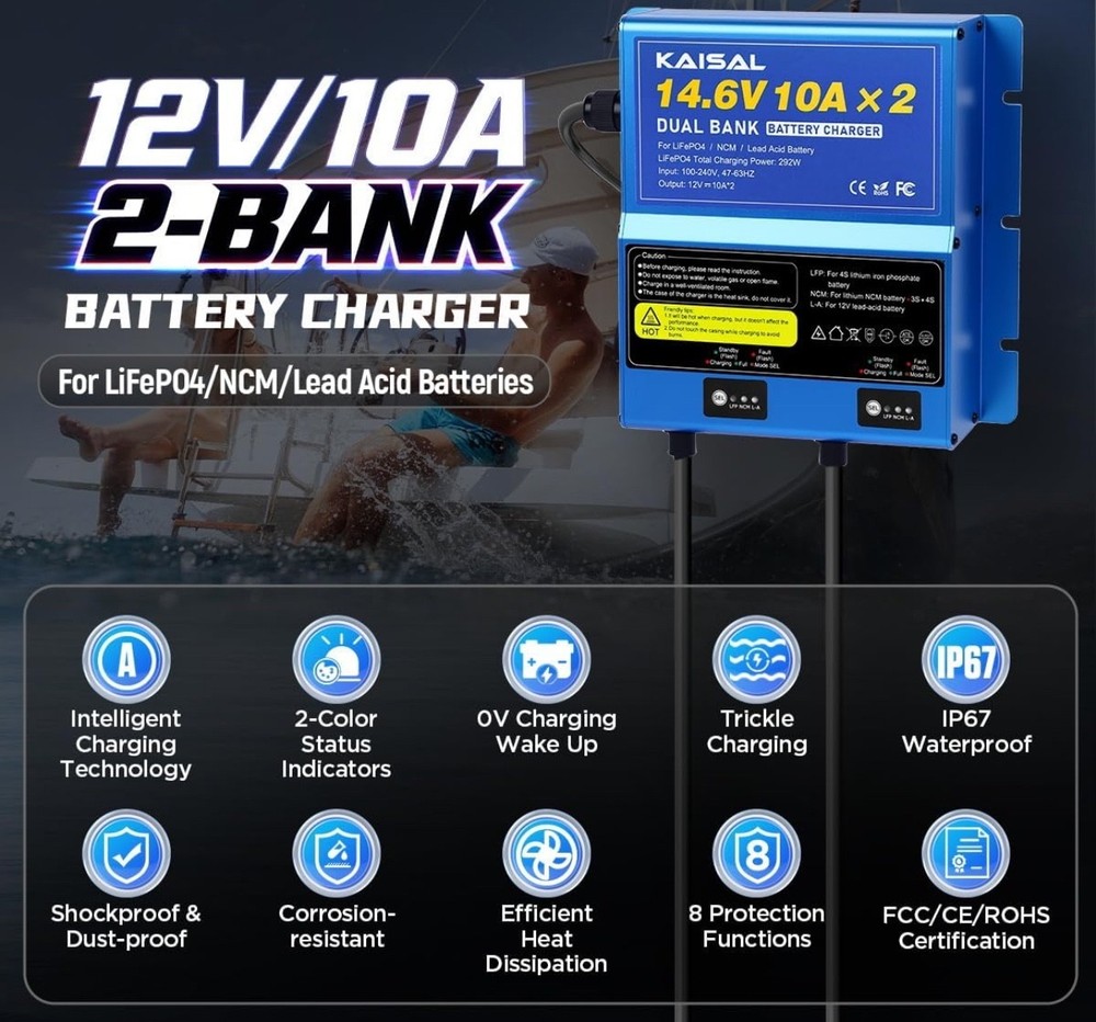 #3077 2 Bank Marine Battery Charger 12V 20A(10A/Bank) IP67 Waterproof 14.6V LiFePO4 & Lead-Acid & NCM Lithium Battery Charger 12 Volt 0V Wake Up 12V Charger, Onboard Charger for Boat, Car,RV, Trolling Motor Brand KAISAL Product Dimensions 4.7"D x 10.2"W x 12"H Input Voltage 110 Volts Manufacturer KAISAL Number of Ports 2 【Support Multiple Battery Types】Our 12 Volt charger is widely compatible with 12V LiFePO4 batteries, NCM lithium batteries, lead-acid batteries. Suitable for car, RV, solar system, marine, trolling motor, boat, battery repair, motorcycle, ATV, generator, lawnmower, electric yacht, power tool, power wheels, off grid, home energy storage, etc., providing you with reliable and quick charging solutions. It's well worth having one in your repair shop or garage. Upgrade your charging experience today! 【Dual 10A Battery Charger】The upgraded 12 volt lithium battery charger features dual-channel M8 terminals, each channel outputting 10A, enabling simultaneous charging of two batteries and saving 50% of charging time. Output Voltage (DC):14.6V/LFP, 12.6V/NCM(3 strings), 14.7V/Lead Acid. Charging Current: 10A; Total power output of 2-bank: 150W; Efficiency:≥94%; Rated Input Voltage: 90V-240V AC; 47Hz to 63Hz. Each channel is independently charged, detected, and controlled. 【Intelligent Charging Technology】12V charger can customize charging curves according to different battery types, automatically switching between constant current (CC), constant voltage (CV), and float charge mode. After a charging cycle is complete, the charger will turn off and enter float charge mode, continuously monitoring battery voltage. Once the battery gets below 80%, it will auto start charging. So you can leave charger connected to battery all the time without unplug it from AC power. 【0V Charging Wake Up & Trickle Charging】14.6V lifepo4 battery charger can activate the lithium battery after BMS cut-off protection. When you forget to charge the lithium battery regularly for a long time, it can wake up your deeply sleeping 12V (12.8V) lifepo4 batteries to normal voltage after BMS protection. When the lead-acid battery is about to be fully charged, 12 volt charger will enter trickle charging mode to help extend battery life. It also can repair batteries with vul.canized plates. 【IP67 Waterproof & Fast Heat Dissipation】12V lithium charger features a fully sealed aluminum profile casing,boasting IP67 waterproof, dustproof, shockproof, and corrosion-resistant performance, along with excellent heat dissipation and fanless silent operation.Its wide operating temperature range (-22°F to 149°F) ensures stable operation even in harsh environments.It has passed rigorous cyclic testing, including underwater operation testing, making it ideal for marine and outdoor environments. 【2-Color LED Status Indicators & Auto Memory】12V Lithium battery charger comes with two 2-color LED indicators, allowing you to monitor the battery charging status in real time. 1. Green Light Flash: Standby/No-load/0V Charging Wake Up; 2. Red Light On: Charging (0%~99%); 3. Green Light On: Fully Charged (100%); 4. Red Light Flash: Fault; 5. Red/Green Light Flash Alternately: Mode Selection Status. The 12V battery charger will automatically return to the last selected battery type when turn on. 【8 Protection Functions】2 Bank marine battery charger has a perfect protection system:Output Overvoltage/Overcurrent/Overheat/No-load/Short-circuit/Reverse Connection/Overcharge/15H Timing Charging protection.When the charger's sensor detects that the temperature reaches 158℉, the current will be reduced to 8.5A. When the temperature reaches 176℉, the overheat protection will be activated and the charger will stop working to prevent charger and battery from being damaged and protect your safety. 【9.8FT Long Cable & Flexible Installation & Lightweight】Each bank of 12 volt boat battery charger comes with a 9.8ft extra long cable(3.3ft input cable+6.6ft output cable), providing great flexibility without the need for additional extension cords. There are 6 holes on the back of the on board battery charger allowing you to mount it on a wall or vehicle in any orientation, even upside down. It weighs only 5.5 pounds and can be carried anywhere. 【FCC/CE/ROHS Certification】Our 12V marine battery charger is FCC, CE, ROHS certified, providing you with safer charging, lower energy consumption, higher conversion efficiency, better load capacity, less electromagnetic radiation interference and noise. Buy it with confidence! 【3-Year Product Service & 100% Full Loading Aging Test】We KAISAL aim at trying our best to offer you the best product and services to make you unworried before/after the purchase. Our 14.6v 10amp lithium battery chargers all pass 100% full load aging test. We promise a 3-year product service. For quality problems caused by non-human damage, please feel free to contact us. We will provide free replacement 12V lifepo4 battery charger after confirmation.