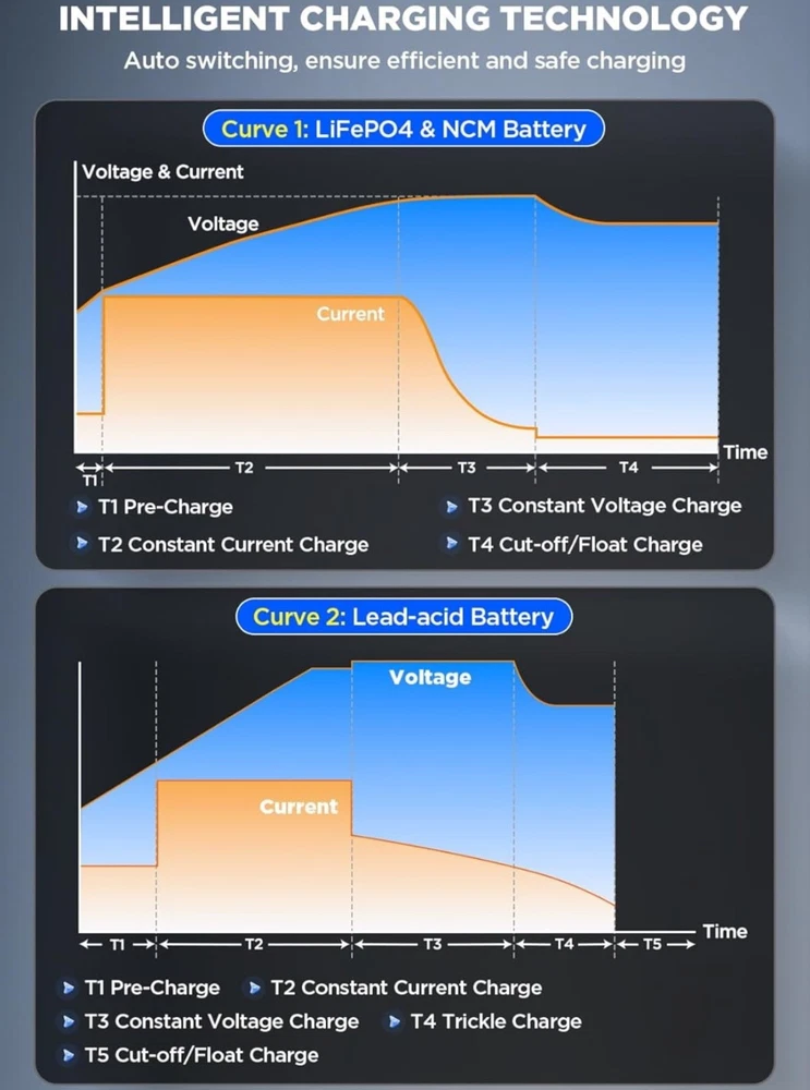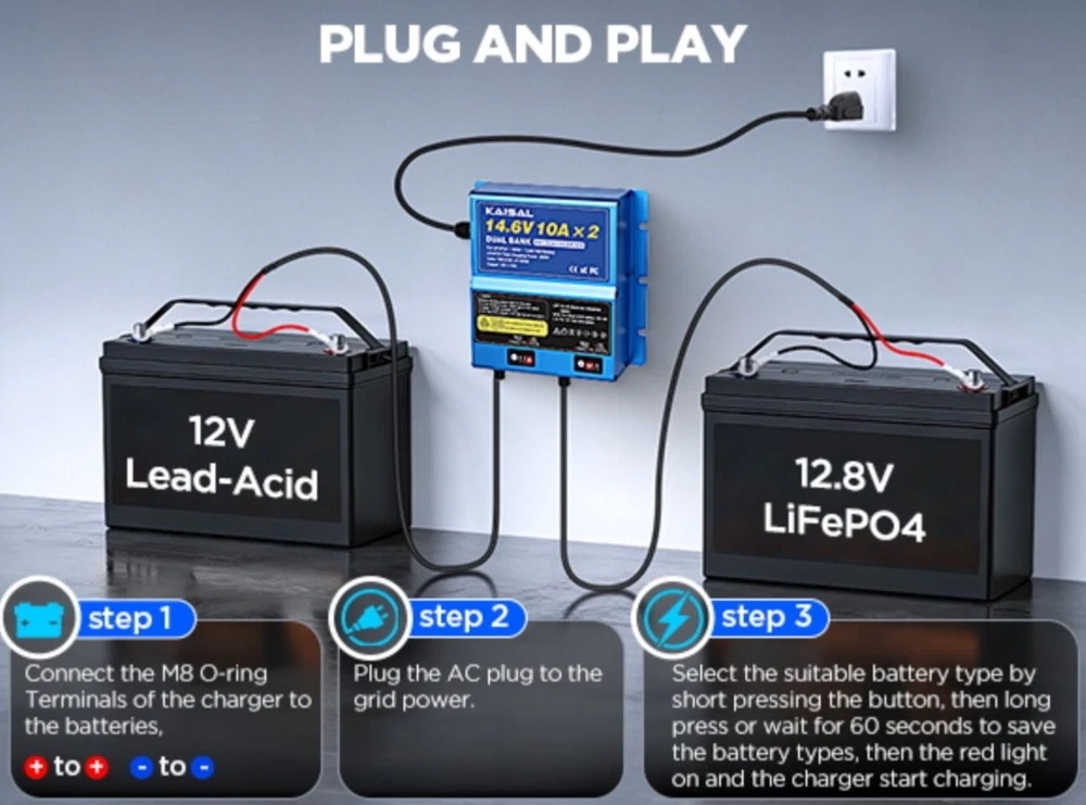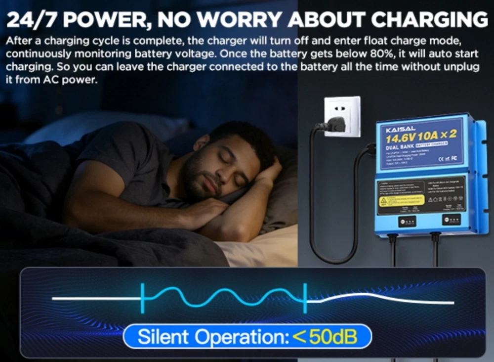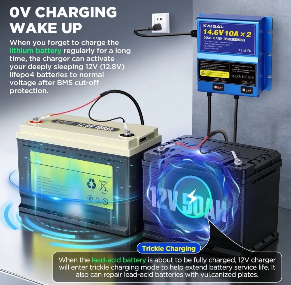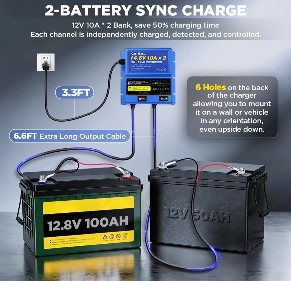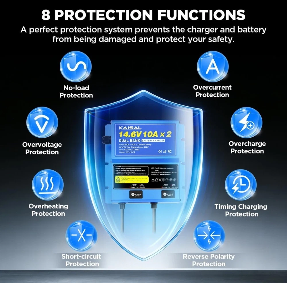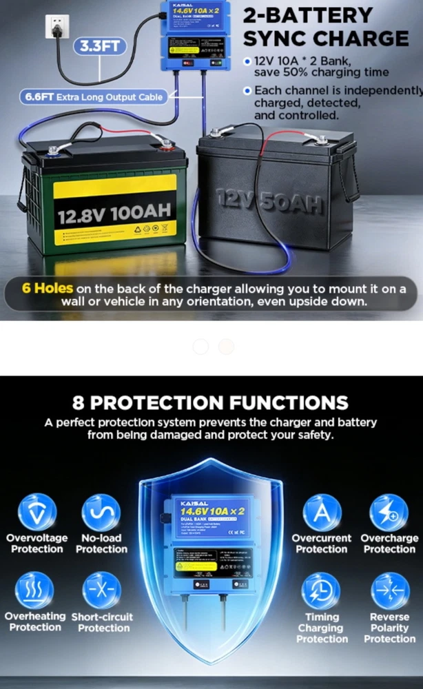 #3077 2 Bank Marine Battery Charger 12V 20A(10A/Bank) IP67 Waterproof 14.6V LiFePO4 & Lead-Acid & NCM Lithium Battery Charger 12 Volt 0V Wake Up 12V Charger, Onboard Charger for Boat, Car,RV, Trolling Motor Brand KAISAL Product Dimensions 4.7"D x 10.2"W x 12"H Input Voltage 110 Volts Manufacturer KAISAL Number of Ports 2 【Support Multiple Battery Types】Our 12 Volt charger is widely compatible with 12V LiFePO4 batteries, NCM lithium batteries, lead-acid batteries. Suitable for car, RV, solar system, marine, trolling motor, boat, battery repair, motorcycle, ATV, generator, lawnmower, electric yacht, power tool, power wheels, off grid, home energy storage, etc., providing you with reliable and quick charging solutions. It's well worth having one in your repair shop or garage. Upgrade your charging experience today! 【Dual 10A Battery Charger】The upgraded 12 volt lithium battery charger features dual-channel M8 terminals, each channel outputting 10A, enabling simultaneous charging of two batteries and saving 50% of charging time. Output Voltage (DC):14.6V/LFP, 12.6V/NCM(3 strings), 14.7V/Lead Acid. Charging Current: 10A; Total power output of 2-bank: 150W; Efficiency:≥94%; Rated Input Voltage: 90V-240V AC; 47Hz to 63Hz. Each channel is independently charged, detected, and controlled. 【Intelligent Charging Technology】12V charger can customize charging curves according to different battery types, automatically switching between constant current (CC), constant voltage (CV), and float charge mode. After a charging cycle is complete, the charger will turn off and enter float charge mode, continuously monitoring battery voltage. Once the battery gets below 80%, it will auto start charging. So you can leave charger connected to battery all the time without unplug it from AC power. 【0V Charging Wake Up & Trickle Charging】14.6V lifepo4 battery charger can activate the lithium battery after BMS cut-off protection. When you forget to charge the lithium battery regularly for a long time, it can wake up your deeply sleeping 12V (12.8V) lifepo4 batteries to normal voltage after BMS protection. When the lead-acid battery is about to be fully charged, 12 volt charger will enter trickle charging mode to help extend battery life. It also can repair batteries with vul.canized plates. 【IP67 Waterproof & Fast Heat Dissipation】12V lithium charger features a fully sealed aluminum profile casing,boasting IP67 waterproof, dustproof, shockproof, and corrosion-resistant performance, along with excellent heat dissipation and fanless silent operation.Its wide operating temperature range (-22°F to 149°F) ensures stable operation even in harsh environments.It has passed rigorous cyclic testing, including underwater operation testing, making it ideal for marine and outdoor environments. 【2-Color LED Status Indicators & Auto Memory】12V Lithium battery charger comes with two 2-color LED indicators, allowing you to monitor the battery charging status in real time. 1. Green Light Flash: Standby/No-load/0V Charging Wake Up; 2. Red Light On: Charging (0%~99%); 3. Green Light On: Fully Charged (100%); 4. Red Light Flash: Fault; 5. Red/Green Light Flash Alternately: Mode Selection Status. The 12V battery charger will automatically return to the last selected battery type when turn on. 【8 Protection Functions】2 Bank marine battery charger has a perfect protection system:Output Overvoltage/Overcurrent/Overheat/No-load/Short-circuit/Reverse Connection/Overcharge/15H Timing Charging protection.When the charger's sensor detects that the temperature reaches 158℉, the current will be reduced to 8.5A. When the temperature reaches 176℉, the overheat protection will be activated and the charger will stop working to prevent charger and battery from being damaged and protect your safety. 【9.8FT Long Cable & Flexible Installation & Lightweight】Each bank of 12 volt boat battery charger comes with a 9.8ft extra long cable(3.3ft input cable+6.6ft output cable), providing great flexibility without the need for additional extension cords. There are 6 holes on the back of the on board battery charger allowing you to mount it on a wall or vehicle in any orientation, even upside down. It weighs only 5.5 pounds and can be carried anywhere. 【FCC/CE/ROHS Certification】Our 12V marine battery charger is FCC, CE, ROHS certified, providing you with safer charging, lower energy consumption, higher conversion efficiency, better load capacity, less electromagnetic radiation interference and noise. Buy it with confidence! 【3-Year Product Service & 100% Full Loading Aging Test】We KAISAL aim at trying our best to offer you the best product and services to make you unworried before/after the purchase. Our 14.6v 10amp lithium battery chargers all pass 100% full load aging test. We promise a 3-year product service. For quality problems caused by non-human damage, please feel free to contact us. We will provide free replacement 12V lifepo4 battery charger after confirmation.