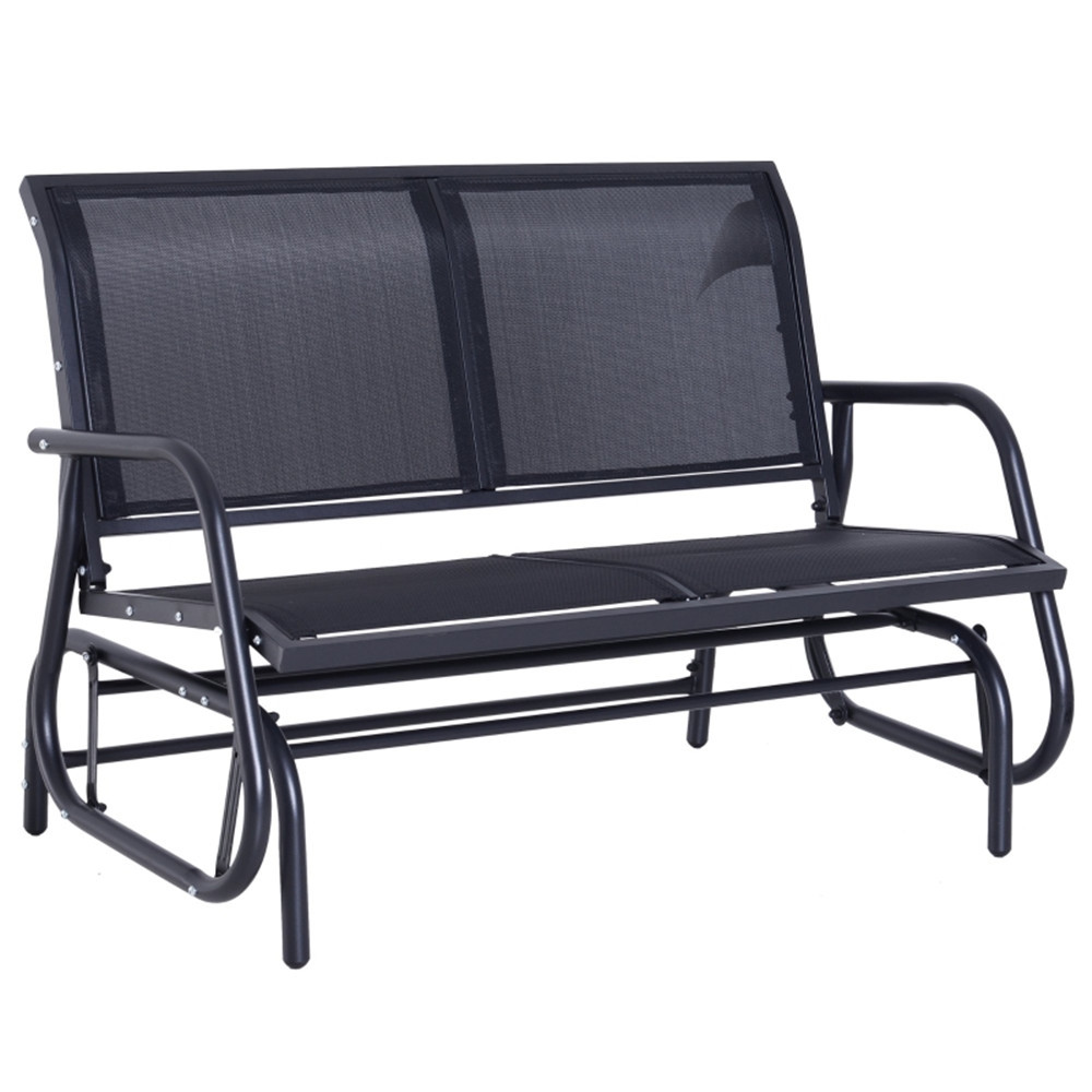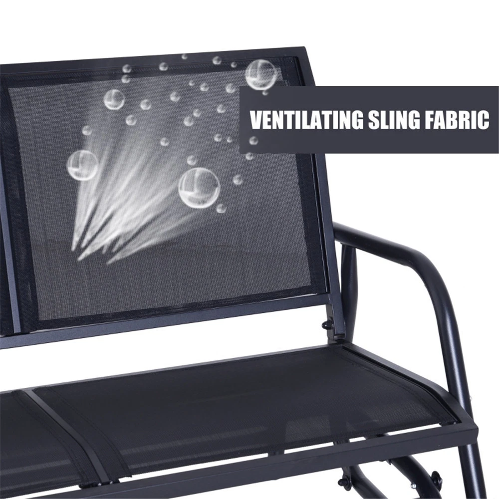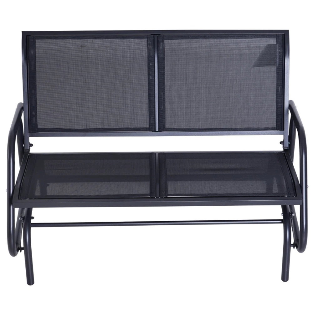 Features: - Water and UV-resistant, quick-drying, breathable sling fabric - The stable steel frame supports up to 440 lbs. - The smooth, curved rocker arms are heat and wear-resistant - Wide seat and backrest to comfortably seat two people - Great for gardens, patios, porches, and backyards Specification: - Color: Black - Materials: Steel, Sling Fabric - Weight Capacity: 440 lbs. - Overall Dimensions: 47.25" L x 27.5" W x 33.5" H - Seat Size: 45" L x 18.5" W - Backrest: 45" W x 17.75" L - Seating Height: 15.75" H - Footprint: 43.25" L x 28" W - Net Weight: 31.3 lbs. Package Includes: - 1 x Double Seat Glider - 1 x Manual
