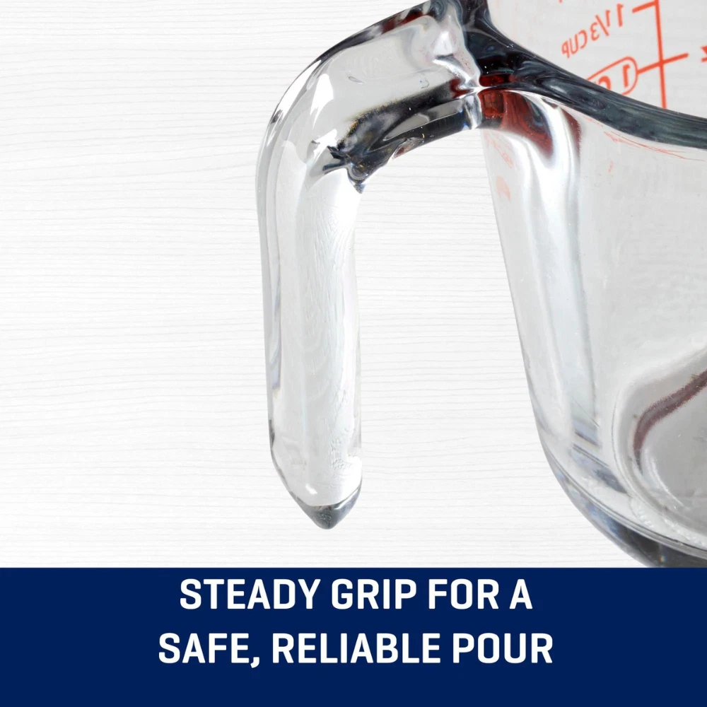 2 Cup (16 Ounce Capacity) Glass Measuring Cup, Clear Glass with Red Lettering Oven safe, microwave Safe, dishwasher safe and freezer safe glass mixing bowl made of Anchor Hocking clear glass for added durability. The 2.5-quart capacity is perfect for mixing batters and salads. Bowl coordinates with other Anchor Hocking glass cookware. INCLUDES: (1) 16-ounce glass measuring cup with a signature spout and handle for easy, clean pouring to reduce messes and ensure you can be as exact as possible in your cooking. EASY READ LINES: Our glass measuring cups have bright red markings in imperial and metric units. Because lines are fired on, they won’t scratch or wash off like other liquid measuring cups. MICROWAVE, DISHWASHER, FRIDGE/FREEZER SAFE: Measuring cups melt, mix, and reheat. Sturdy, solid glass ensures you can whisk, beat, and pour in the same cup you measure. LEAD FREE. BPA FREE: Glass measuring cup is made of chip resistant, nonporous glass. It won’t stain, retain smells, or leach dangerous chemicals or microplastics into food.