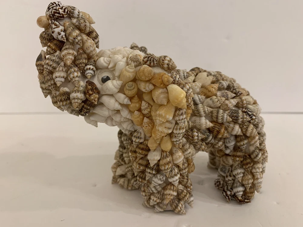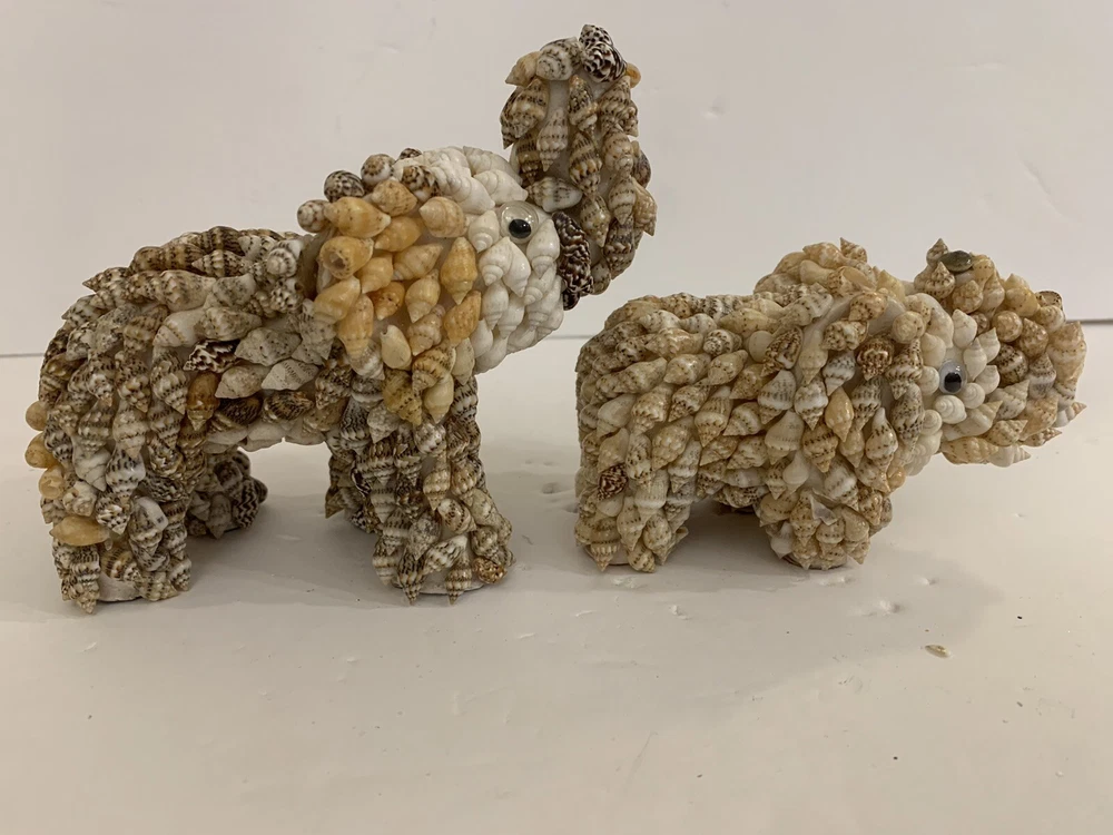 Set 2 Sea Shell Encrusted Elephants Trunks Up Figurines Handmade in Philippines Collectible Coastal decor A few missing seashells not very noticeable- refer to pics Approximately 4” and 2”H