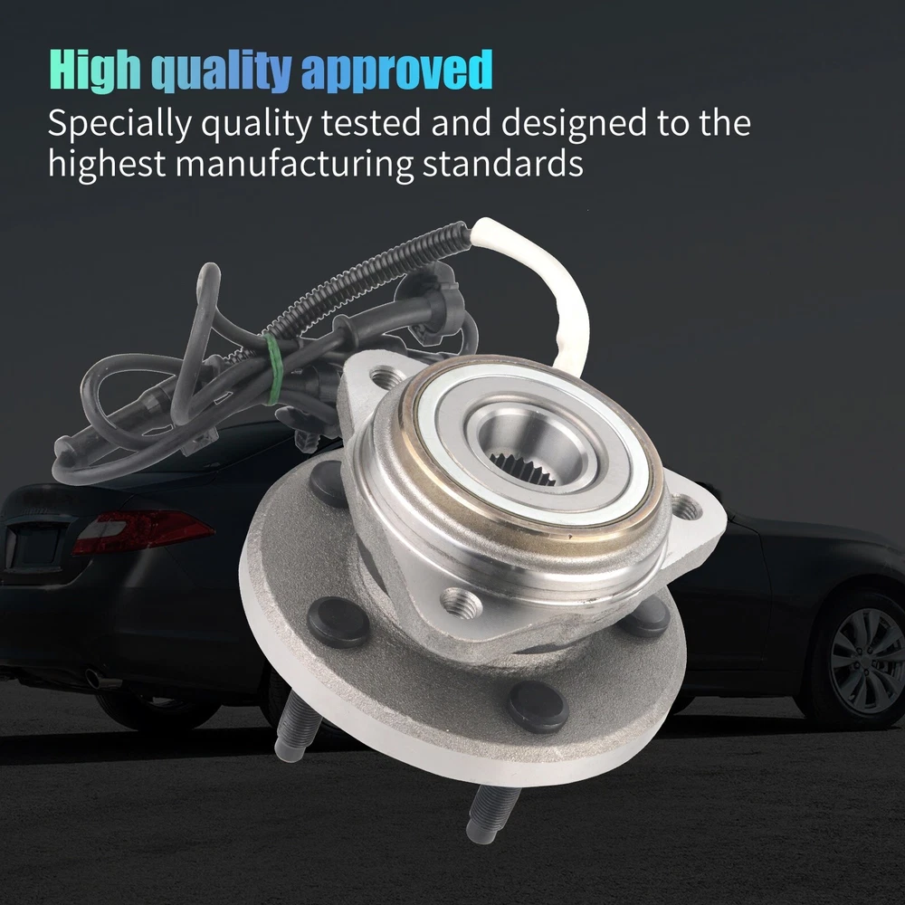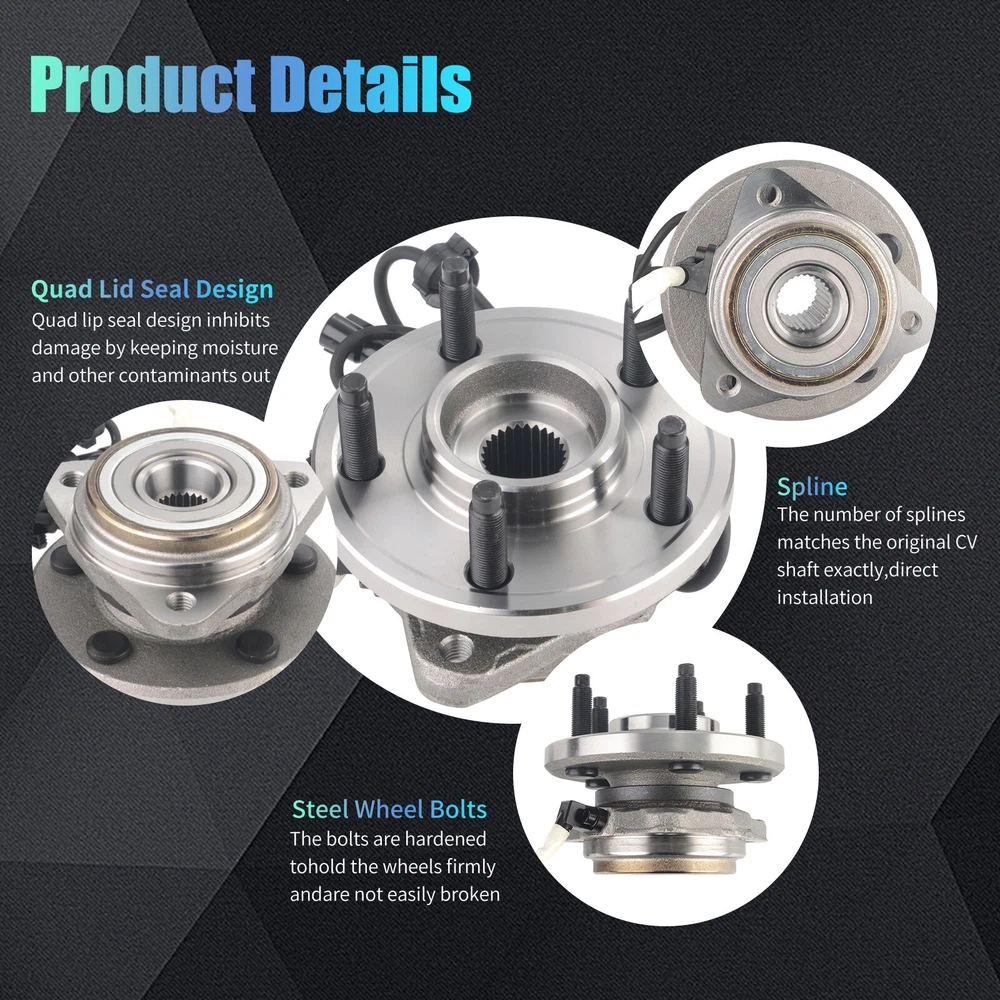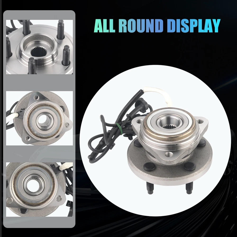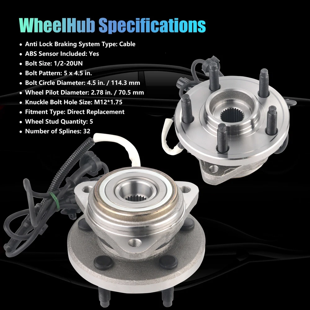 Specification OE Number: 515052 Item Weight(lbs): 9.48 Item Size(LengthxWidthxHeight:inch): 5.91x5.91x5.91 Number of Splines: 27 Knuckle Bolt Circle Diameter: 4.75 in. / 120.6 mm Lugs Included: Yes Material: Steel Finish: Polished,Rust Protected Type: Ball Bearing Wheel Stud Quantity: 5 Flange Shape: Triangular Hardware Included: No Hub Pilot Diameter: 3.94 in. C-Clip Included: No Fitment Type: Direct Replacement Knuckle Bolt Hole Size: M12*1.75 Flange Bolt Hole Quantity: 3 Flange Diameter: 5.88 in. Placement on Vehicle: Front Wheel Hub Bearings Unit: 2 Package Include: 2*Front Wheel Hub Bearings Bearing Generation: G3 Anti Lock Braking System Type: Cable Anti Lock Braking System: Yes Package Dimensions(LengthxWidthxHeight:inch): 5.91x5.91x5.91 ABS Sensor Included: Yes Bolt Size: 1/2-20UNF Bolt Pattern: 5 x 4.5 in. Bolt Circle Diameter: 4.5 in. / 114.3 mm Wheel Pilot Diameter: 2.78 in. / 70.5 mm Brake Pilot Diameter: 2.83 in. Flange Offset: 2.21 in. Bolt Thread Pitch: 1/2-20UNF Package Weight(lbs): 10.58 Fitment 1995-2001 Ford Explorer 2000-2009 Ford Ranger 2001-2005 Ford Explorer Sport Trac 2001-2003 Ford Explorer Sport 2001-2002 Mazda B3000 2001-2009 Mazda B4000 2003-2009 Mazda B2300 1997-2001 Mercury Mountaineer Features & Benefits 1.Material & Qaunlity - Wheel Hub Bearing Assembly is specially quality-tested and engineered to the highest of manufacturing standards, meet or exceed OE quality. The induction-hardened raceway provides superior load-bearing capacities and service life. Worry-free of abnormal noises or faulty connection. 2.Main Function - Hub bearings can fix the tire and support the gravity of the whole body, provides precise guidance for the rotation of the hub. wheel hub bearing enables the wheels and attached components to rotate smoothly and keeps the wheel attached to the car. High quality wheel hub assembly make you enjoy your vehicle in a safe and smooth 3.Premium Features - Our wheel bearing assemblies manufactured by high-quality materials for ensuring precisely matches, durability, reliability and premium performance. The high-quality seal design provides superior anti-pollution protection, ensuring that the hub bearings are clean, long lasting and minimizing noise and vibration. Wheel bolts with protective coating that helps prevent rust and corrosion and makes it easier to disassemble and properly twist the wheel nuts 4.Easy To Installation - Assembling has excellent performance, precise overall structure, easy and quick installation 5.Corrosion Protection - Wheel hub bolts with protective coating, not easy to rust and corrode, and easier to tighten the wheel nuts. Better seal design, which lasts and minimizes noise and vibration. Each item is factory quality inspected according to OEM production standards and meets the highest standards. 6.Keeps Water And Dirt Out -- Quad lip seal design inhibits damage by keeping moisture and other contaminants out 7.Service & Warranty - I-year warranty for all Wheel Hub Bearing Assembly, well-packaged, any problems please feel free to contact us first, let's make it right!