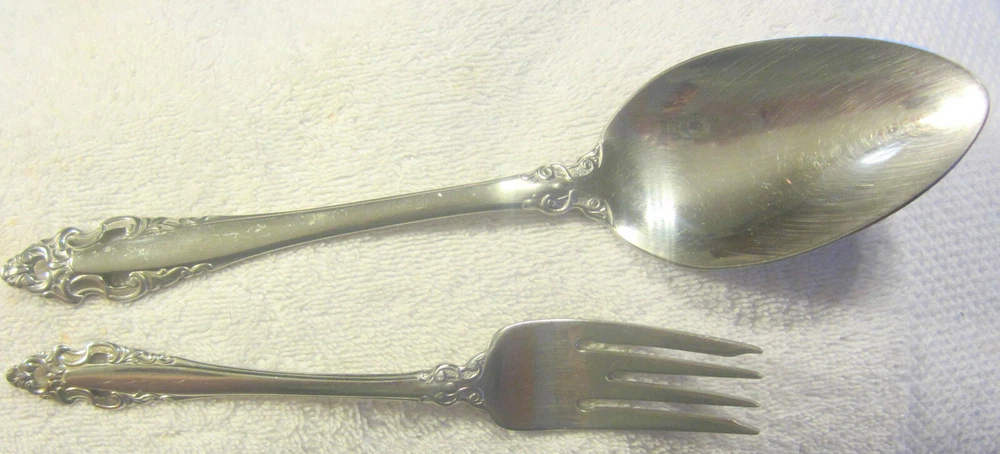 Culture:AmericanMPN:noneType:flatwareCharacter:naMaterial:Stainless SteelCountry/Region of Manufacture:UnknownDepartment:AdultsStyle:ModernSeller Notes:“Use wear but good usable shape.Some use wear as pictured.”Original/Licensed Reproduction:OriginalHandle Material:Stainless SteelColor:SilverSet Includes:Fork, SpoonTime Period Manufactured:1960-1969Brand:Gorham
