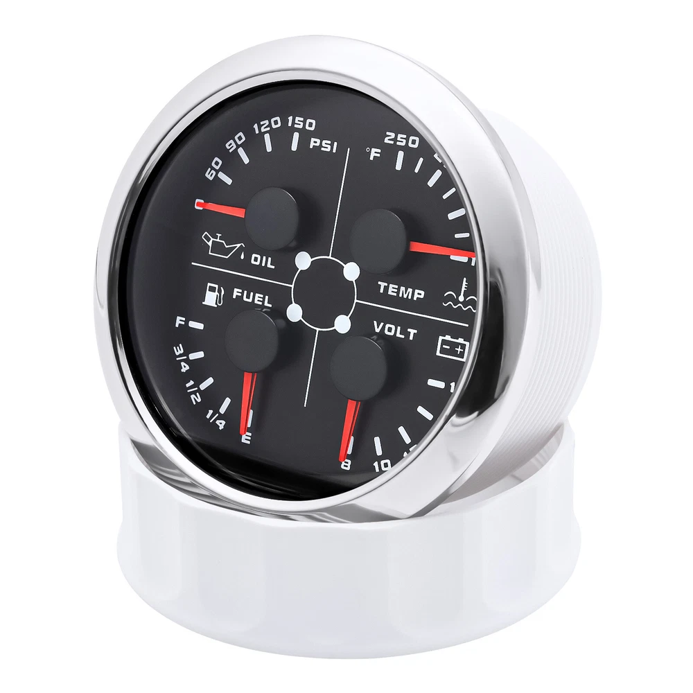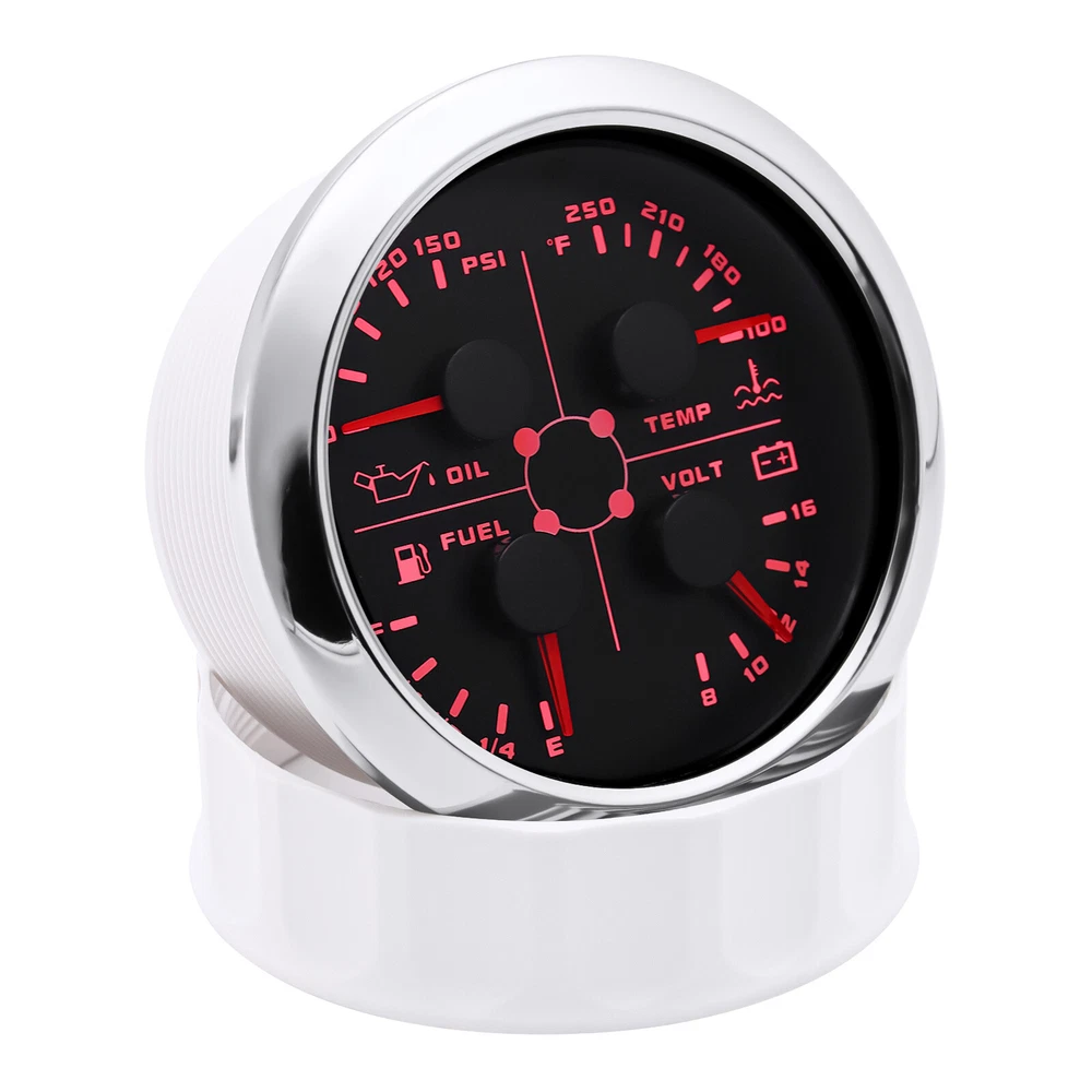 2 Gauge Set 85mm GPS Speedometer 0-200MPH & 4IN 1 Fuel/Water Temp/Oil Press/Volt 2 Gauge Set with Senders 85mm GPS Speedometer 0-200MPH with 85mm Fuel Level Water Temp Oil Pressure Volt For Car Boat Features: Suitable for all vehicles and off-road vehicles The signal comes directly from the satellite signal receiver(GPS Antenna), don't need other speed sensor. The gauge has the advantages of high precision, quick location confirmation and short start up time. IP67 waterproof and dustproof grade Reverse polarity protection and anti-fogging performance Stepper motors used for full range of stepping gauges, great feature with its less power consumption, longer life, higher precision, etc. Most importantly, the gauge is easy to setup, and can be used in all vehicles, boats and off-road vehicles. Speedometer Specifications: Application: Universal fit for Motorcycle/ Boat/Truck/Bus/Car Electronic Speedometer (stepper motor) No Mechanic Sensor, get speed signal from GPS Speed ≠0 and show accurate speed in tunnel with the help of accelerometer Total Mileage Adjustable GPS Blind Area Odometer Compensation OverSpeed Buzzer Alarm (Value Adjustable) Indication Light (Left, Right and High Beam Installation Diameter: 85mm (3 3/8") Speed Range: 0~200MPH RPM Range : 0~8000RPM Mileage Range: 0-99999.9miles Working Voltage: 12V/24V Working temperatures: - 40 to 85°C Protection rank: IP67 Waterproof Reverse polarity protection and anti-fogging performance 4 IN 1 Gauge Technical Data: Fixing dimension: 85mm Indicating Range: Oil press. meter: 0-150PSI Water temp. meter: 100-250℉ Fuel level meter: 0-190ohms/240-33ohms, empty-full; The signal can be adjusted Voltmeter: 8-16V Working Voltage: 12V Input Signal: 10-184ohms for 0-150PSIoil pressure meter; 0-190ohms for fuel level meter;(Default 0-190ohms, can adjust to 240-33ohms) 8-16V voltage meter; Input Signal 320-22ohms for water temperature meter Red backlight Protection grade is IP67, the whole body is completely waterproof; Excellent antifogging function; 316 Stainless steel bezel with curved glass; Convenient Installation by multi-plug socket connecting way; Accessories: matched with connectors, Installation Instruction Package Included: 1 x 85mm 4 in 1 Multifunctional Gauge 1 x 85mm GPS Speedometer Gauge 1 x GPS Antenna 1 x M16*1.5 Tacho Sensor 1 x 1/8NPT Oil pressure Sensor 1 x 1/8NPT Water Temp Sensor 2 x Cable 2 x Installation Instruction