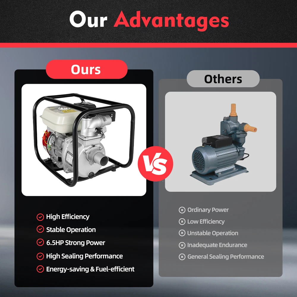 Description Are you still worried about watering your farm too slowly? This 6.5HP irrigation water pump will help you get your watering done very quickly and well. It has an aluminum pump body for greater durability and long service life. The extra power and large flow rate will allow you to work more efficiently. Key Features Great Durability: It is mainly made of high-quality aluminum and iron, and has undergone spraying and welding processes, so it has good wear resistance, corrosion resistance, high temperature resistance, and impact resistance, making it very sturdy and durable. High Efficiency: It adopts a powerful four-stroke OHV engine, which can generate more power. The 6.5hp, 210cc engine has a high speed of 3600r/min, achieving a 1271.33ft³/h hourly flow rate, 23ft self suctio 2" Inch 6.5HP Gas Water Semi Trash Pump Gas-Power Water Irrigation Transfer Pump 2" Inch 6.5HP Gas Water Semi Trash Pump Gas-Power Water Irrigation Transfer Pump Description Are you still worried about watering your farm too slowly? This 6.5HP irrigation water pump will help you get your watering done very quickly and well. It has an aluminum pump body for greater durability and long service life. The extra power and large flow rate will allow you to work more efficiently. Key Features Great Durability: It is mainly made of high-quality aluminum and iron, and has undergone spraying and welding processes, so it has good wear resistance, corrosion resistance, high temperature resistance, and impact resistance, making it very sturdy and durable. High Efficiency: It adopts a powerful four-stroke OHV engine, which can generate more power. The 6.5hp, 210cc engine has a high speed of 3600r/min, achieving a 1271.33ft³/h hourly flow rate, 23ft self suction height, and 92ft lift. and efficiently completing various irrigation and drainage tasks in a shorter amount of time. Long-term Endurance & Energy Saving: The 0.95gal fuel tank allows you to work for a longer time at once, saving you time and effort. A high-quality carburetor allows for better fuel combustion, ensuring a fuel consumption rate of 360ml/kw.h, and reducing fuel consumption. Good Heat Dissipation: The forced air-cooling system and the dense cooling holes in the casing dissipate heat quickly and promptly, which not only prolongs the engine's service life but also ensures that the engine will not stall even after a long period of operation. Thoughtful Design: The sturdy frame, quadrilateral base, and enlarged anti-slip pads provide greater stability and effective vibration reduction, ensuring better performance in harsh environments. Easy Operation: The design of manual start, one-click shutdown, and controllable speed simplifies various operations while ensuring safety, making it easier and more reassuring for you to use. Low Noise: The quality silencer can effectively alleviate the noise generated during the operation process, control the noise within an acceptable range(about 96dB), and provide a comfortable working environment. Protective Package: To prevent the product from being damaged and bumped during transportation, we packed it with sponges, bubble bags, plastic bags and carton to protect your products to the maximum extent possible. Customer Service: Communication is the best way to solve problems. If you have any problems, please feel free to contact us. We will reply and solve the problem for you as soon as possible. Details Enlarged Inlet and Outlet: Its inlet and outlet have been enlarged to a diameter of 2 inches, which allows for a larger flow rate for a wider range of watering and suction. Air & Water Filters: The filters can effectively isolate impurities in water and air, prevent blockage of water pipes and water pumps, and improve working efficiency. Snap-on Fuel Tank Cap : It makes the fuel tank seal better, reduces evaporation, and saves fuel. Application It can be used for agricultural irrigation, treatment of industrial wastewater, tunnel drainage, road cleaning, alpine water conveyance, flood control and drainage, engineering construction, water extraction from machine wells, fire-fighting water, fishpond aquaculture, and so on. Initiation Step Switch to "ON". Connect the inlet hose and filter. Close the damper and open the gasoline switch. Start the machine. Open the damper. Adjust the speed control seat. Water Pipe Installation Step 1. Place the gasket in the joint. 2. Rotate to install the joint and tighten it. 3. Install the water pipe clamp. 4. The installation is completed. Specifications Material: Aluminum, Iron, Plastic Process: Spray Molding, Welding Color: Red Engine Type: Single-cylinder, 4-stroke, Air-cooled Starting Mode: Manual Power: 4.8kw Horsepower: 6.5hp Fuel Type: Gasoline Fuel Tank Capacity: 3.6L/0.95Gal Fuel Consumption Rate: 360ml/kw.h Engine Oil Capacity: 0.6L/0.16Gal Speed: 3600rpm Displacement: 210cc Noise: About 96dB Intake and Outlet Diameter: 5cm/2inch Pump Lift: 28m/92ft Pump Output: 36m³/h/1271.33ft³/h (9510GPH) Self-suction Height: 7m/23ft Product Size: 46.2*36*38.7cm/18.19*14.17*15.24inch Package Size: 50.5*40.5*40.5cm/19.88*15.94*15.94inch Net Weight: 18.45kg/40.68lbs Gross Weight: 19.8kg/43.65lbs Package Included 1* Water Pump 1* Inlet Pipe Connection 1* Outlet Pipe Connection 1* Sleeve Rod 1* Filter 4* Foot Pads 1* English Manual Other Accessories for Assembly Notes Please fill the pump head with water before starting to avoid damaging the pump head. The machine needs to be filled with gasoline and four-stroke engine oil before use to prevent cylinder explosion due to insufficient lubrication and overheating. Please do not use the machine indoors or in a damp environment. Please keep the product away from inflammable items. Please turn off the machine and do not smoke when refueling. Please do not add excessive fuel to avoid potential danger caused by fuel overflow. Please read the manual completely before use, and pay particular attention to the safety instructions included. Please all