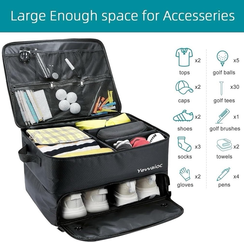 The 2 Layer Golf Trunk Organizer is a waterproof car golf locker with separate compartments, designed specifically for golf enthusiasts. This organizer is perfect for keeping gear dry and organized, with a black color that adds a sleek touch to any car. With its dual layer design and dedicated compartments, this trunk organizer is ideal for storing items like balls, club monogrammers, and other golf accessories securely while on the go.