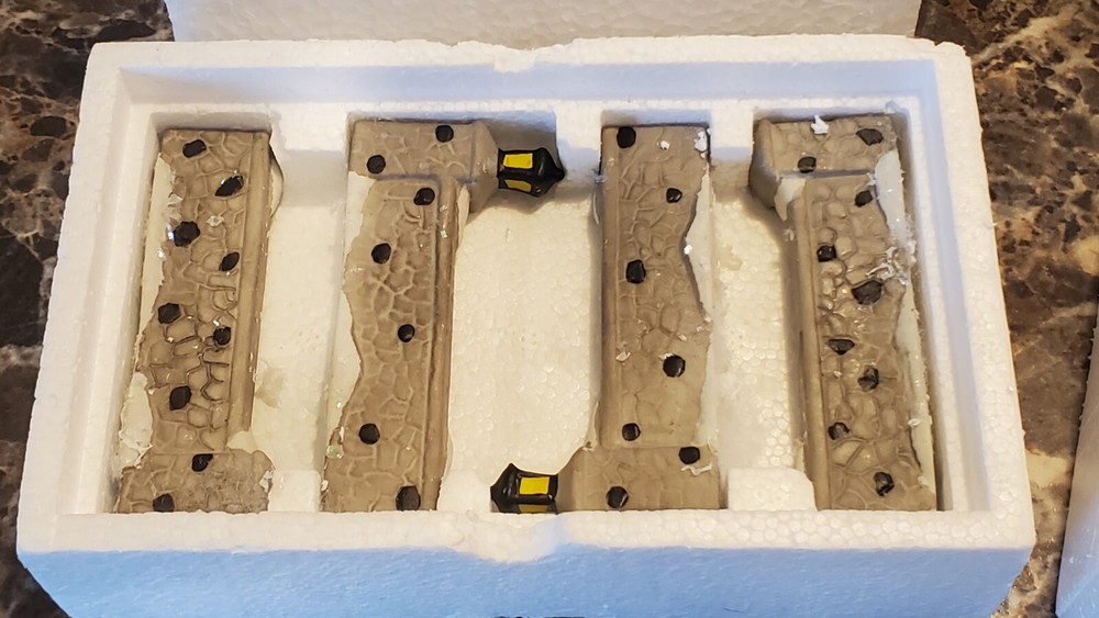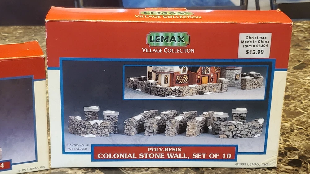 Both are in excellent condition..any other questions be sure to message me before buying..be sure to check out my other Lemax items as I bought out a huge collection..all orders are shipped within 24 hours after payment is received Add a touch of colonial charm to your Christmas village with this beautiful set of LEMAX stone walls. The set includes two porcelain stone wall sets, each hand-painted with intricate details and featuring a snow pattern. These walls are perfect for creating a cozy and festive atmosphere for your holiday season. The LEMAX collection is known for its quality and original designs, and this set is no exception. Made from durable resin material, these walls are built to last and will make a great addition to your collection. Get ready to impress your guests with this unique and original Christmas village set.