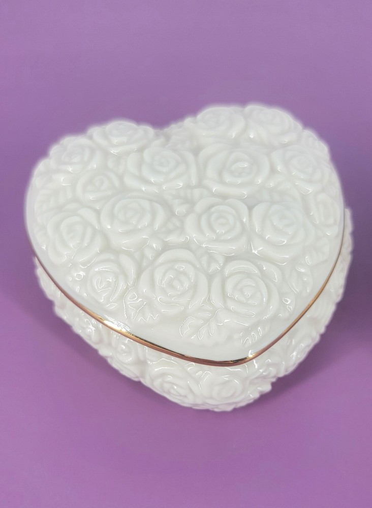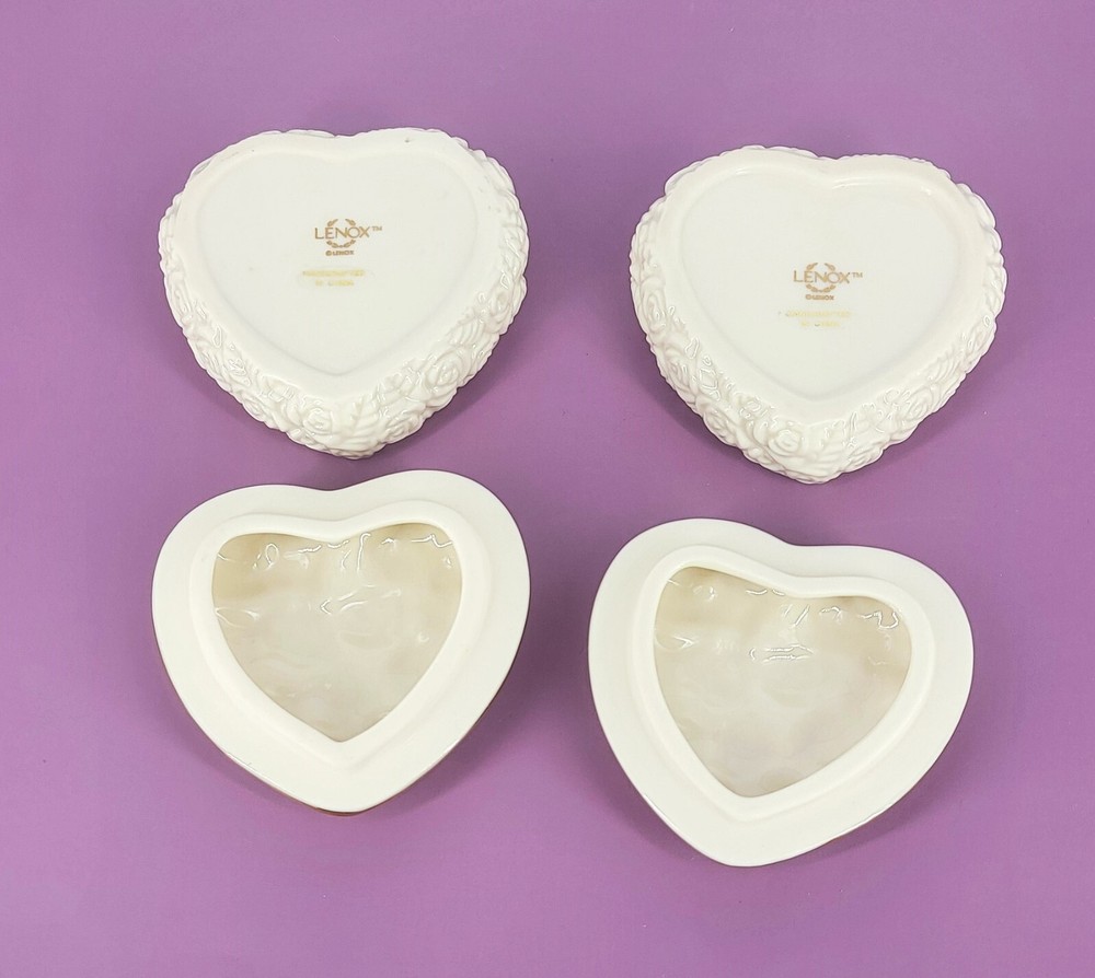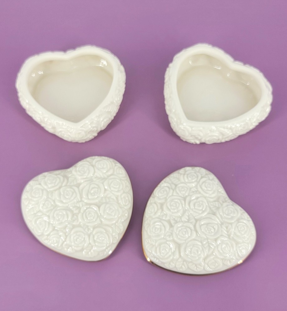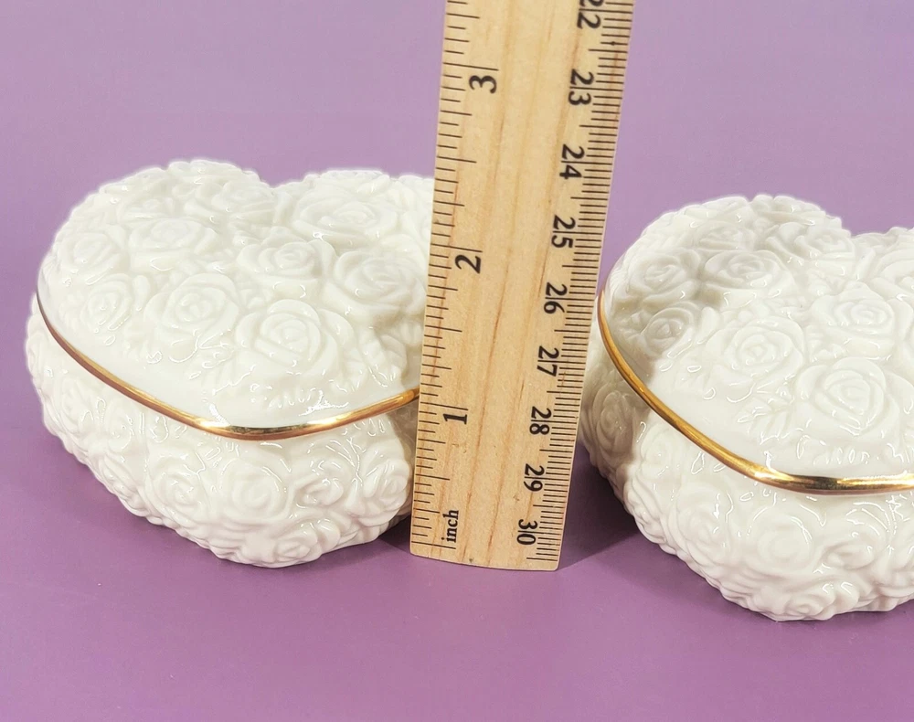 BRAND: Pair of Lenox Rose Covered Ivory Porcelain Heart Shaped Romantic Jewelry/Keepsake Dishes. Made in China. Loc/L3 COLORWAY: Ivory, Gold Metallic. SIZE: Approximately 1.5" Tall, 3" Long, and 3" Wide. CONDITION: Pristine, like new, pair of beautiful Lenox Porcelain rose covered heart shaped trinket/keepsake/jewelry covered dishes. Excellent quality and in beautiful condition. No signs of chips, cracks, crazing, or damage. Please see my photos for exact details. They are very romantic and make a lovely gift. Thank you so much for stopping by today and have a fantastic evening!