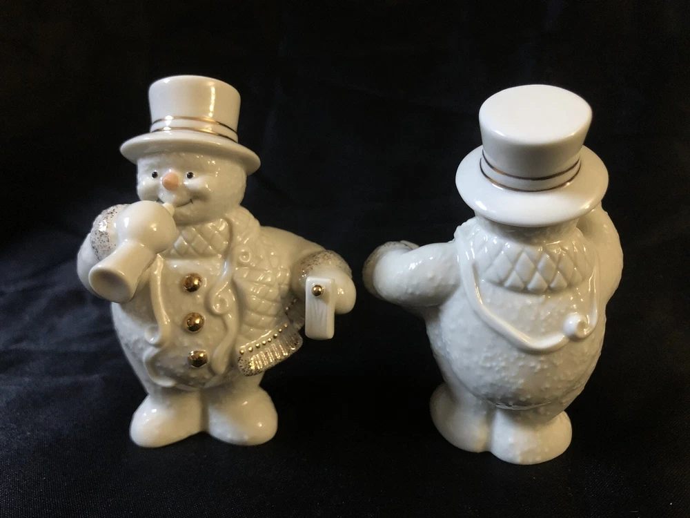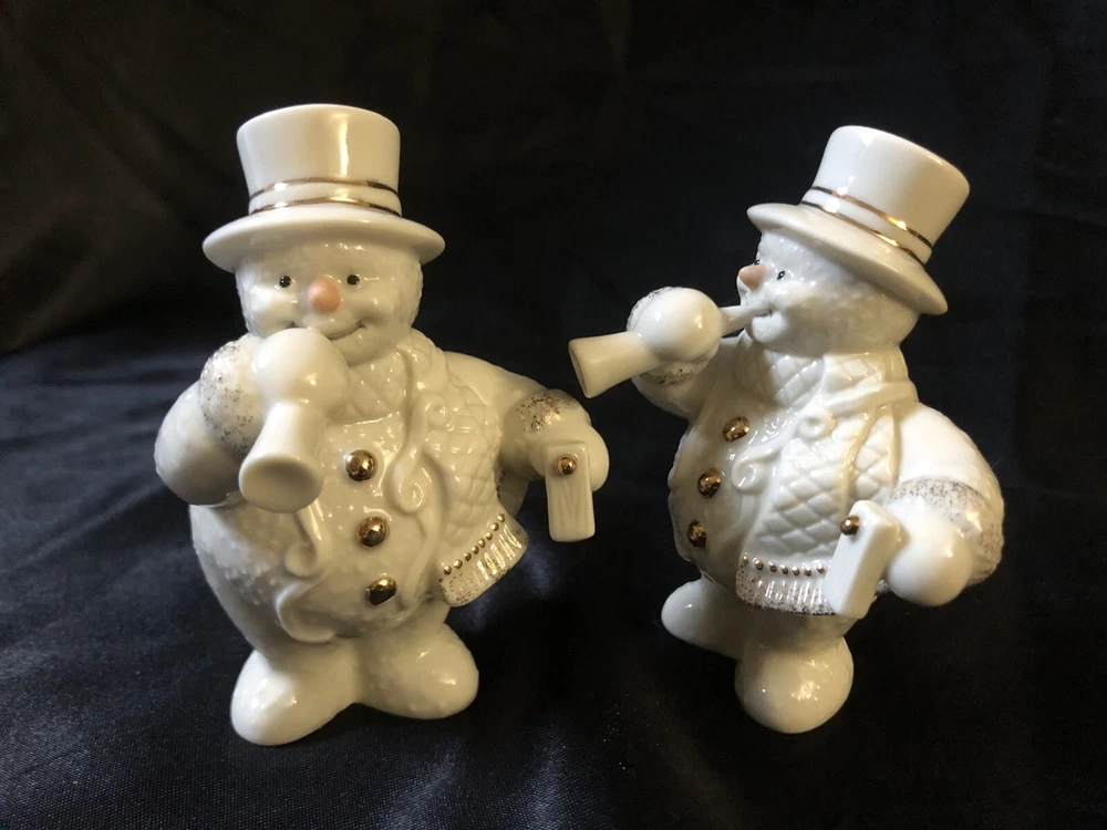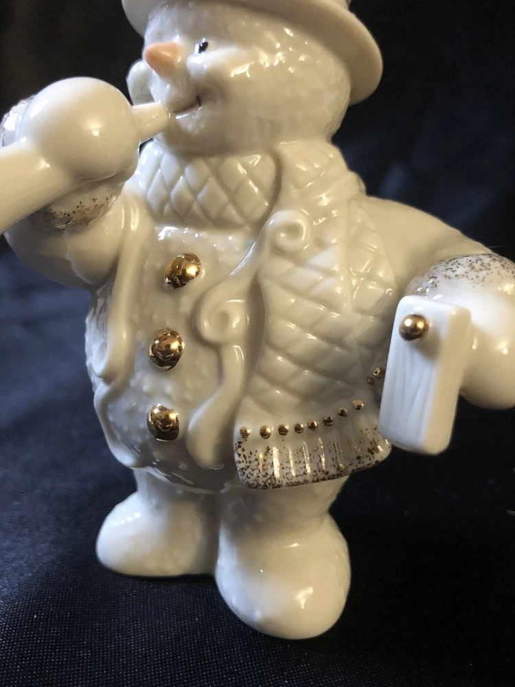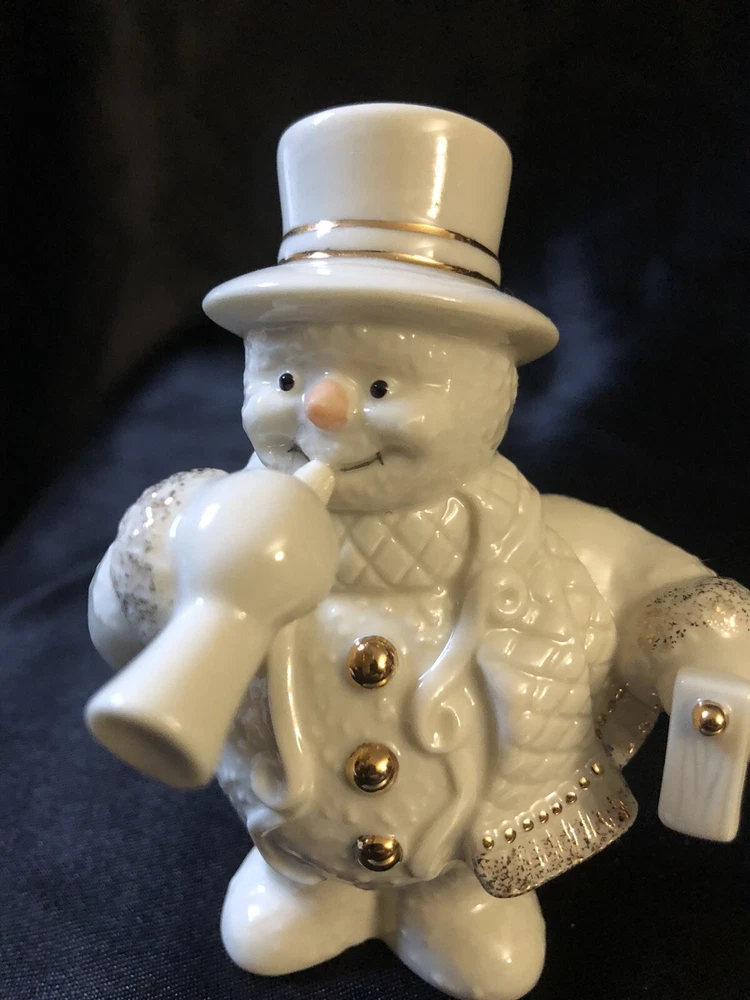 2 Lenox Snow Man Figures W/Top Hats Gold Accents/Hallmark Christmas/Holiday/Winter. Condition is Used. Shipped with USPS Priority Mail. These adorable little snowman are the perfect holiday accent. They are all dressed up and ready to party. There is a horn in their right hand ready to be blown and a noisemaker in the left hand. A confetti streamer is wrapped around his neck and back, like it just fell from the sky. There’s gold tone accents around the top hat,buttons,scarf,sleeves, and noisemaker. They are both marked Lenox in gold. Their is a sticker stating handcrafted in China. There are no cracks,chips, or repairs. Please see photos as part of description. Feel free to browse my other listings. Thank you for your time.