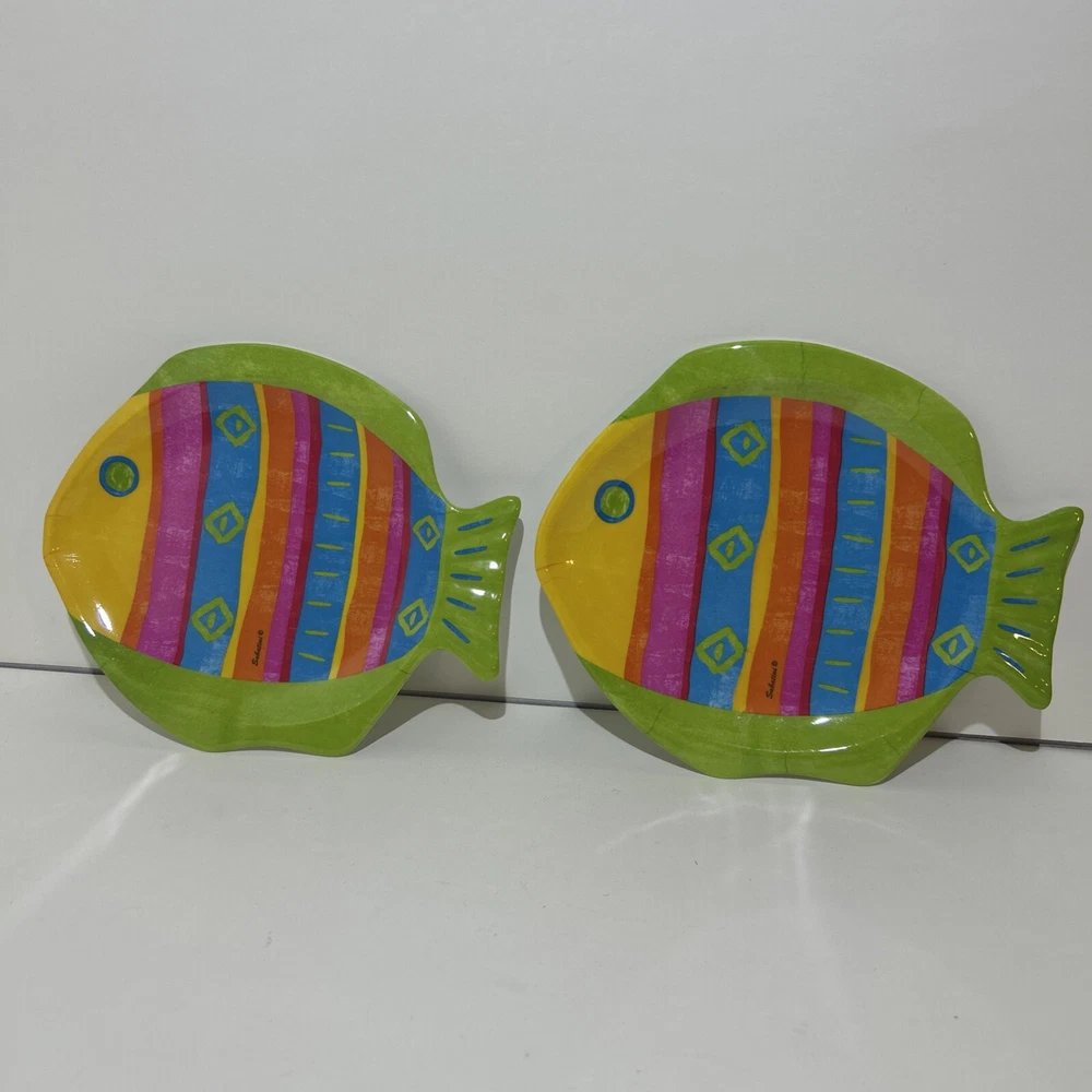 Add some summer vibes to your dining table with these bright and colorful fish plates. Made of durable melamine material, these salad plates are perfect for beach-themed occasions. With a 6-inch diameter, they are the ideal size for serving children or small meals The set includes two plates, so it's perfect for sharing with a friend or family member. These plates are great for summer parties or even everyday use. Bring the beach to your home with these fun and stylish plates that are sure to add some personality to your meals.