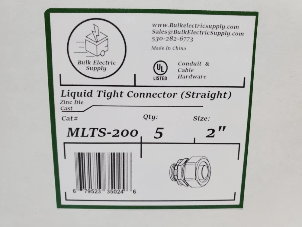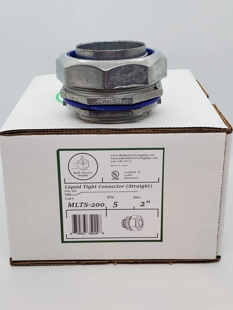 MPN: MLTS-200 Accessory Type: Conduit Fittings Brand: Bulk Electric Supply Conduit Type: Liquid-Tight Material: Zinc Die Cast IP Rating: IP66 Color: Silver Angle: Straight Country/Region of Manufacture: China Flexibility: Rigid