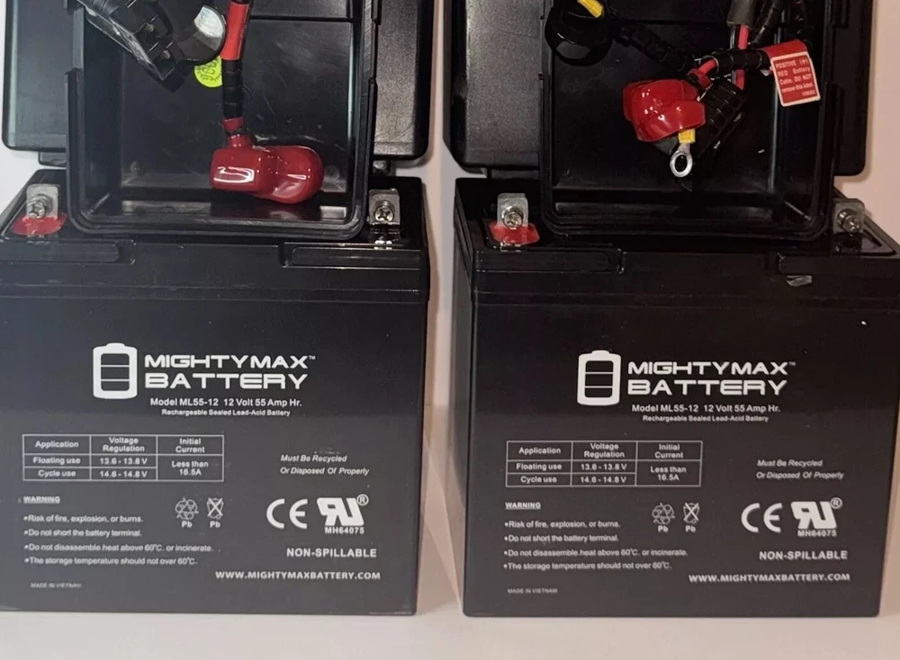 Get ready to power up your devices with the Mighty Max 12V 55AH Battery! Including 2 carrying cases that have adapters for easy plug into wheelchair! This rechargeable battery is perfect for use in alarm systems, back-UPS, hunting equipment, ride-on toys, scooters, and even medical mobility devices. With a voltage of 12V and an amp hours rating of 55Ah, you can be sure that your device will stay powered for longer. This battery is made by Mighty Max Battery and is designed to replace Sunrise Medical, Invacare batteries. It is a lead acid battery that is made in Vietnam and comes in a pack of two. Whether you're looking for a reliable power source for your medical mobility device or your ride-on toys, the Mighty Max 12V 55AH Battery is the perfect choice.