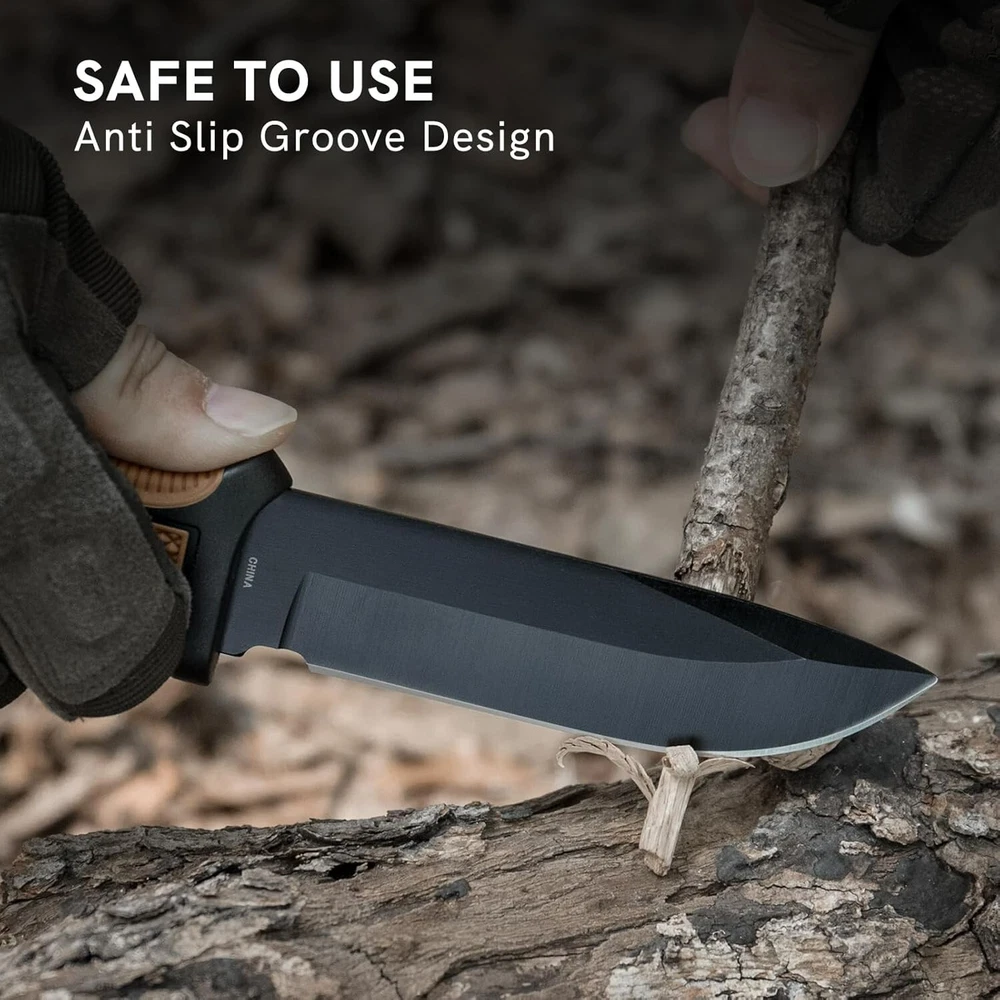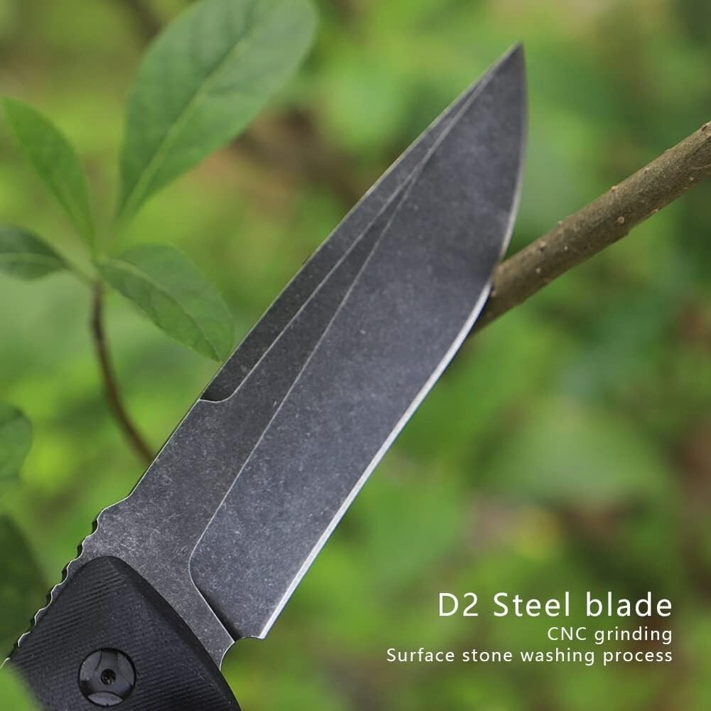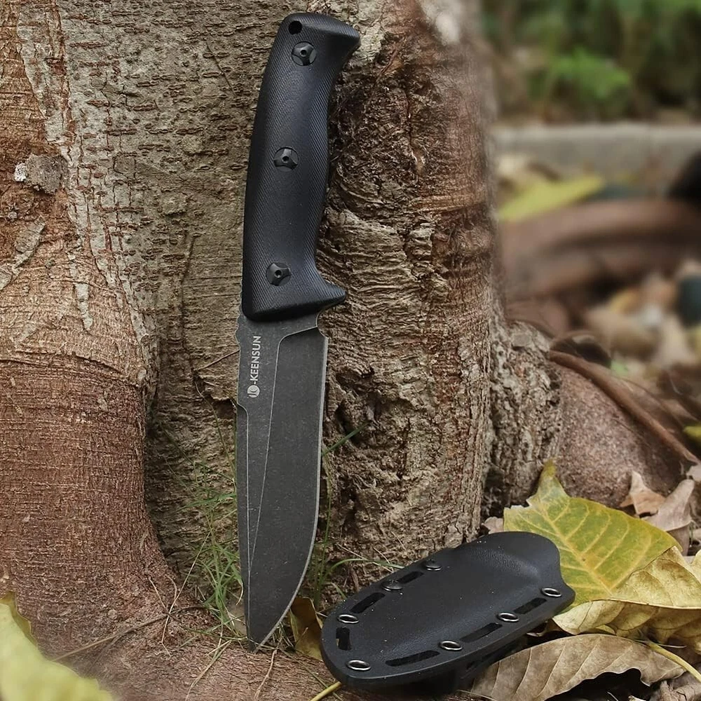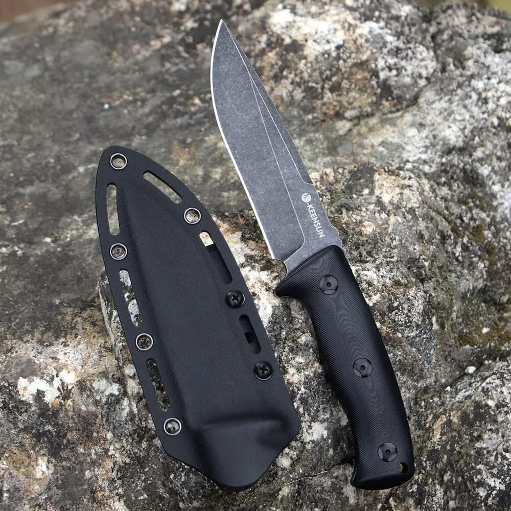KEENSUN Fixed Blade Hunting Knife with D2 Blade and Black G10 Handle Outdoor Survival Camping Knife Perfect Tool for Men, Good for Camping, Hiking and Outdoor Activities About this item Perfect Design: Fixed Blade Hunting Knife Overall length:10.2", Blade length: 5.2",Weight:11.16 oz, Blade Thickness: 0.19". High Quality: The fixed blade hunting knife blade is made of D2. The blades are hard and sharp with a hardness of up to 60 HRC. Blades in D2 grade are extremely tough and have excellent edge retention for extremely precise cuts. The surface is treated with titanium plating, which can effectively prevent rust. The handle is made of G10 (polymer composite material), which has super corrosion resistance and slip resistance. Beneficial for long-term use. Multi-purpose: Fixed blade hunting knives are versatile and ideal for outdoor activities such as hunting, camping, fishing and hiking. A perfect knife for outdoor adventures. Best Idea for Gift: This fixed blade hunting knife can be used as an ideal gift for boyfriend, husband, father, mother, wife and girlfriend on special days. If you're looking for a meaningful and unique gift for someone who loves hunting, outdoor adventures, travel and hiking, then our fixed blade hunting knives are perfect! Dispatch Tactical Fixed Blade Knife with Sheath, 9 Inch Survival Hunting Knives with Non-Slip Handle for Outdoor Camping, Hiking, Bushcraft, EDC About this item Premium Stainless Steel Blade: Crafted with high-quality stainless steel, the blade is sharp, durable, and rust-resistant Ergonomic Design: Our fixed blade knife features a comfortable handle with a non-slip grip for precise and safe handling Practical Sheath: The square-shaped sheath is both decorative and functional, easily attachable to a belt for convenient travel Compact Size: With a length of 8.9 inches and a 4.2-inch blade, it provides a balanced feel at 7.4 ounces Best Gift: Whether it's for avid hikers, campers, or hunters, this fixed-blade is nice gift