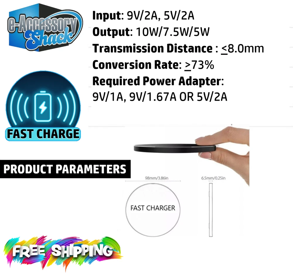 2 PACK Wireless Fast Charger Charging Pad Dock for Samsung iPhone Android Cell Phone Will charge most phones from empty to full in 3-4 hours or so as long as you use a 10w or higher power source. That means the power source's output is rated at 2A/5V or higher. 3-4 hours charge time is considered "fast" by most industry standards. Do faster ones exist? Yep, and I sell those too, in my eBay store at a higher price. This one for sale here is a very good combination of value vs performance. Go to bed at night and put your phone on this, it will be fully charged in the morning every time. I offer 60 day free returns for ANY reason. Buy with confidence. Specifications: Color: Black Output: 5W/7.5 W/10W Charging efficiency:>75% Charging frequency: 110-205 kHz The package includes: 2 x Wireless Fast Charger Pad 2 x 3ft Micro USB Cable Power Source is NOT included, but I sell them in my eBay store if needed. You'll save a % if you by 2 or more items from my store at one time, applied on last page of checkout. Typically it's 1% off for 2 items, 10% off for 3 items, 21% off for 4+ items at one time.