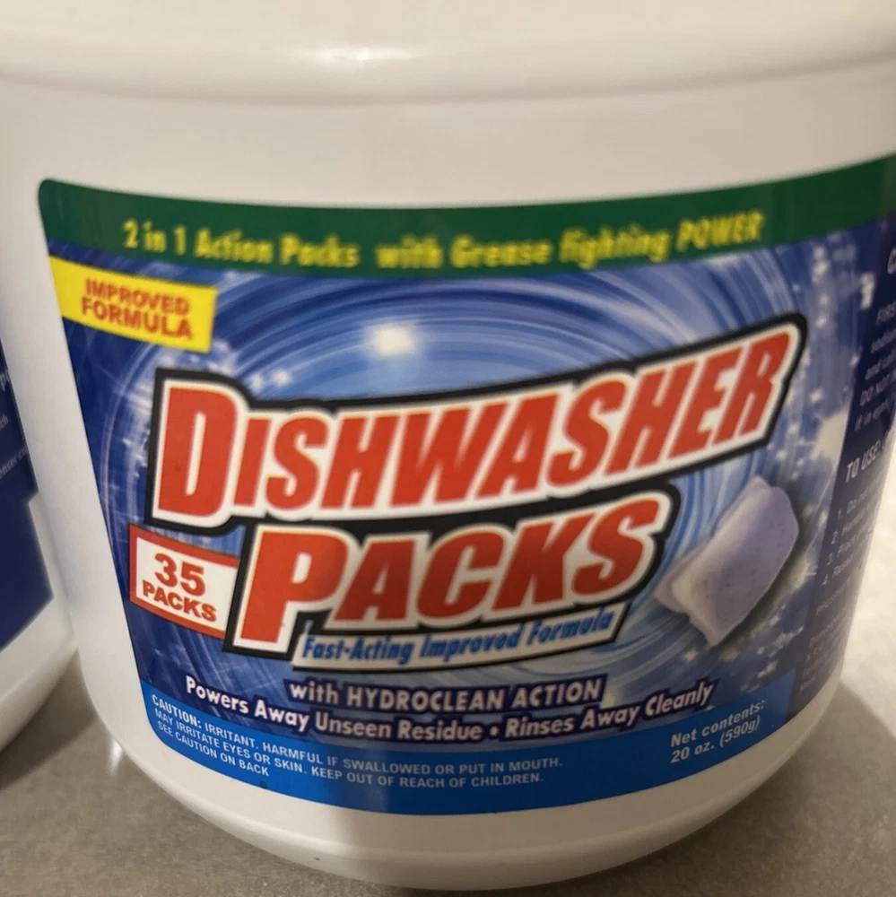 The product is a set of 2 packs of dishwasher packs, with each pack containing 35 pouches. These dishwasher packs are 2-in-1, designed for use in dishwashers to effectively clean dishes. They are scent-free and weigh 20 oz. Each pack is intended for single-use in a dishwasher and is convenient for households looking to keep their dishes clean and sparkling. Made in China, these dishwasher packs offer a hassle-free cleaning solution for daily dishwashing needs. Thank you for looking!