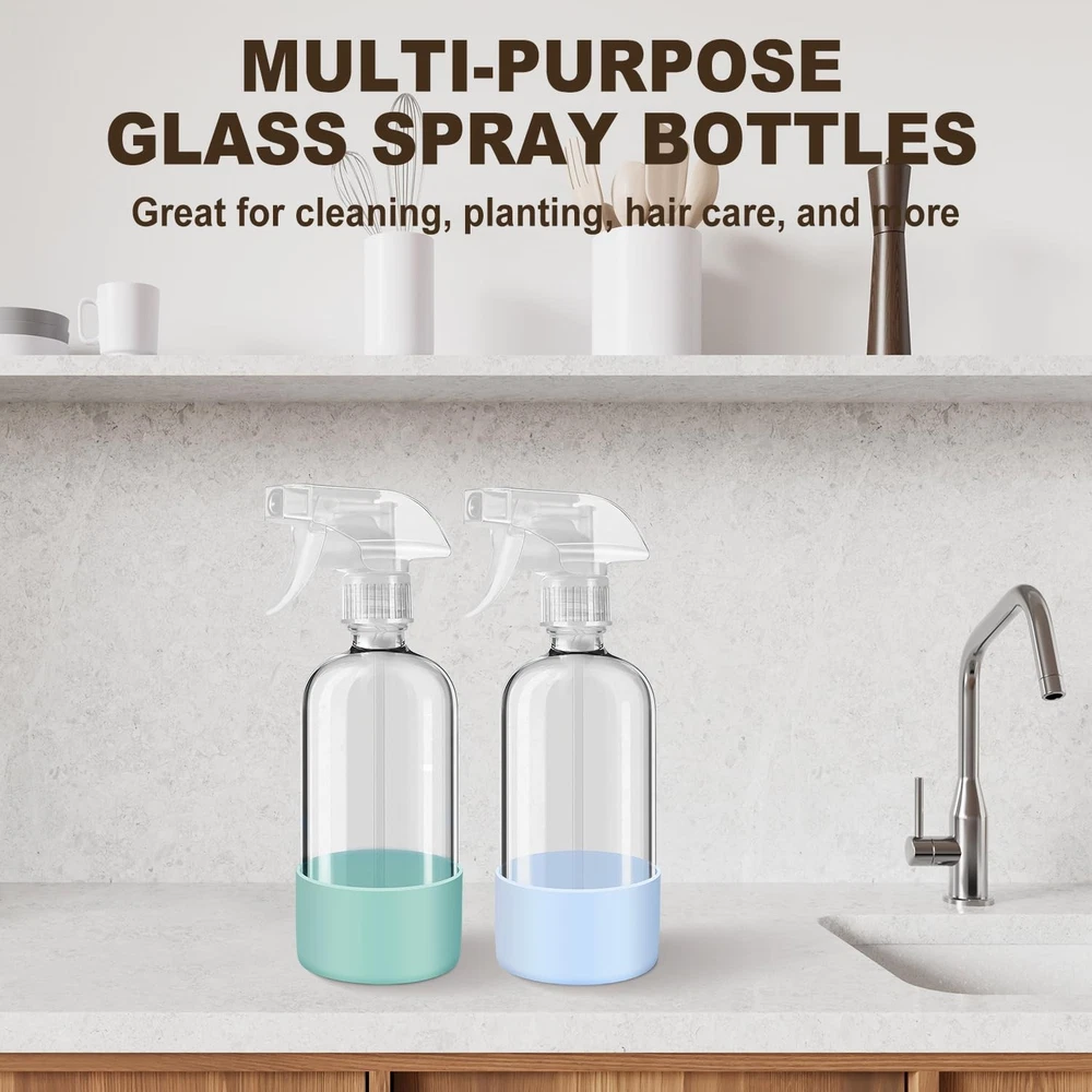2 Pack 16oz Glass Spray Bottles with Silicone Sleeves Mist and Stream NEW Product Details Style: Green & Grey MPN: BLGLA-G&G UPC: Does not apply EAN: Does not apply Color: Green & Grey Material: Glass Capacity: 16 Fluid Ounces Recommended Uses For Product: Cleaning Solution, Hair Care, Hand Sanitizer, Perfume, Plant Care, Water Number of Items: 2 Product Dimensions: 3.2"W x 8.7"H Special Feature: Leak Proof, Refillable Item Weight: 0.74 Kilograms Included Components: Sprayers and Bottles Reusability: Reusable Part Number: BLGLA-G&G Item Weight: 1.63 pounds Item model number: BLGLA-G&G Style: Green & Grey Shape: Cylindrical Special Features: Leak Proof, Refillable Batteries Included?: No Batteries Required?: No Premium Glass Bottle & Silicone Protective Sleeve - Crafted from high-quality, lead-free, and BPA-free glass, this reusable spray bottle offers a safe, sustainable way to store and spray liquids. The sturdy silicone sleeve cushions the bottle from accidental drops and provides a non-slip grip for extra confidence during use. Its stylish pop of color also makes it a practical and attractive addition to your countertop or cleaning caddy. Chemical Resistant Heavy Duty Sprayer - Our sprayers are made from durable, all-plastic materials with no metal parts, making them more corrosion-resistant. They are BPA-free and eco-friendly, safe for use with bleach, vinegar, rubbing alcohol, and more, and have been validated by countless consumers. They are perfect for both home use and commercial or industrial applications. 3 Modes (Fine Mist, Solid Stream & Turn Off) - Easy to hold and spray, these sprayer bottles feature a smooth nozzle adjustment for mist to stream. They deliver a gentle mist that won't harm delicate plants and a solid stream up to 10 feet, catering to different scenarios. Leaks and Clogs Free - With a single twist of the 360 cap closure and an O-Ring inside, you can ensure your contents are securely locked in, making the spray bottle 100% leakproof. It also features a tight seal to prevent any liquid from dripping out. Multipurpose - Designed for daily use, great for small jobs around the house: Cleaning solitions, spraying indoor plants, hair spraying, essential oils spray, a mixture of water and vinegar for cleaning, car detailing, hair spray, dog training, and cat behavior correction spray. They can also serve as food-grade BBQ spray bottles for smoking, cooking, and more. (Comes with a Funnel for Easy Filling)