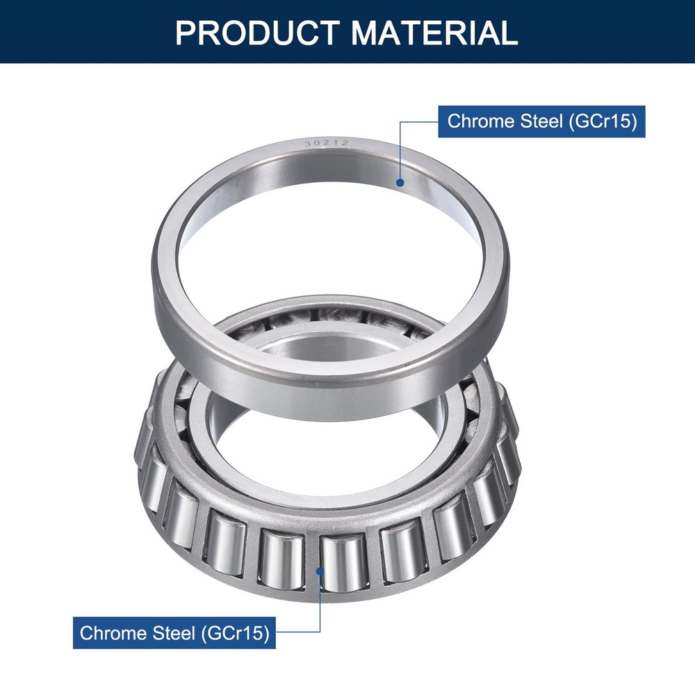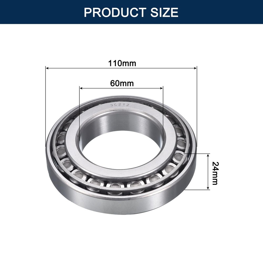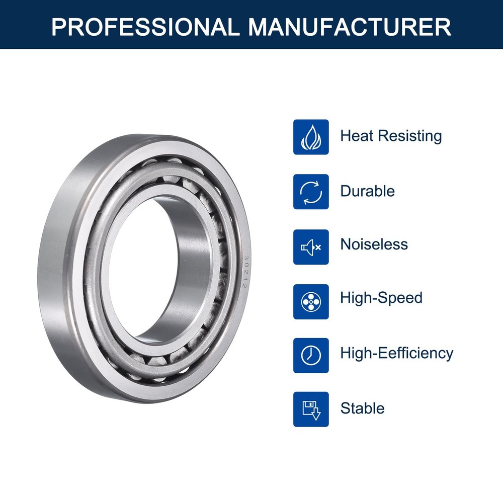Description: The 30212 bearing is a Precision Tapered Roller Bearing in a Set of Cone and Cup. This is the most basic and most widely used type of Tapered Roller Bearing. It consists of two main separable parts: the cone assembly (inner ring) and the cup (outer ring). It is typically mounted in opposing pairs on a Shaft Wheel Bearing Assembly. Our Tapered Roller Bearings provide enhanced performance in demanding applications and are pre-lubricated with light oil to ensure they are ready to use upon arrival. Feature: Single Row Tapered Roller Bearings are designed to accommodate combined loads. These bearings consist of an inner ring (cone), an outer ring (cup), a cage and rollers, which distributes radial and loads evenly across the roller. The inner ring with roller and cage assembly (cone) can be mounted separately from the outer ring (cup). The separable components are interchangeable, which facilitate mounting, dismounting and also maintenance inspection routines. This single tapered roller bearing is for use in high-load, moderate-speed applications that include conveyor systems. Specification: Model: 30212 Meterial: Chrome Steel Bore Dianeter (d): 60mm Outside Diameter (D): 110mm Total Thickness (T): 24mm Package Content: 2 Pack x Tapered Roller Bearing Cone and Cup Set Model: 30212 Tapered Roller Bearings,(I.D.=60mm, O.D.=110mm, Thickness=24mm); Pre-lubricated with light oil to ensure they are ready to use upon arrival. Material: The Taper Bearing made of chrome steel (GCr15) provides outstanding durability and the capacity to withstand heavy radial and axial loads. Enhanced Durability: By adopting a tapered roller design, the bearings achieve reduced friction and wear during rolling, ultimately improving lifespan and performance while lowering maintenance costs. Features:Tapered Roller Bearings has different angles between the inner and outer rings, enabling them to accommodate angular misalignment between shafts and housing, making them versatile for various installation conditions. Application: 30212 Tapered Roller Bearings are used in a range of applications from Agricultural Machinery to Conveying Equipment, Electric Motors, Trucks, Mining Equipment, Robotics, Dental Equipment, Gear Drives, Elevators, Rolling Mills, Ship Rudder Shafts, Aggregate Crushers, among others.