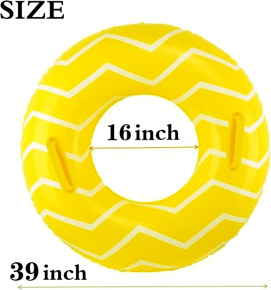 About this item PACKAGE INCLUDING: Comes with a Big Yellow Pool Inner Tube with handle, a Big Pink Pool Tube with handle, and 2 Pcs vinyl pool repair patches included. UNIQUE DESIGN AND PERFECT SIZE: Each swim tube float has an inflated size of about 39 inches, It’s suitable for adults teenage and older kids. Recommended for ages 9 years and older. Nice wave design will make you attractive in the pool. PREMIUM QUALITY: The swim rings are made of strong, non-toxic and thickened PVC material, more sturdy and more durable than any other products in the market, solid enough for the play in summer season. makes you safe when you swim. ENDLESS SUMMER FUN: Our inter tubes for pool with handles are ideal Pool floats for pool as perfect pool and beach parties for children and adults summer fun, summer pool party decorations, swimming pool games, pool toys, floaties, party favors, summer-themed parties, activities, birthday parties. It must create a summer-unique atmosphere to your great holiday.