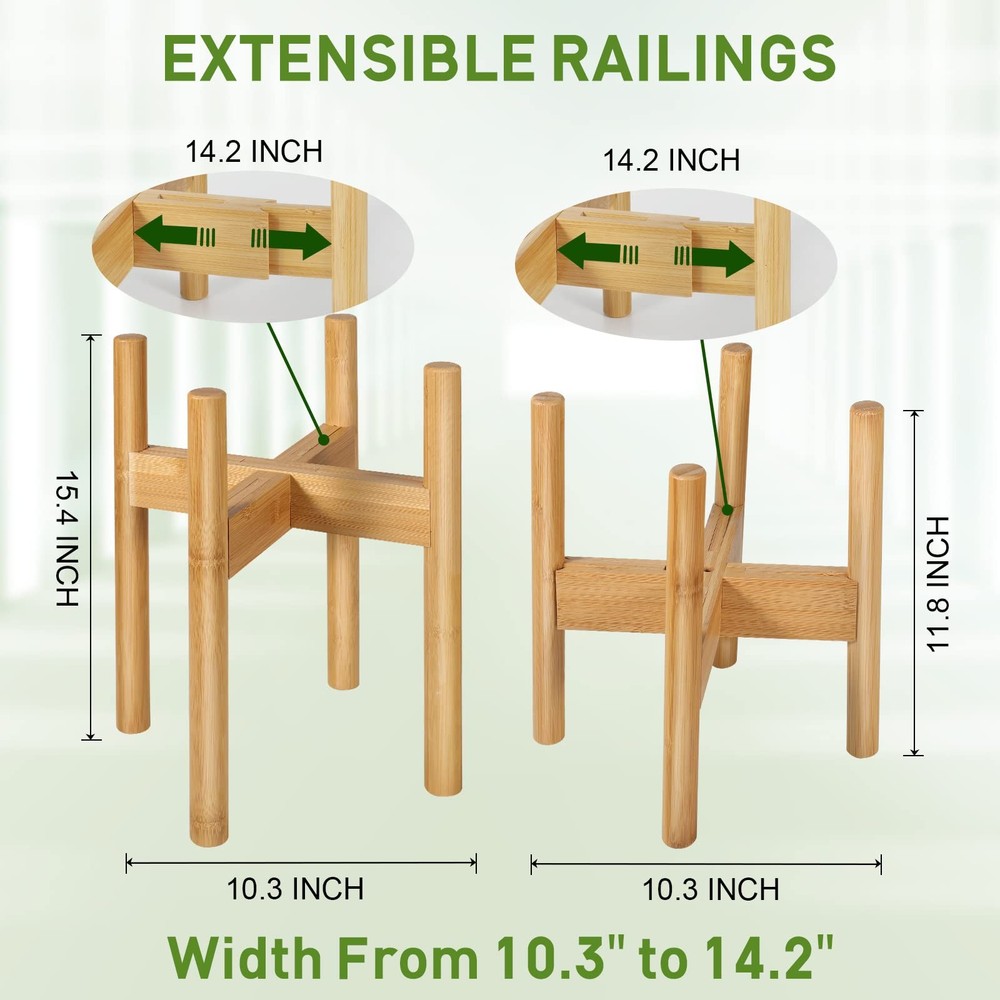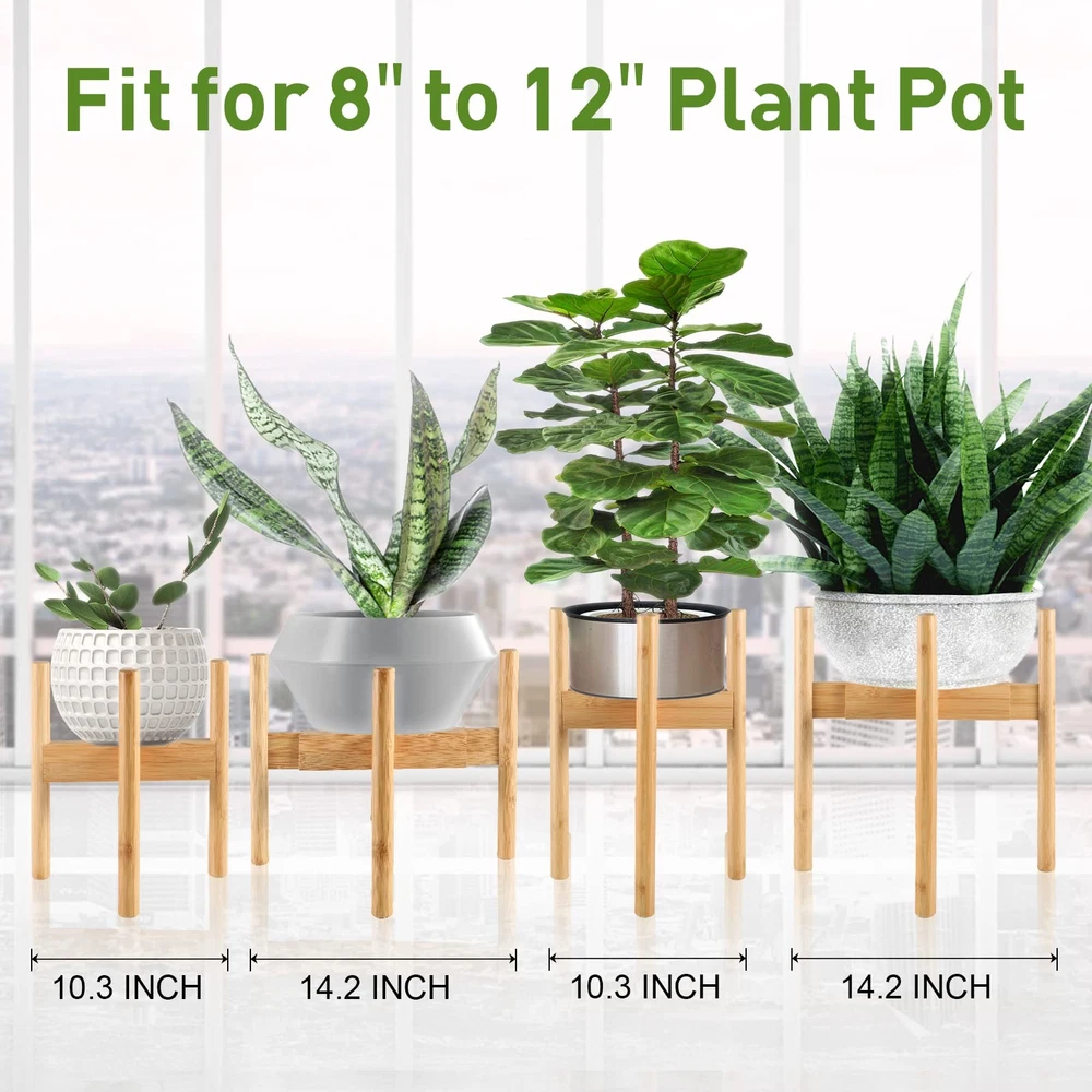 Our plant stands are made of pure natural bamboo and wood, a renewable resource, and the natural tones add a touch of nature to your home. The minimalist design lifts your plants off the ground, allowing better airflow and avoiding dirt and water staining the floor. The reason why it is popular with the public depends on its functions and advantages. Our bamboo is less prone to cracking than solid wood, and it does not shrink or expand in wet or dry conditions. Elevate your indoor and outdoor garden decor with our premium bamboo plant stand which is made of exquisite, strong, lightweight, and durable bamboo material, this plant stand is built to last. Plant stands come with floor pads to prevent slipping and is safe for your family members. The stylish mid-century design makes it a perfect addition to any room and is suitable for various houseplants such as fiddle leaf trees, aloe, cactus, and more Economical and Affordable Two Pack Set: You'll receive to pack mid-century bamboo plant stands that can meet a multitude of your decorating needs Full Adjustable One Size Fits All: Get one that fits different sizes of pots, from 8 up to 12 inches; no need to worry about your current pot size; move the rails inwards or outwards to accommodate a large or a small pot Effortless Assembly and Easily Adjustable: Our plant stand is designed for easy setup with minimal effort required. It takes only a few minutes to put together and secure the screws. Insert and tighten the screw with the allen key which is provided and you're done Strong and Sturdy: The bamboo plant stand is made from bamboo and can support pots and plants weighing up to 150 lbs regardless of what size you have the stand adjusted to, making it a more robust indoor plant stand. With this option, you can spruce up your classic or mid-century modern décor. It’s also ideal for bohemian and rustic décor accents in your living room, foyer, and hallway Sturdy & Heavy Plant Pot Friendly:The H-shaped rigid construction will not collapse or distort even when bearing extremely heavy pot; four anti-slip legs of 1" in diameter enhance friction and keep the stand sturdy & non-slippery
