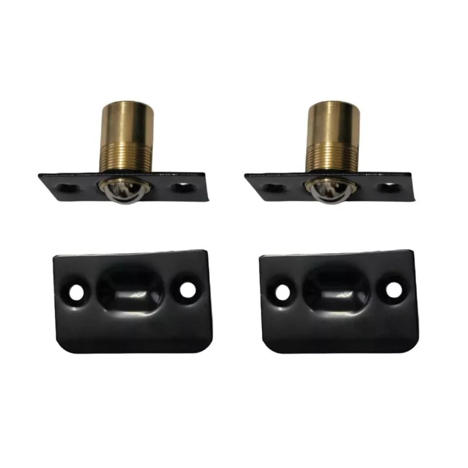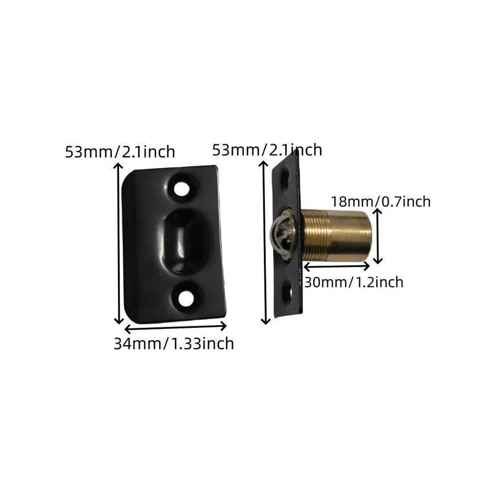 2 Pack Ball Catch Door Hardware French Door Ball Catch Closet Ball Latch for Top Features: All Metal Ball Catch: Brass bullet drive in ball catch securely holds interior door closed and is nearly hidden from view. Generally used on closet doors where a latch is not used or needed. Stainless Steel And High Quality: Forged stainless steel castings, heavy-duty springs, and precision engineering make this ball latch an exceptionally solid and timeless choice.Ensure lifetime up to 20000 times. Dual Adjustable Features:Ajustable Length: Rotate the brass ball body of the catch can adjust the length of the ball to suit door seams of various thicknesses. Adjustable Compression Force:Rotate the bottom of the catch can adjust the strength of the bouncing ball to control the compression force. Dimension Guide: Faceplate measures 1" W x 2 1/1 3" H. Cylinder measures 7/12" diameter x 1.2/1.0" deep. Matching strike plate measures 1 3/8" W x 2 1/8" L. Fastening hardware included. Package content:All Metal Ball Catch Door x 2;2 x Faceplate;2 x Strike Plate;Screws (Please measure the size before drilling the hole for the ball latch) Description: Ball Catch Door Peculiarity Product Name:Ball Catch Door(2 Pcs Black) Product siz:Mortise Plate Size: 2.1/1.3" High x 1" Wide Strike Plate Size: 2.1/1.0" High x 1.3/0.8" Widee Color:Black Material: Stainless Steel + Brass. Lnstallation: Screwed In. Screw Hole Distance: 1 1.5/2.0"(38 mm ) Package Content: Door Ball Catch x 2 ·Screws X8 Installation guide 1. Mark center and screw locations for catch. 2. Drill 5/6.4 inch pilot holes for screws. 3. Drill a 1.3/1.6 in pilot hole 1-5/0.8 inch deep for catch. 4. Lnstall and tighten screws. 5. Mark center and screw locations for strike. 6. Center area must be mortised. 7. Drill 5/6.4 inch pilot holes. 8. Lnstall and tighten screws.