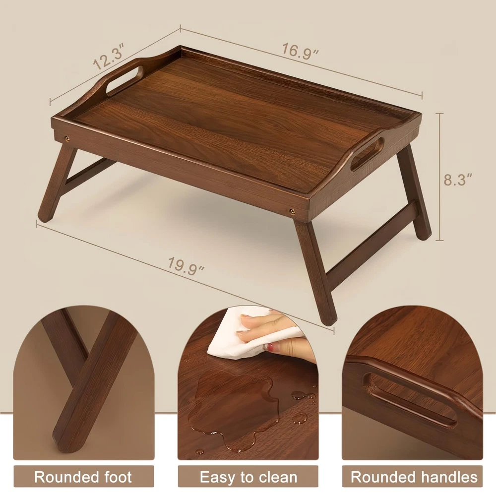 Bed Tray Table Breakfast Trays Serving Tray Bed Tray Table Size - Foldable leg design,Tray Dimensions(Folded legs): 16.9"L x 12.3"W x 2.4"H. Table Dimensions(Opened Legs): 16.9"L x 12.3"W x 8.3"H. Fits up to 10'' tableware. Material - This breakfast tray is made of natural bamboo. Bamboo is strong, environmentally friendly, healthy, durable and smooth. It is a renewable sustainable material. Save Space & Prevent Leaks - The foldable legs allow the tray to lay flat, saving more space when storing. Surrounding tray lips prevent items from falling over. Multifunctional - Ideal for breakfast, dinner, laptop table, hospital dinner plate, also can be used for writing or drawing table work, reading on bed or sofa, internet notebook, writing journal etc. Easy Clean and Portable - Hand wash with mild soap and warm water, wipe with a damp cloth, and occasionally use bamboo oil to prolong the life of the tray. An included handle makes transporting food or other surface items easier.