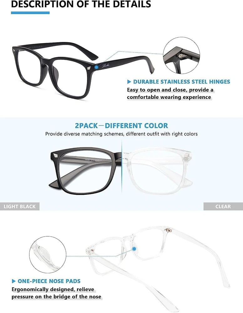 Elevate your screen time comfort with these stylish women's/men's eyewear frame blue light blocking glasses, designed to reduce eye strain and protect against harmful UV rays. Stay focused and comfortable with these anti-glare computer glasses featuring a women's eyewear frame, perfect for long hours in front of digital screens. Enhance your visual clarity and reduce eye fatigue with these transparent blue-light glasses, featuring a chic women's eyewear frame for added style and functionality. Protect your eyes from blue light and glare with these women's eyewear frame bluelight blocking glasses, designed for screen protection during work or leisure activities. Upgrade your digital experience with these non-prescription anti-blue light glasses, featuring a sleek women's eyewear frame for a fashionable and protective solution against digital eye Excellent TR90 Material - Ultra-lightweight and flexible TR90 nylon frame material for durability and comfortable long-term wearing. Casual frame design keeps you looking professional and stylish while working or playing video games Product Description The Livhò brand was founded in Milan in 1999 by the Italian company RTL. The founder was visual protection expert Alessandro Zocchi and family fashion designer Marco Masini. The Livhò brand mainly develops and designs fashionable sunglasses, outdoor sports sunglasses, and visual protection type glasses. Livhò adheres to the avant-garde fashion design concept and pays attention to visual health protection. Our mission is to bring you a healthy and wonderful visual experience! Livho premium blue ray cut lens, safeguard your eyes and reduce digital eyestrain from screen time so For better work and better life, brings you enjoyment of digital life. Do you have trouble to fall asleep and wake up tired regularly? Do you suffer from fatigue and headaches from daily screen time? Livho Can Help You. What You Get From LIVHO? √ Blue ray blocking -- Glasses lens are designed using the American HEV-Adsorb substrate absorption technology.It can absorb high-energy blue light. √ Clear lens -- The lens was made of a fully transparent base, without adding any pigment, while maintaining high light transmittance. Less reflective,no affect reading, and almost no color difference. √ UV protection -- Anti-Blu-ray Lenses utilize special U.S. substrate processing technology to protect the eyes from ultraviolet radiation and block UV400. Blue light blocking capacity test Use the blue light torch to beam the blue light testing card and Livho glasses as shown in the first picture. We can see that one part of the testing area directly beamed by blue light has turned blue, and the other part shaded by Livho Glasses has not turn blue. Thus we can see, Livho blue light filter glasses can block most of the harmful blue light and protect your eyes. Minimize headache Do you suffer headaches from long time screen time? Livho blue light blocking glasses will supercharge your health by blocking detrimental blue light while letting in all other beneficial light. Better Life Exposure to high rate blue light will impact our sense of circadian rhythms and wreck our internal rock, then cause insomnia. Wearing livho blue light filter glasses will improve your sleep, help you sleep better and feel good everyday Anti eye fatigue Long time exposure to blue light would lead to digital eye fatigue. Wearing your livho glasses, no more tired eyes. Reduce eye strain and sensitivity to light when facing digital screens. Great for office workers or anyone who has to look at screen all day. Add to Cart Add to Cart Add to Cart Customer Reviews — — 4.3 out of 5 stars 3,950 4.3 out of 5 stars 6,810 4.3 out of 5 stars 9,800 4.5 out of 5 stars 4,778 Price — — $25.00 $ 25 . 00 $17.98 $ 17 . 98 $17.98 $ 17 . 98 — Value 17.99 16.99 25.00 19.98 19.98 14.98 Blue light blocking ✓ ✓ ✓ ✓ ✓ ✓ Anti UV/Ray ✓ ✓ ✓ ✓ ✓ ✓ Anti Glare ✓ ✓ ✓ ✓ ✓ ✓ Anti Eyestrain ✓ ✓ ✓ ✓ ✓ ✓ Polarized No No No No No No Frame Material TR90 TR90 Metal Metal PC TR90 Lenses Material polycarbonate polycarbonate polycarbonate polycarbonate polycarbonate resin