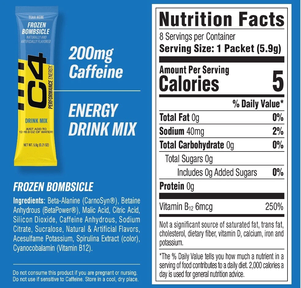 2 Pack C4 Performance Energy Powder Mix frozen bombsicle , 8 Sticks Each. Your favorite performance energy drink now available in an "on-the-go" drink mix! Formulated with 200mg caffeine, clinically studied ingredients, and carrying the NSF Certified for Sport® label, C4 Performance Energy® is the athlete’s choice for elevating performance. With ZERO grams of sugar or synthetic dyes, Strawberry Watermelon Ice delivers a freshingly cool and juicy taste with every sip. Explosive Energy: Fuel your performance with BETA-ALANINE (CARNOSYN®) and 200mg of caffeine. Zero Sugar: Made with zero sugar and no synthetic dyes, so you can perform at your best without compromises. Enhanced Endurance: Clinically studied to fight fatigue and power muscular endurance. NSF Certified for Sport: Trusted by athletes, C4 Performance Energy® is NSF-certified, ensuring it’s safe and free from banned substances. On-the-Go Convenience: 8 drink mix sticks in every box, so you can carry your C4 with you everywhere you go. Just mix with water for an easy, energy boost anytime you need it.