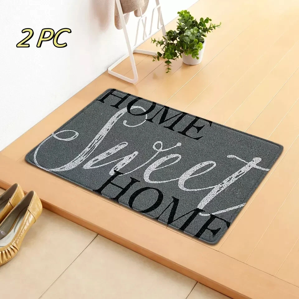 This product is a set of two rectangle-shaped door floor mats suitable for both indoor and outdoor use. They are multicolored and made of rubber material with a backing that is washable. The mats are designed for entryways and feature a durable construction for long-lasting use.