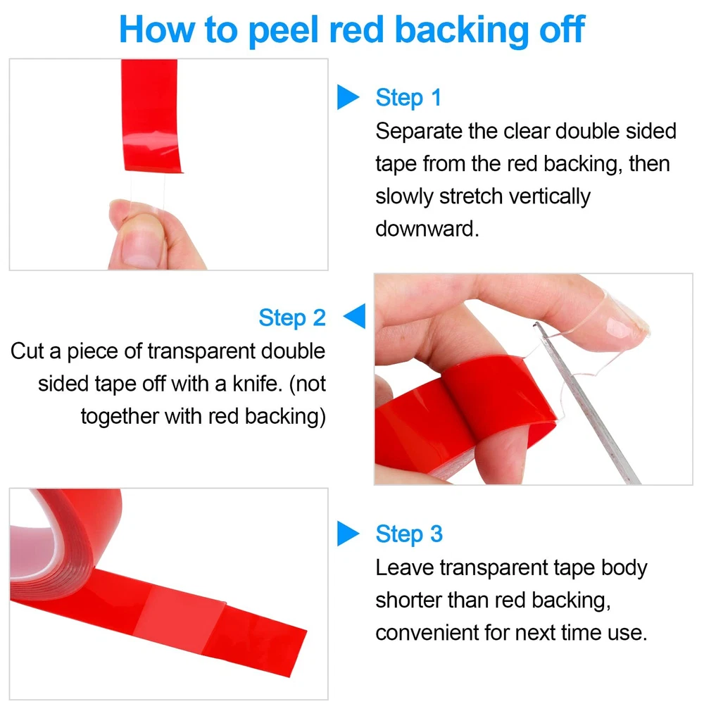 Double Sided Tape Heavy Duty Double sided adhesive tape works on wood/metal/paper/glass and more. Double side stick tape works for Car/Cellphone/Industry/LCD panel/Glass/Frame/Lens/Parts assemble and Electronic/Home appliance/Decoration strip etc. Specifications: Base material: Acrylic Color: Transparent / Clear Length: 20 feet / 6 M Width: 3/4 inch / 1.9 CM Thickness: 0.04 inch / 1 MM Elastic: Super good High/Low temperature resistance: -4 ℉~ 160 ℉ Package included: Packed of 2 roll acrylic double sided tape Widely Use: 1. Used in mobile phones, digital punch type paste; 2. Used for electronic and electrical products to prevent earthquakes! 3. Used in general car paste, nameplate paste, wiper paste, etc. How to peel red backing off: step 1: cut a piece of transparent double sided tape off with a knife(not together with red backing) step 2: separate the clear double sided tape from the red backing step 3: leave transparent tape body shorter than red backing, convenient for next time use How to peel red backing off: step 1: pinch a little piece and stretch of transparent tape(not together with red backing) step 2: cut a piece of transparent double sided tape off with scissors step 3: leave transparent tape body shorter than red backing, convenient for next time use Strong viscosity, Environmental protection, one roll 3/4" 20' acrylic clear heavy-duty double-sided tape, long-lasting coated with permanent adhesive, according to experience, please weigh 0.5 pounds per 1 square inch double sided tape. Note: Due to strong adhesion, please tear gently and carefully when tearing off the of double sided tape to protect the surface. High transparency, acrylic adhesive material double sided mounting tape, crystal clear, noneffects to appearance, especially suitable for glass decoration, the design of reserved red backing off helps you easy to peel, convenient for tape applying. Waterproof Weatherproof and Multipurpose, heavy duty adhesive double sided tape , high temperature and solvent resistance, fixed objects securely and rigidly, widely applied on smooth walls, doors, windows, carpet, glass, balcony, such as homes office wall decorations. Wall surface available and unavailable: double sided tape heavy duty, can be applied for a smooth surfaces, such as glass, metal, plastic, ceramic tile, wooden wall, marble. But not allow for uneven surfaces, such as wallpaper, dusty wall, brick wall, broken wall. WHAT YOU GET: Phinus Double Sided Tape 2 pack, our 7*24 friendly customer service for peace of mind.