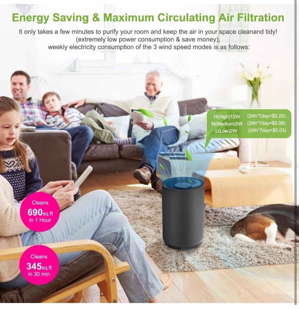 Application: Whole Room Filtration Technology: Activated Carbon, HEPA-Type, Pre-Filter, True HEPA Mounting: Floor Color: Black Contaminants Captured: Allergens, Bacteria, Chemicals, Cooking Oil Smoke, Cough & Sneeze Debris, Dust, Dust Mites, Exhaust Pollution, Lint, Mold, Odors, Pet Dander, Pollen, Tobacco Smoke Room: Any Room Voltage: 110 V Item Depth: 6.7 in Features: Fan Function, Filter Replacement Indicator, Portable, Quiet Operation Coverage: 690 sq ft (each) Filter Life: 3-6 months Model: Vhoiu Air Item Weight: 2.31 lb each Item Width: 6.7 in Item Height: 10.6 in Type: Portable Year Manufactured: 2024 Timer Control: 2H/4H/8H Brand: Unbranded Power Source: Electrical Control Style: Touch Operating Sound Rating: 20-53dB Number of Speeds: 3