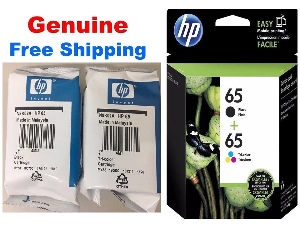 Payment | Shipping | HP 65 Black Tri-Color Ink Cartridge N9K04AN N9K03AN NEW GENUINE Item Description This is a brand new Genuine HP 65 Black Tri-Color ink cartridge in bulk packaging Brand new from HP, never used and not refurbished or remanufactured. For use in ▶ HP AMP 100 120 125 130 ▶ HP DeskJet 2600 2620 2621 2622 2623 2624 ▶ HP DeskJet 2630 2632 2634 2635 2636 2652 2655 3720 ▶ HP DeskJet 3721 3722 3723 3730 3732 3733 3735 ▶ HP DeskJet 3750 3752 3755 3758 3760 3762 3764 ▶ HP ENVY 5000 5010 5012 5014 5020 5030 5032 5034 5052 5055 5058 Item will arrive in HP factory sealed foil bags Box picture is for reference only. Important 1.We stand behind our products. Items can be returned for exchange or full refund within 30 days from the date you receive your merchandise. 2.Your order will be shipped within 1 business days once we receive your payment. If you pay by e-check, we will ship your order once your payment is cleared. 3. If you have any problems with your order, please contact us before you leave a review. We will take care of your request immediately. *** Any warranties for this product are fulfilled by the seller and not by the OEM. Payment Back to Top Shipping & Handling Back to Top $0.00 USPS First-Class Mail® Back to Top