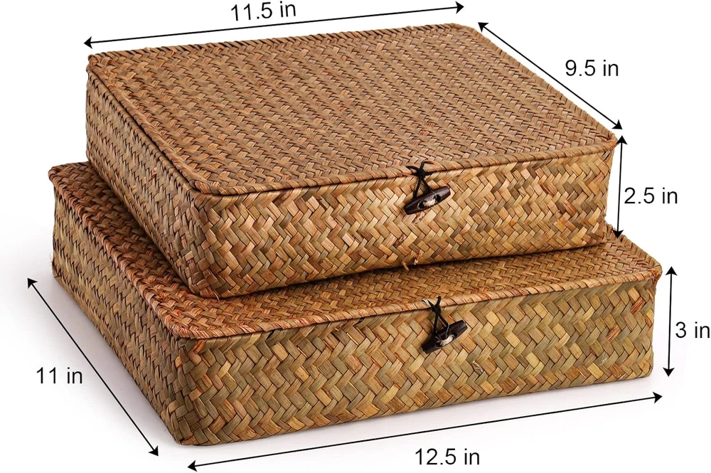 Store New Arrivals Add to Favorite View Feedback Contact 2 Pack Seagrass Baskets with Lid, Wicker Storage Baskets Flat Rattan Storage Bins, Woven Organizer Baskets for Shelf, Closet, Bedroom Description Item model number Seagrass Basket Style Rustic Country of Origin China With Lid Yes Number of Pieces 2 Room Type All Finish Natural Product Dimensions 3"D x 11"W x 3"H Material Sea Grass Handle Material Seagrass Finish Type Natural Closure Type Buckle Batteries Required? No Item Weight 1.28 pounds Special Features Lid, Stackable Special Feature Lid, Stackable Part Number Seagrass Basket Color Natural Shape Rectangular Batteries Included? No Recommended Uses For Product Storage Elsjoy 2 pack seagrass storage baskets come in 2 sizes, Large 12.5"L x 11"W x 3"H, Small 11.5"L x 9.5"W x 2.5"H. Natural seaweed baskets eliminate clutter, also add a touch of elegance and natural scent to your home. ๐๐๐ญ๐ฎ๐ซ๐๐ฅ ๐๐๐๐ ๐ซ๐๐ฌ๐ฌ: Storage basket set is made from 100% natural seagrass, ensuring years of durability and sustainability. Each basket comes with a light grass fragrance and subtle color variations that make it unique. ๐๐จ๐ฅ๐ข๐ ๐๐จ๐ง๐ฌ๐ญ๐ซ๐ฎ๐๐ญ๐ข๐จ๐ง: Wicker basket has a flat rectangular shape which makes it easy to place in any corner or space around your home. It is supported by a metal frame for solid hold and durability. ๐๐๐ฌ๐ฒ ๐ญ๐จ ๐๐ฌ๐: Stackable, portable & lidded. Moves easily from one room to another. The smaller basket can be stacked inside or on top of the big one, or they can be used individually. The lid can be easily opened by untying the knot. ๐๐๐ซ๐ฌ๐๐ญ๐ข๐ฅ๐: Woven basket set is ideal for storing CDs, books, remote controls, snacks, and anything else in the living room. Suitable for keeping clothes, skin care products, magazines in the bedroom, toiletries, towels in the bathroom. ๐๐จ๐ญ๐: ๐๐๐ญ๐ฎ๐ซ๐๐ฅ ๐ฌ๐๐๐ ๐ซ๐๐ฌ๐ฌ ๐ฏ๐๐ซ๐ข๐๐ฌ ๐ข๐ง ๐๐จ๐ฅ๐จ๐ซ ๐ญ๐จ๐ง๐, ๐๐ซ๐จ๐ฆ ๐ฅ๐ข๐ ๐ก๐ญ ๐ญ๐จ ๐๐๐ซ๐ค, ๐ฌ๐จ ๐ญ๐ก๐ ๐๐๐ฌ๐ค๐๐ญ ๐ฆ๐๐ฒ ๐๐ฉ๐ฉ๐๐๐ซ ๐ฌ๐ฅ๐ข๐ ๐ก๐ญ๐ฅ๐ฒ ๐๐ข๐๐๐๐ซ๐๐ง๐ญ ๐๐ซ๐จ๐ฆ ๐ญ๐ก๐ ๐ฉ๐ข๐๐ญ๐ฎ๐ซ๐. Product Description Elsjoy Set of 2 Seagrass Woven Baskets They are handwoven by artisans and make the perfect rustic home decor piece. Woven storage bins are made from 100% seagrass. These woven seaweed baskets not only provide storage functionality, but also offer a natural scent. Seagrass baskets with lids are the perfect way to organize and keep your important items dust-free. You will enjoy the rustic elegance and warmth they bring to your home. Set of large and small baskets for organizing snacks, skin-care products, toys, books, clothes, toiletries, etc. You can easily stack them up and use them in a bedroom, living room, study room, bathroom, office, closets, and cabinets. Easy to Use Toggle Accented with a wood button on the toggle closure, which gives it a natural touch. Stackable Stack them on the counter, inside cabinets, and in closets to maximize storage space. Metal It is supported by a metal bracket inside that prevents it from deforming. Versatile Toiletries Clothes Small Items Get your home organized with seagrass baskets Seagrass baskets are made with fine craftsmanship for easy storage. The container is lightweight and convenient to use every day. Simple wiping down with a damp towel will keep them looking good. You don't have to worry about polluting the environment either, since they quickly biodegrade. ABOUT US We offer the best prices around on high quality products. Our E-store includes media such as books, movies, music and games while offering electronics, toys, sporting apparel, clothing, tools, general home, garden items and more. SHIPPING We are always working hard to ensure your package arrives as soon as possible. Please understand that some factors like weather, high postal traffic, and the performance of shipping companies are outside of our control. We offer free shipping to the lower 48 states and ship within 2 business days of payment, usually sooner. We do not accept P.O. Boxes. Please provide a physical address. For shipping outside of the continental USA, we only use eBay's Global Shipping Program.The item is shipped to KY and then sent to the rest of the world. International customers are responsible for all duties and taxes. Continue to check out in order to calculate costs for shipping the item to your country. Messages regarding eBay's Global Shipping Program MUST be directed at eBay EXCLUSIVELY. RETURNS We offer a 30-Day Return Policy on items which you are not completely satisfied with. You have the option for a full-refund or an exchange of the item. No returns are available on items shipped outside of the USA. PAYMENT We accept PayPal. CONTACT US This page content is yet to come Please ad us to your favorite seller and visit again later Thank You CUSTOMER SATISFACTION We try our very best to make sure every customer is completely satisfied. If there's a problem, message us! We're happy to help. WE ACCEPT Copyright ยฉ 2021 AutoDS. | All Rights Reserved