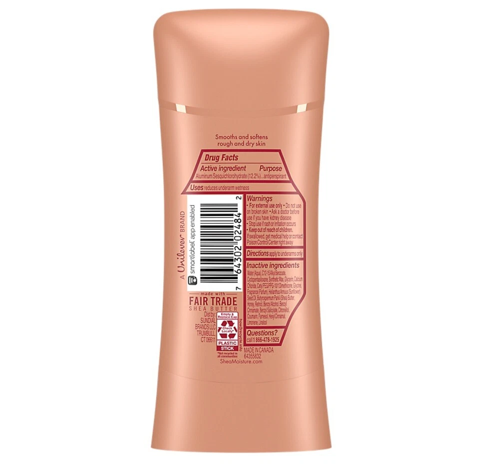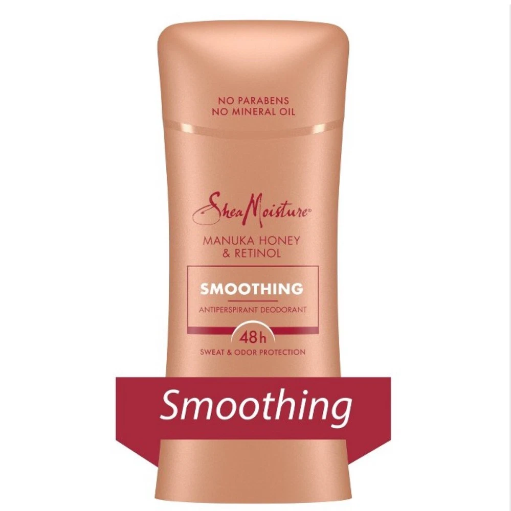 Finally, an antiperspirant deodorant designed specifically for your Rich Melanin skin needs. We want to celebrate your self-determination and confidence by delivering uncompromising protection and freshness that you've been waiting for. Get the protection your Rich Melanin skin deserves with this Manuka Honey & Retinol Smoothing Antiperspirant Deodorant stick that is formulated to help smooth rough and dry skin while providing reliable 48 hour sweat & odor protection throughout the day. Enjoy the scent of delicate florals with sweet honey suckle. Rich Melanin skin with its unique biological differences contains 40% less ceramides, making it prone to skin concerns such as dryness, hyperpigmentation, and rough, bumpy patches. SheaMoisture’s first-ever antiperspirant deodorant range was designed to meet all the needs of Rich Melanin skin. Featuring 48H sweat and odor protection, along with a generous amount of skin benefits like moisturizing, evening out skin tone, and soothing your skin. When searching for the best women’s deodorant, look for SheaMoisture Smoothing Antiperspirant Deodorant, with its non-irritating formula that’s packed with skin loving, natural ingredients like Fair Trade Shea Butter, Manuka Honey, and Retinol. Containing only high-quality ingredients and no parabens or mineral oil, this easy glide formula goes on as smooth as butter and provides all-day odor and sweat control with the soothing scent of fresh florals with sweet honeysuckle. Even better—it’s Black Dermatologist Approved so you know you can feel confident it’s good for your skin. Our story: SheaMoisture is the legacy of Sofi Tucker, a pioneering mother of four and entrepreneur, who sold shea butter, African black soap, and homemade beauty preparations in Sierra Leone in 1912. We honor her vision by continuing to formulate with raw shea butter handcrafted by women in Africa. With every purchase, you show support of our mission to reinvest back in our communities. • 48H PROTECTION + SKIN BENEFITS: Our first-ever antiperspirant deodorant range for Rich Melanin skin gives you 48H odor and sweat protection while making your skin smoother. • SMOOTHING FORMULA: Made with Manuka Honey and Retinol to help smooth and soften rough, dry skin with daily use. • BLACK DERMATOLOGIST APPROVED: Designed for Rich Melanin skin, this women’s antiperspirant deodorant has the seal of approval from Black dermatologists. • NATURAL SCENT: Delight your senses throughout the day with the delicate scent of fresh florals and sweet honeysuckle. • NON-IRRITATING, SMOOTH GLIDE FORMULA: Packed with skin loving, natural ingredients like Fair Trade Shea Butter, Manuka Honey and Retinol that easily glide on your skin. • OUR PROMISE: This smoothing antiperspirant deodorant contains high-quality ingredients and no parabens or mineral oil.