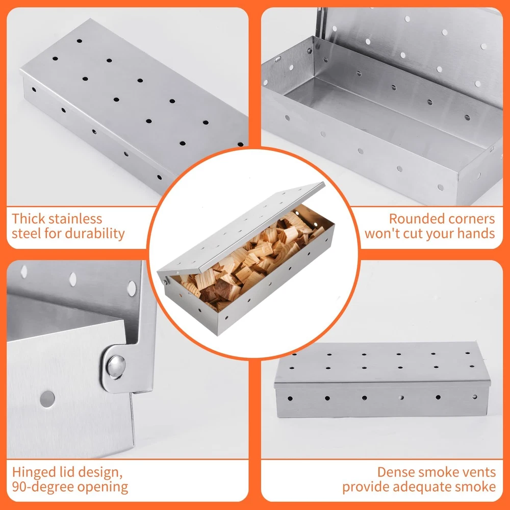 Functional Use: Our smoker box leaves 28 dense circular vents that provide ample smoke to evenly smoke your food and infuse your barbecue with just the right amount of smoky flavor Unique Design: Our smoker box features a unique hinged lid design with a 90-degree opening so you can easily and safely add or remove wood chips High Quality Material: Our smoker box is made of thick stainless steel material to ensure absolute safety when in contact with food. Rustproof and easy to clean. The corners of the smoker box are rounded and will not cut your hands Widely Used: Whether you have a gas grill or a charcoal grill, our smoker box is a perfect fit. Give your meat, seafood, vegetables and other delicious foods a mouthwatering smoky flavor BBQ Accessory: As a practical tool, you can give this smoker box as a nice gift to your friends, neighbors or others, and the recipients will be glad to get it