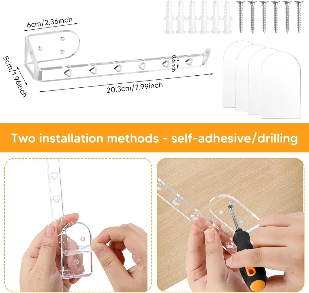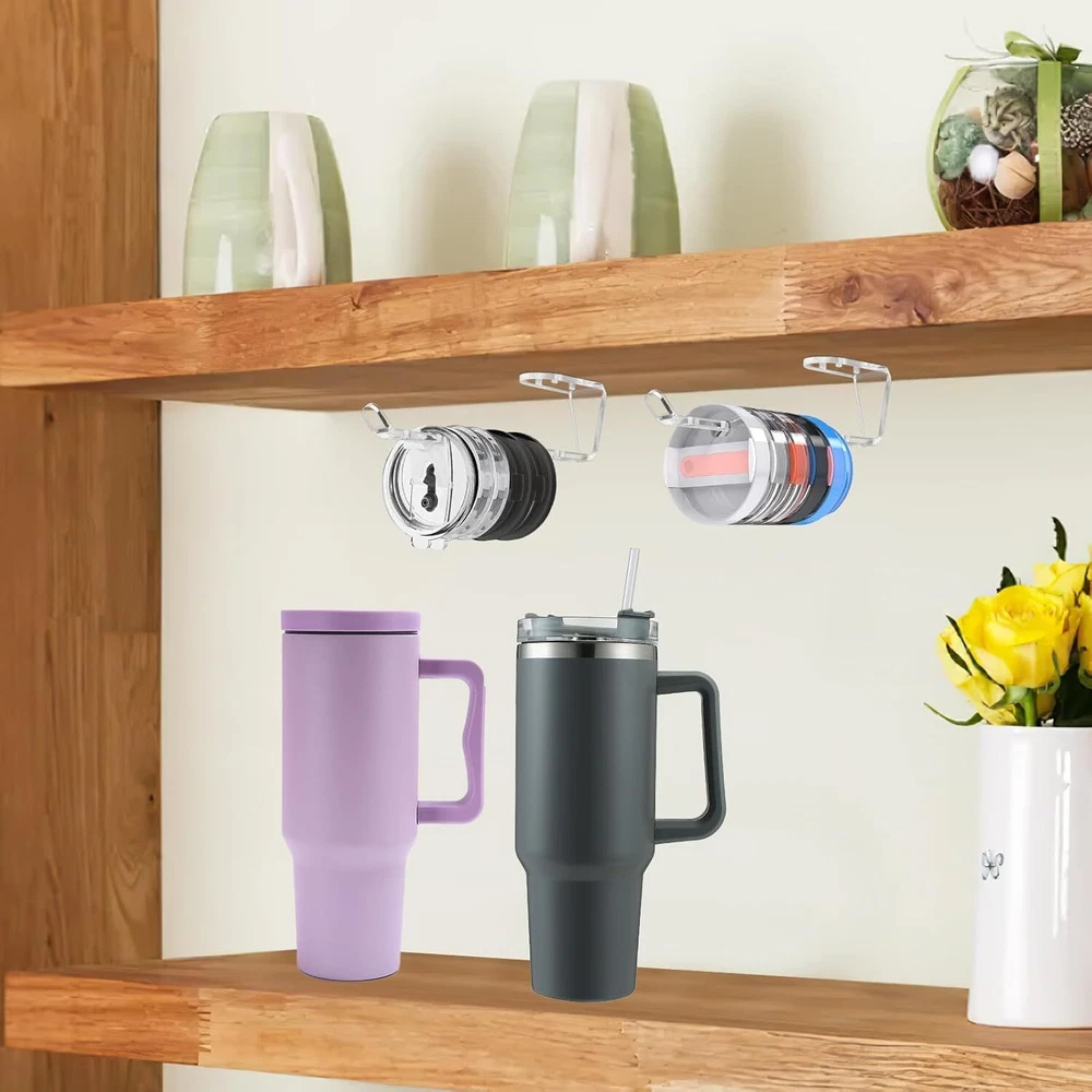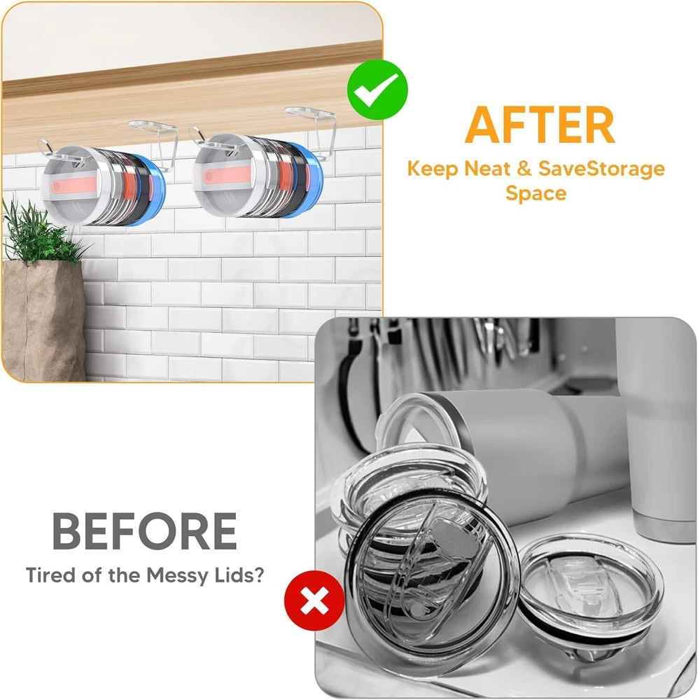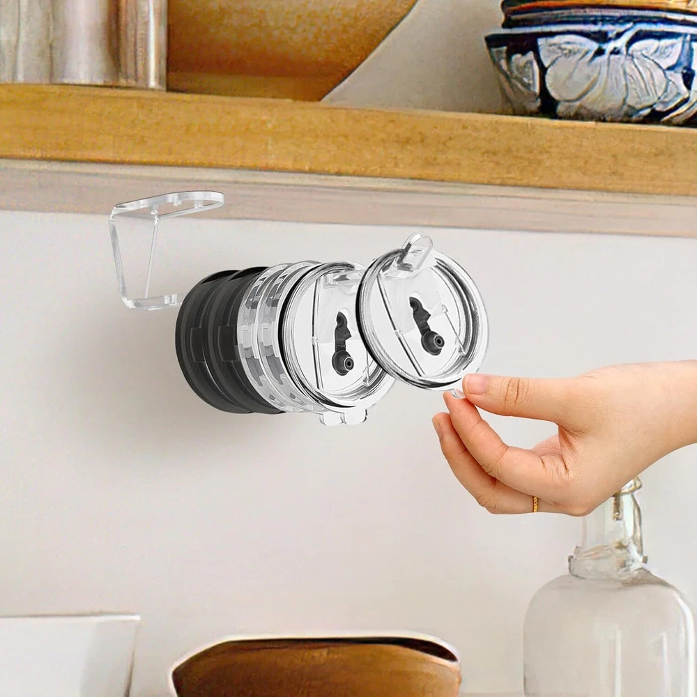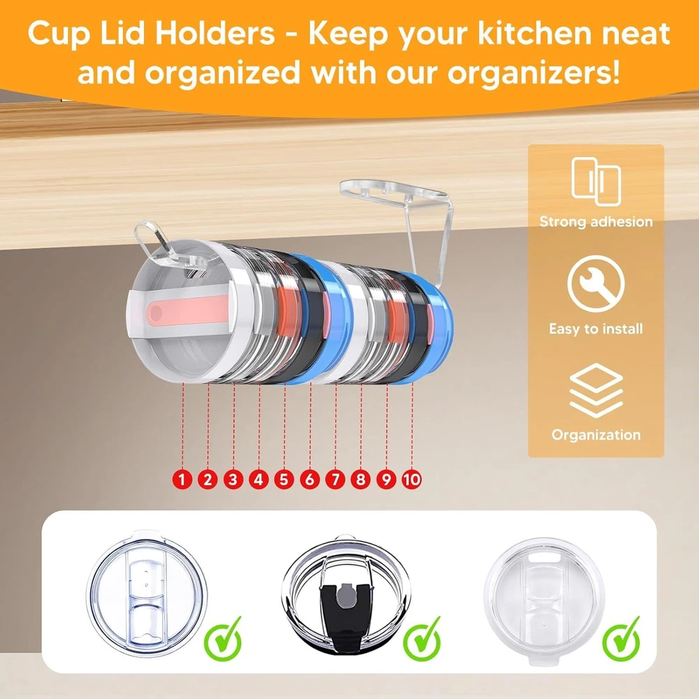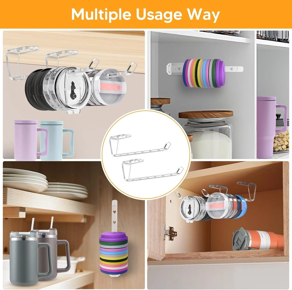 2 Pack Tumbler Lid Organizer, Acrylic Detachable Vertical Storage Up to 10 Cup Lid and Self-Adhesive or Drilling Tumbler Lid Hook for Kitchen, Closet, Narrow Edge Space-Saving Product Details Manufacturer: DARCKLE Part Number: Horizontal Tumbler Lid Organizer Item Weight: 4.6 ounces Product Dimensions: 8 x 1 x 1 inches Country of Origin: China Item model number: Horizontal Tumbler Lid Organizer Mounting Type: Tabletop Special Features: Portable Included Components: Hardware Batteries Required?: No Brand: DARCKLE Mounting Type: Tabletop Special Feature: Portable Included Components: Hardware Item dimensions L x W x H: 8 x 1 x 1 inches Universal for under-cabinet use: Cleverly tailored to fit any size glass lid. Its horizontal stacking design under a cabinet or shelf optimizes space, allowing easy organization and storage of lids of various sizes.