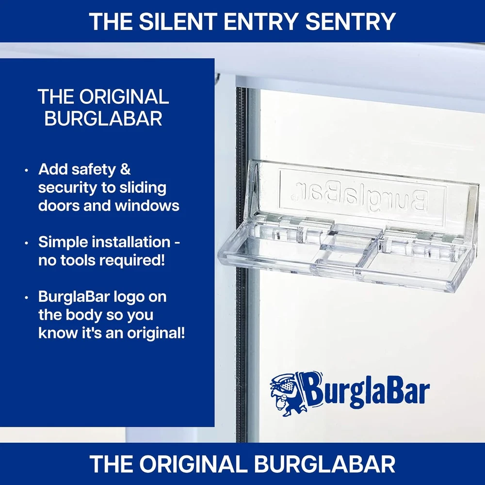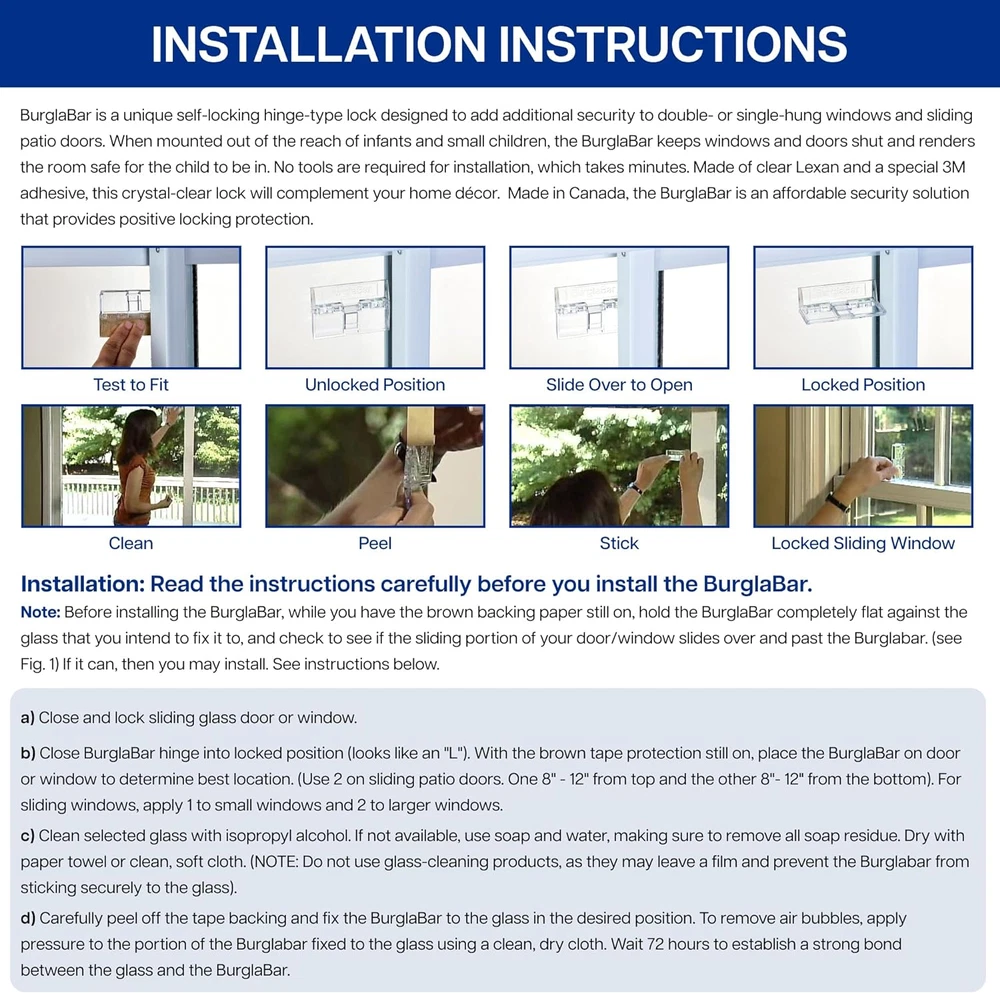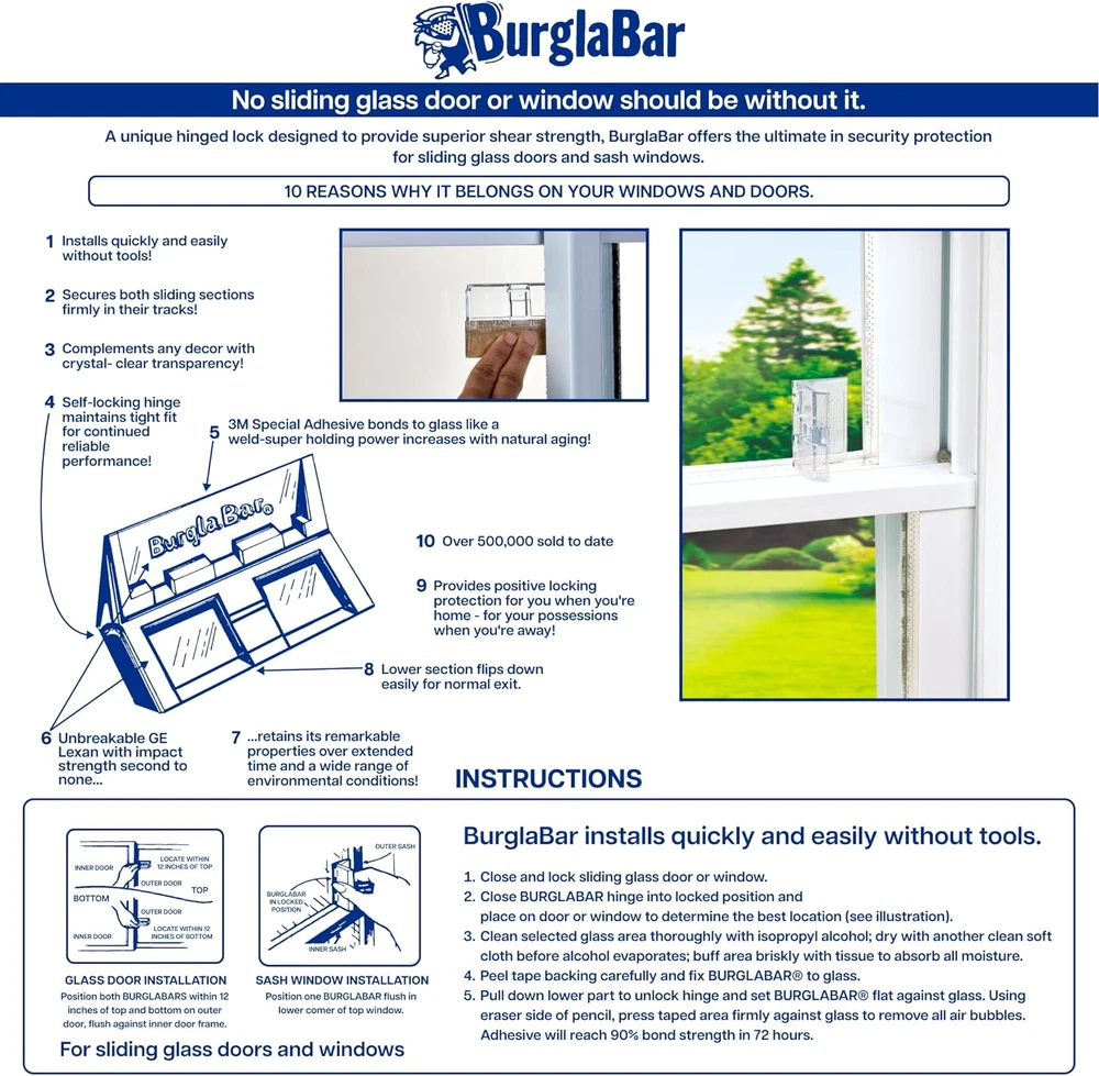 Enhance Your Home Security: Instantly add additional security to patio doors and windows with this unique hinge-style sliding glass door lock; Not only does this door security device keep your space safe, it can also be used to childproof your home Easy To Install: The Burglabar patio door lock is simple to install - no tools required - and its crystal-clear design easily blends in; This versatile child-proof door lock can be used as a sliding door security bar or a sliding window lock Adjusts To Your Door: Our sliding glass door security bar can easily be adjusted to fit different doors sizes; Secure your home with a Burglabar security bar for sliding glass doors and windows and enjoy added peace of mind Sturdy & Reliable: These durable security door locks come equipped with strong adhesive that adheres to glass like a weld for maximum strength; When properly applied, our sliding door and window security bars provide additional safety and security 20 Years of Experience: The creators of the original Addalock and Burglabar, Rishon Enterprises Inc. is dedicated to promoting safety, security, and privacy; Protect your spaces, whether at home or away, with our safety locks for doors Product Description Unlocked Position Open Sliding Doors/Windows Locked Position
