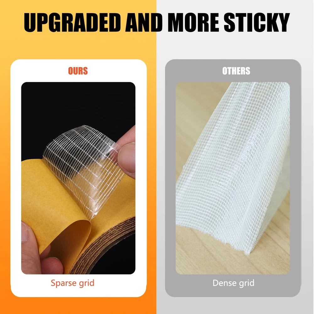 [Superior Quality]: Our fiberglass grip tape is made of a high-quality fiberglass weave that is uniquely lightweight and less dense than other tapes, enhancing both adhesion and flexibility [Versatile Application]: Our double sided duck tape sticks firmly to various surfaces like carpets, refrigerators, picture frames, and home accessories. Very suitable for use on different surfaces such as hardwood, tile, plastic, and concrete. Additionally, it's ideal for adjusting women's garments and securely attaching clothes to the skin or underwear [Easy to Use]: The universal double sided tape is designed for easy application, allowing for fast and efficient bonding without the mess of traditional adhesives. It can be easily cut to the desired length with scissors [Professional Grade]: Professionally trusted, our fiberglass double sided mesh tape is engineered for strength and reliability. This fabric heavy duty tape is the preferred solution for contractors, builders, and DIY enthusiasts alike [Package Includes]: You'll get 2 rolls of double sided fiberglass tape set (1 inch * 33 ft + 2 inch * 33 ft). This enables you to securely attach items without harming walls or surfaces, making it suitable for both home and office applications