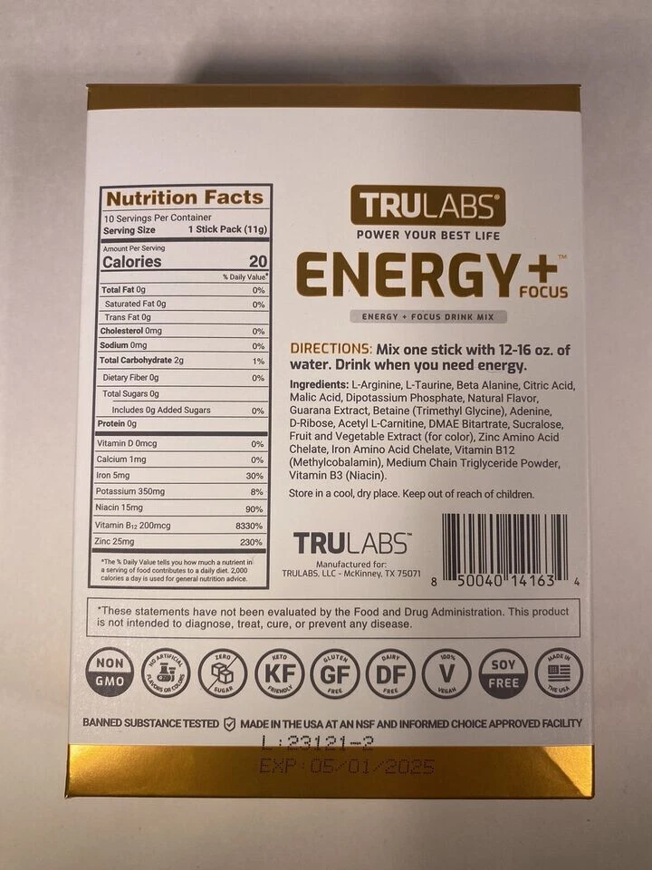 When to Take:After Meal, After Workout, Before WorkoutNumber of Pills:10Supply:Up to 1 MonthType of Diet:Bodybuilding, Fitness, VeganVolume:2.03 ozDosage:read the labelNutrition Facts Label:YesFeatures:Soy-Free, Sugar-Free, Dairy Free, Keto, Non GMO, VeganExpiration Date:05/2025Item Weight:57 gFlavor:Orange, PineappleMPN:NAUPC:0850040141269Type:DrinkCountry/Region of Manufacture:United StatesDepartment:Men, Unisex, WomenBrand:TRULABSMain Purpose:Endurance/Energygtin13:0850040141269Ingredients:see labelActive Ingredients:Acetyl-L-Carnitine, CaffeineFormulation:Powder