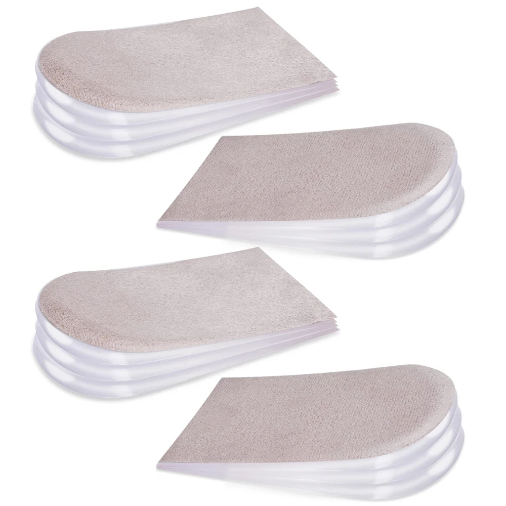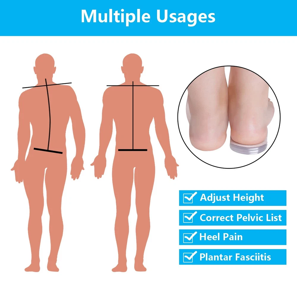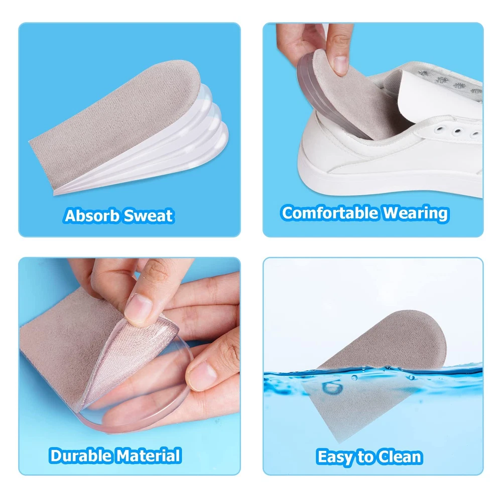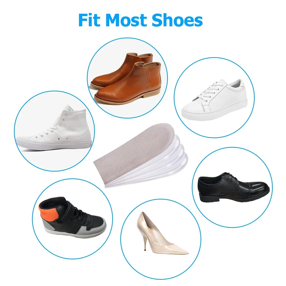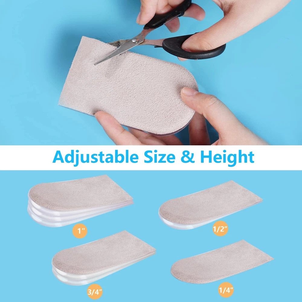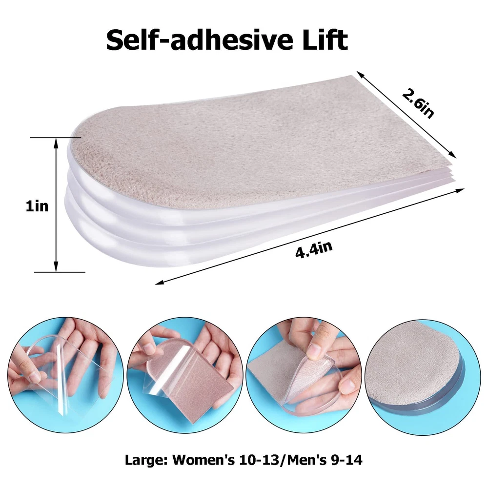 2 Pairs Adjustable Heel lifts Plantar Fasciitis Heel Pads 1/4" to 1" Gel Heel Lift Inserts Increase Insoles for Leg Length Discrepancy Shoes Too Big Upgrade and Widen Height (4 Layers Per Pair) Features: --Gel heel pads have advantages of wide applicable temperature range, not deforming and long service life. --These layers can be used independently or in combination to meet all kinds of demands. --Each shoe lift for the heel relieves the pains of your feet while adding height. --Self-adhesive design and Each layer has primer, strong adhesion, washable and reusable Specifications: Material:Gel, flannelette Item Weight: 0.35 Ounces Color: Beige, clear Quantity: 16pcs Package Includes: 16 x Heel Lifts Note: 1. The size may exist little difference due to hand manual measurement. 2. Due to brightness of your monitor and light brightness, the real color of the item may slightly different from the pictures shown on. UPGRADED HEEL LIFTS FOR SHOES MATERIAL: The shoe lifts are made of durable gel and soft flannelette fabric. Gel heel pads have advantages of wide applicable temperature range, not deforming and long service life. Flannelette fabric with non-slip design enhance comfortable feelings ADJUSTABLE HEEL LIFT DESIGN: Adding layers can adjust heel lifts for achilles tendonitis to suitable height for users. These layers can be used independently or in combination to meet all kinds of demands.Each shoe lift for the heel relieves the pains of your feet while adding height (4 removable 1/4" thick layers) DURABLE & REUSABLE HEEL WEDGE INSERTS: High quality gel construction for heel support. Flexible but firm, easy to wash, and durable so you can wash and reuse them multiple times. Support for extended walking, running, hiking, dancing, or any other activity. ing, running, hiking, dancing, or any other activity FIT MOST SHOES: This Heel Lift Inserts are self-sticky. Wearing them, they don't slip, which supports your heel. They fit well in high heel shoes, dress shoes, boots and other kinds of shoes.【Women's 10-13|Men's 9-14】 FRIENDLY SERVICE: Insist on high quality products to ensure your 100% satisfaction, we will provide you with satisfactory after-sales service when there is any problem happened.